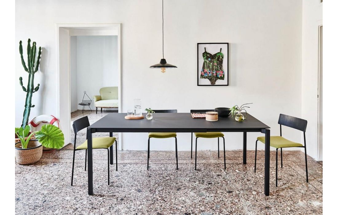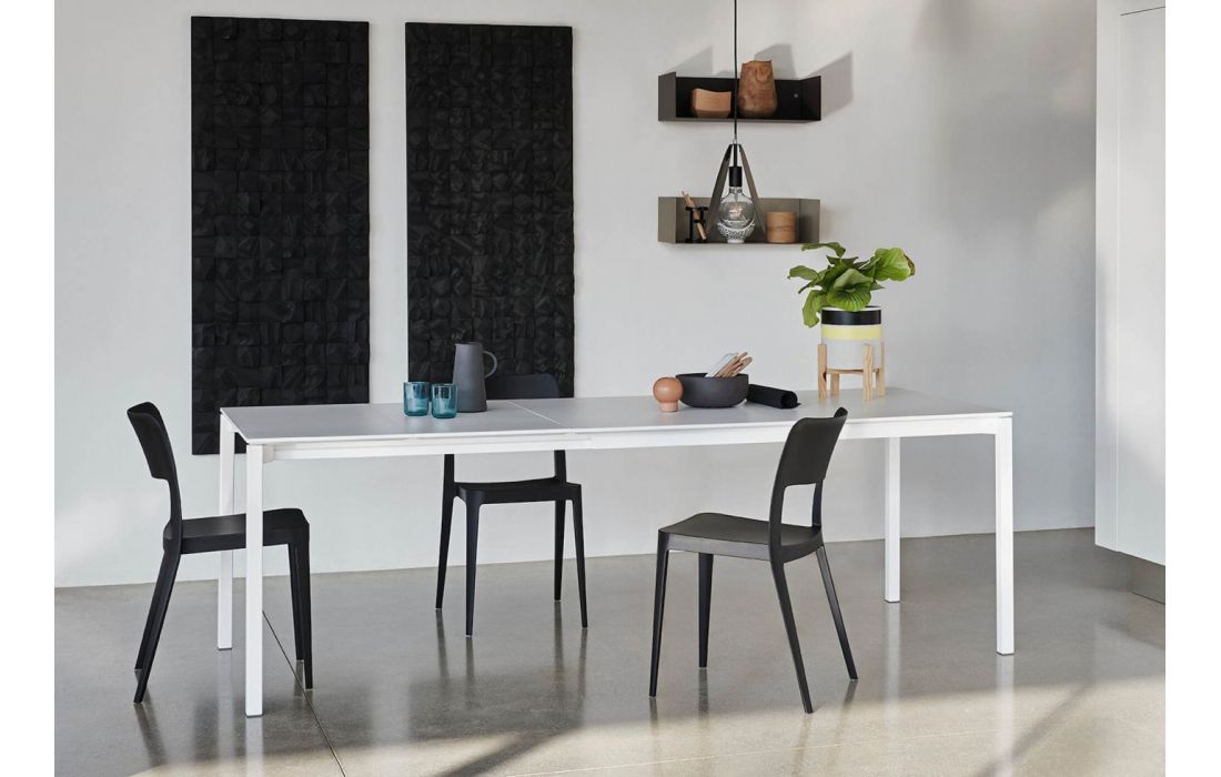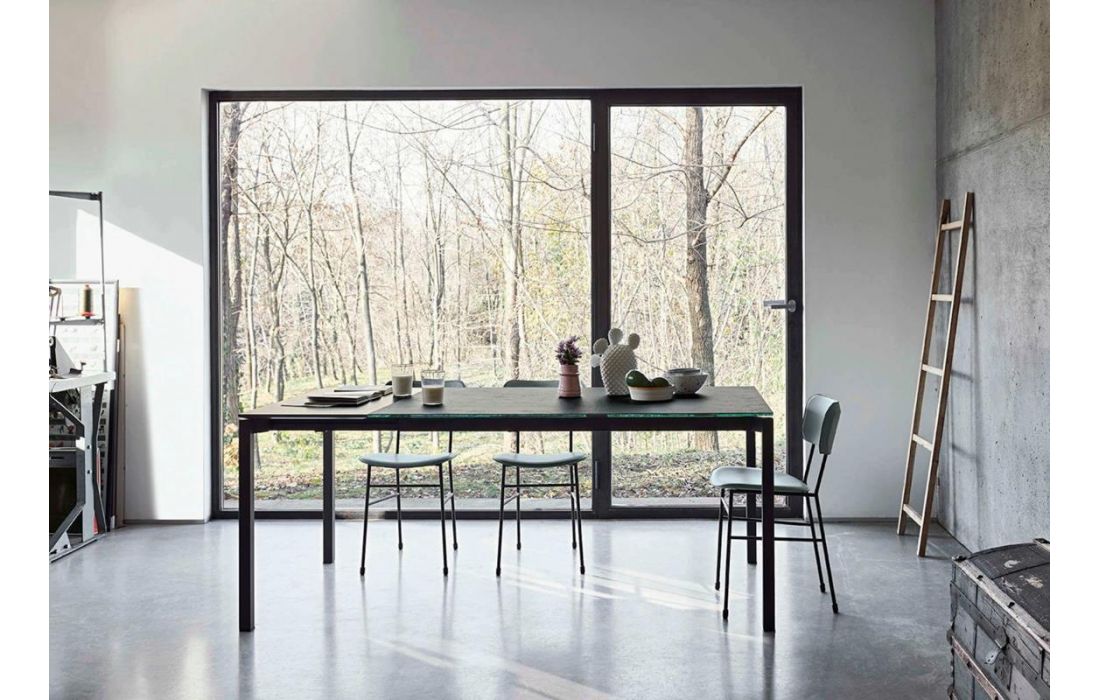 Extendable dining table with four metal legs and glass or ceramic top.