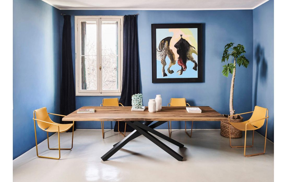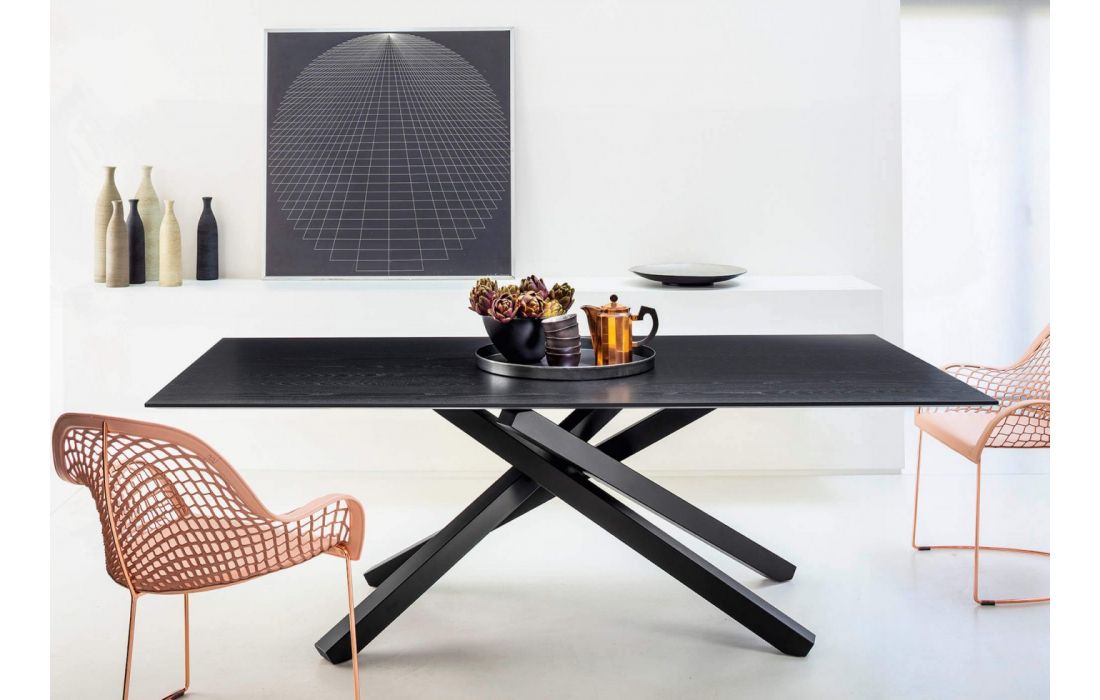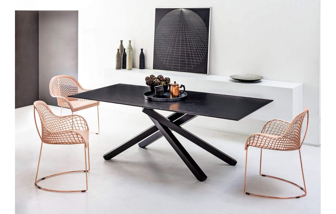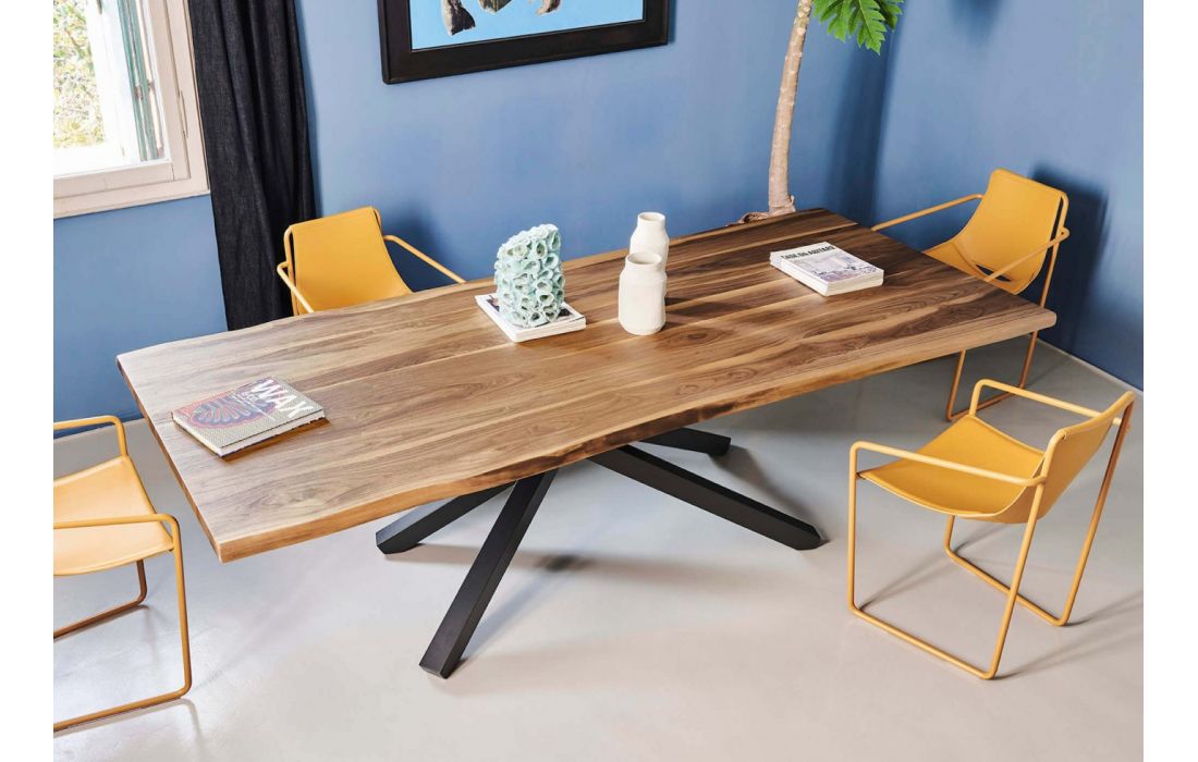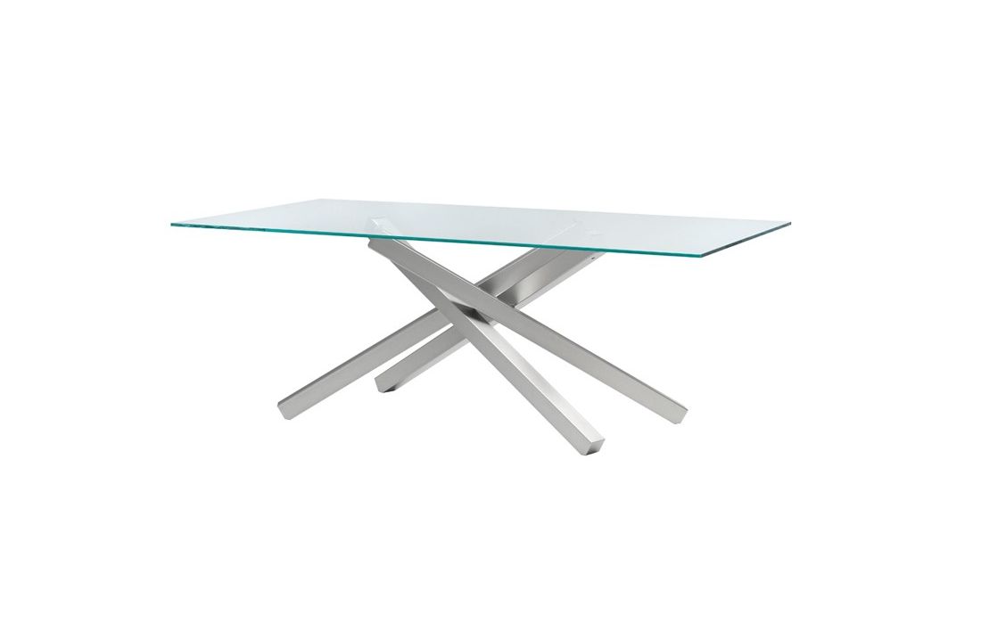 Dining table with metal base and top in glass, solid wood or veneered wood