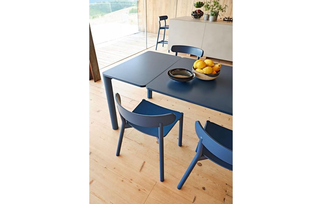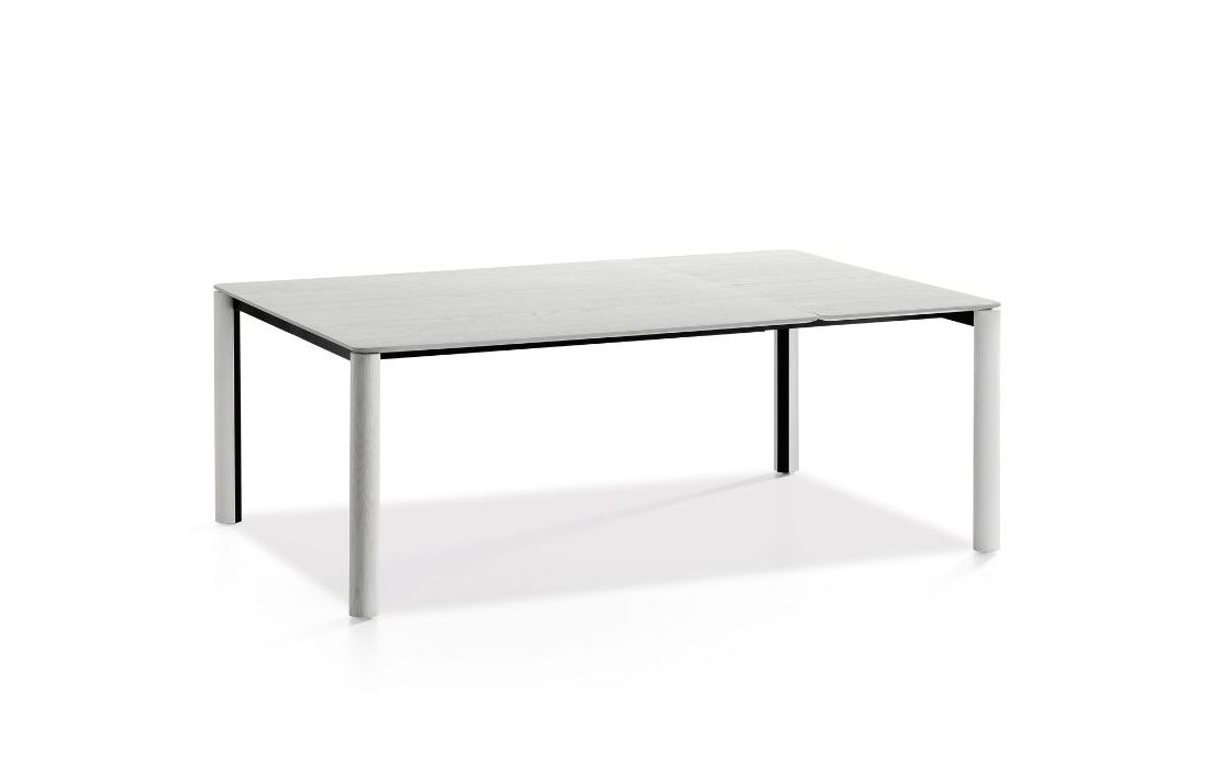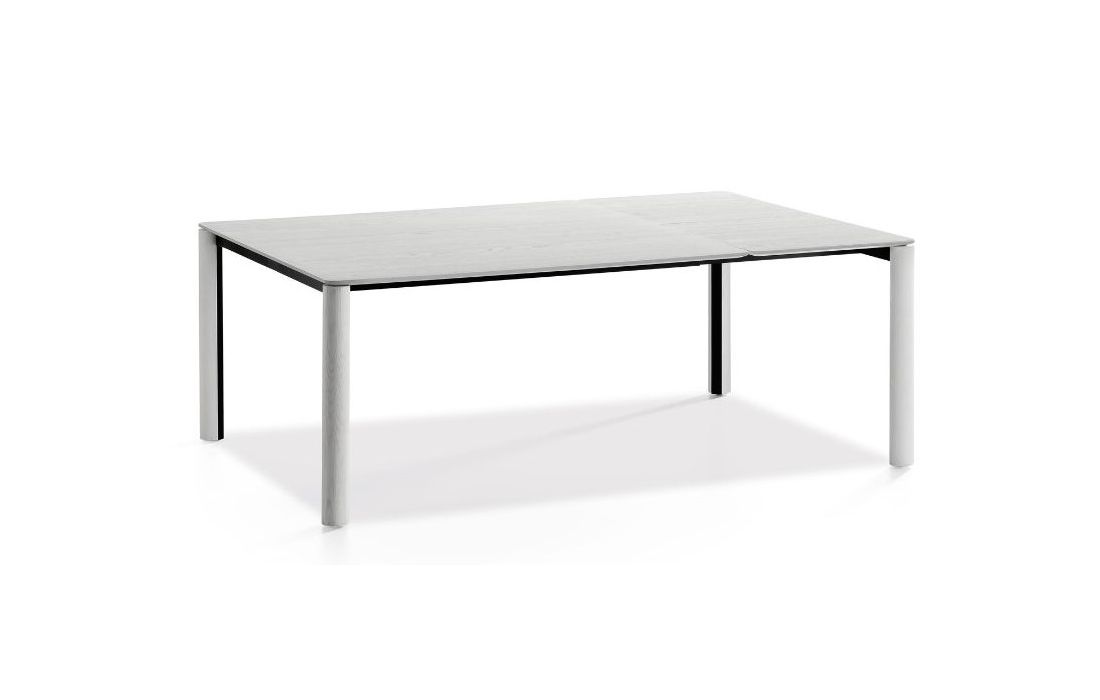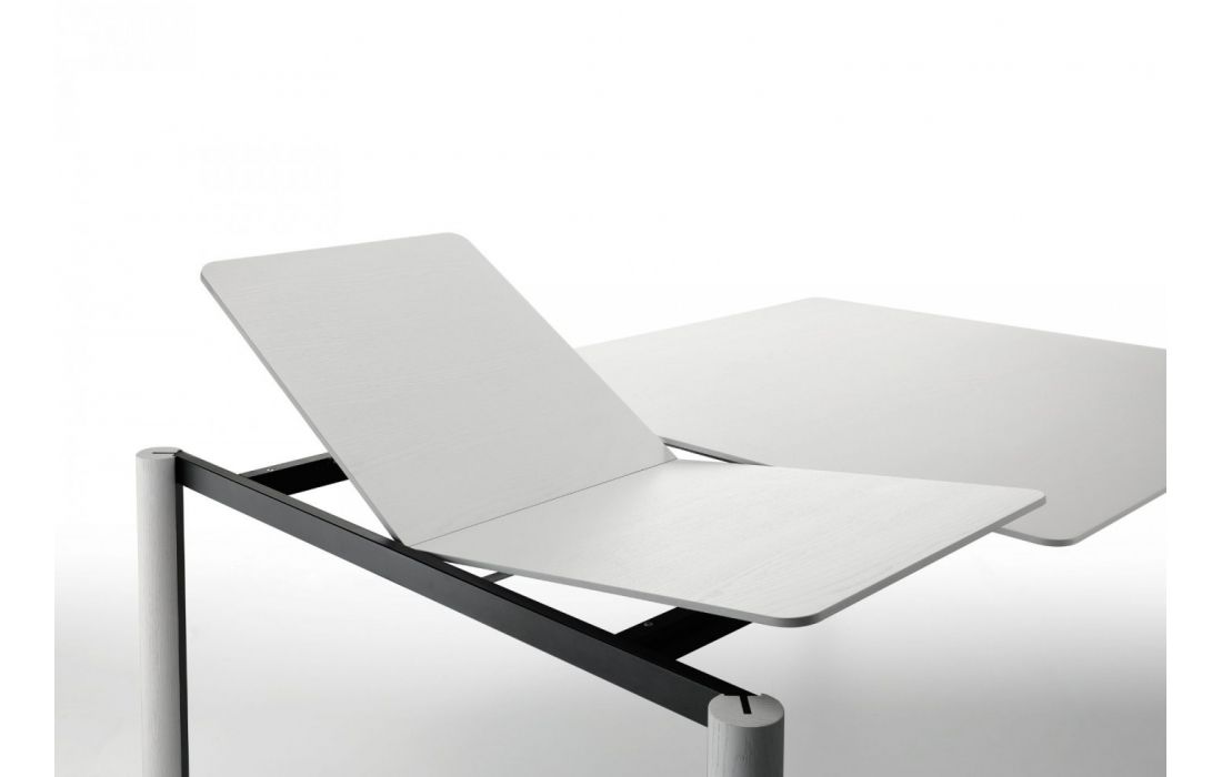 Extendable dining table with four legs in stained ash wood, with a lacquered metal core and metal structure. Top in veneered or laminated wood.