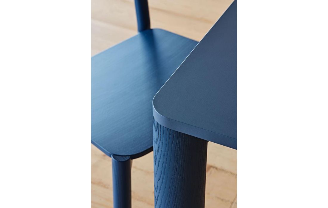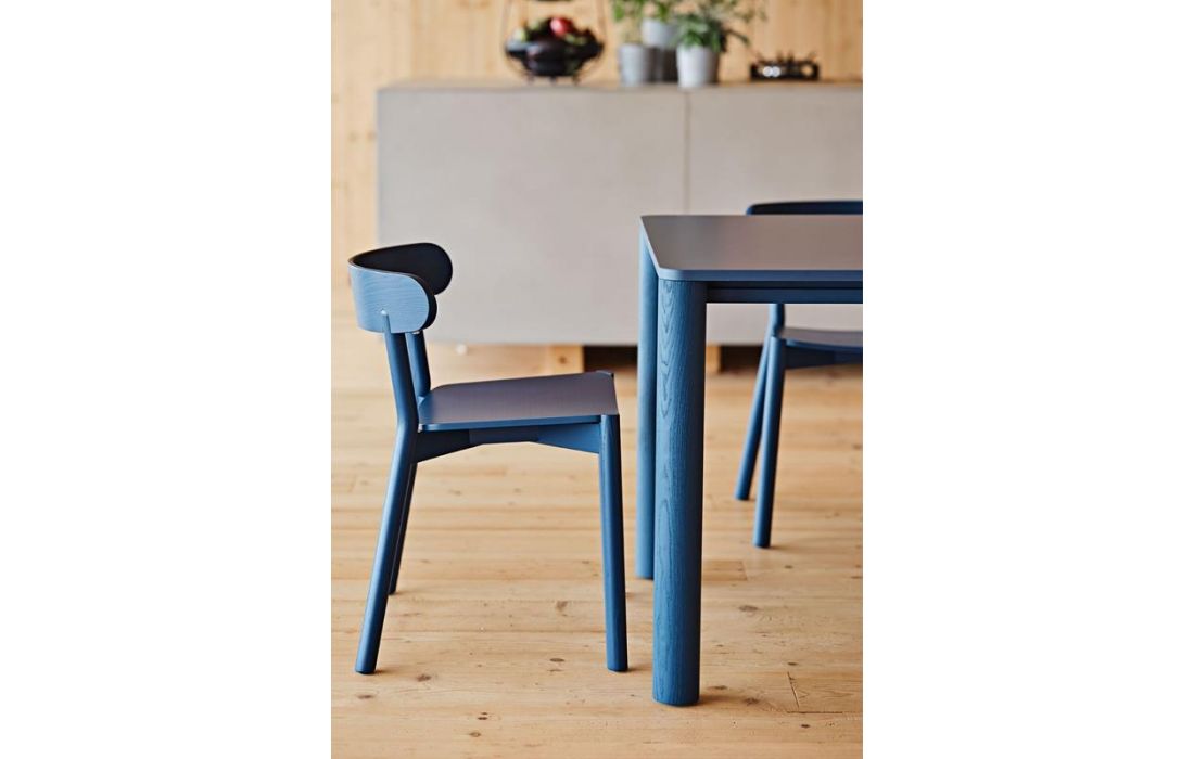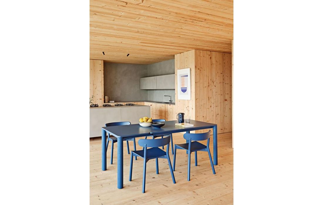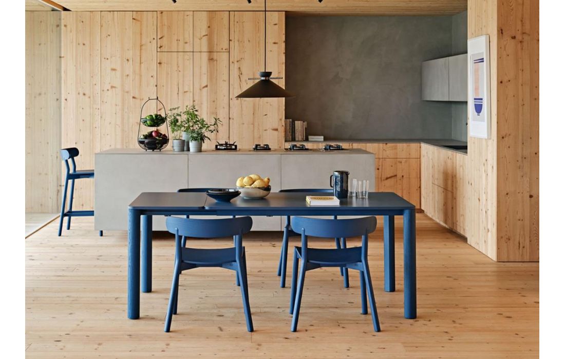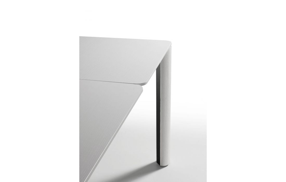 Extendable dining table with four legs in stained ash wood, with a lacquered metal core and metal structure. Top in veneered or laminated wood.