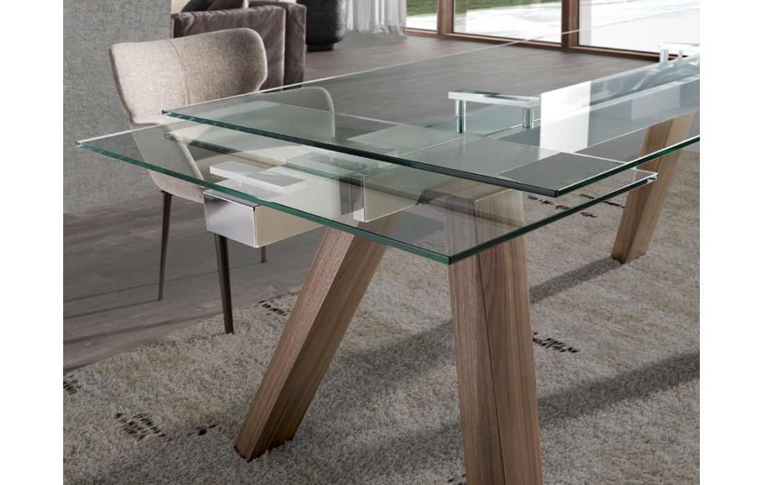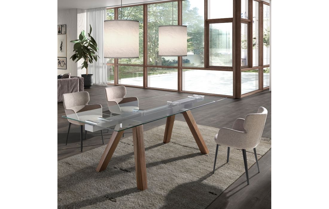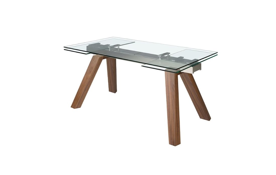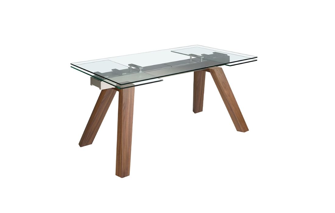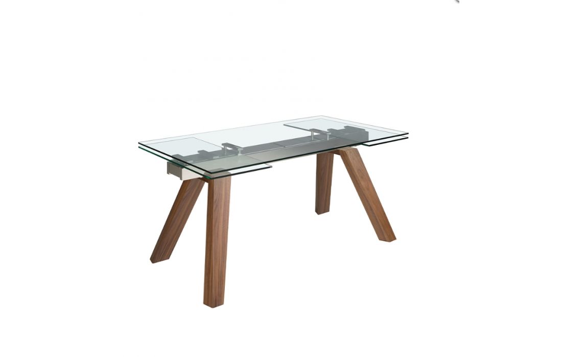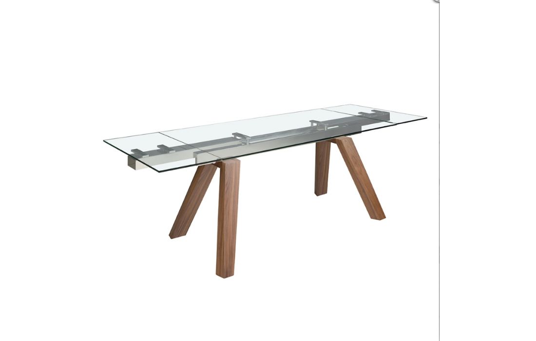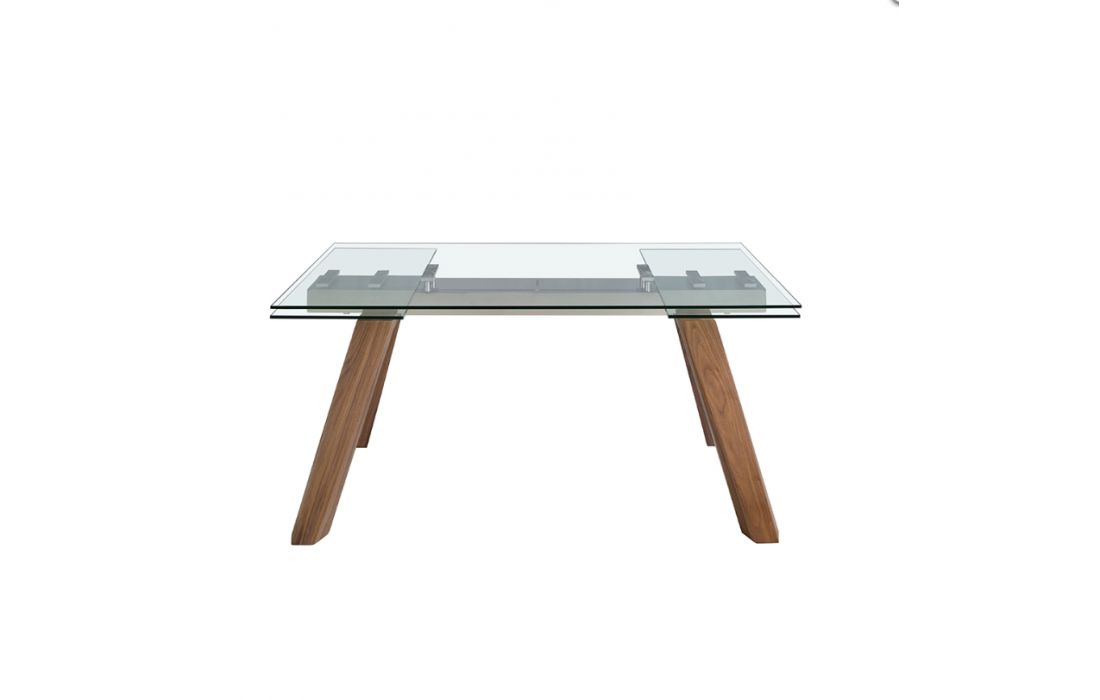 Rectangular extendable dining table with tempered glass top and natural walnut veneered wood legsRecipient :