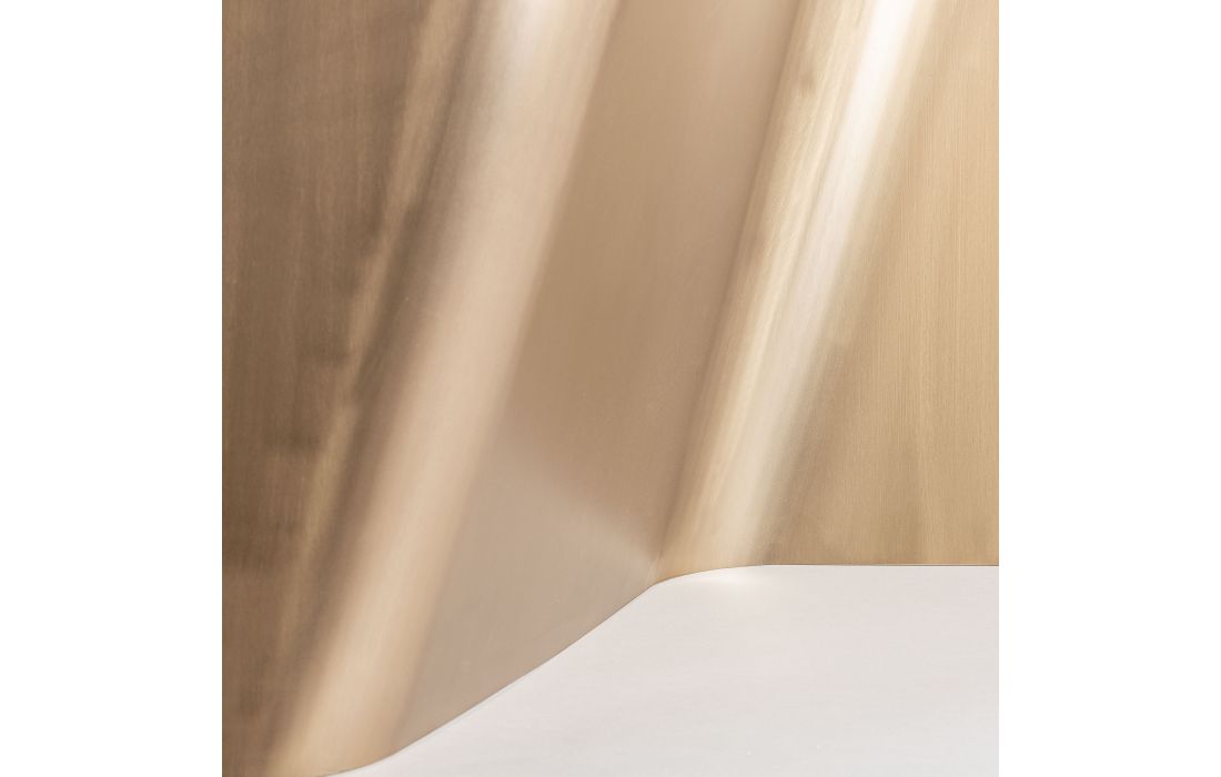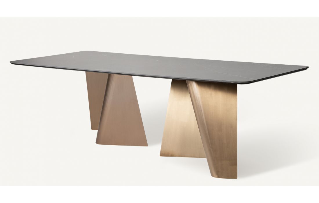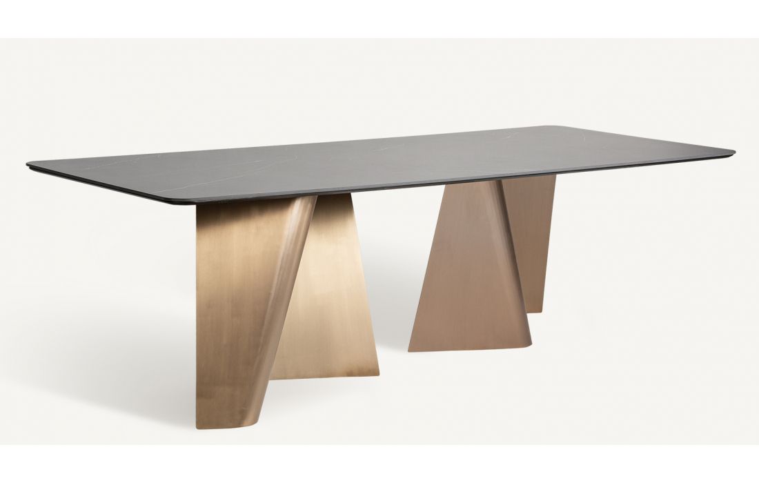 Dining table with golden steel structure and black porcelain top