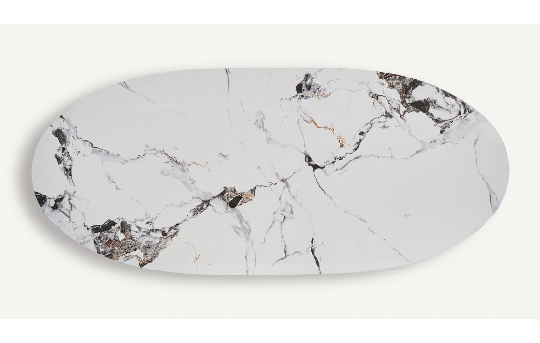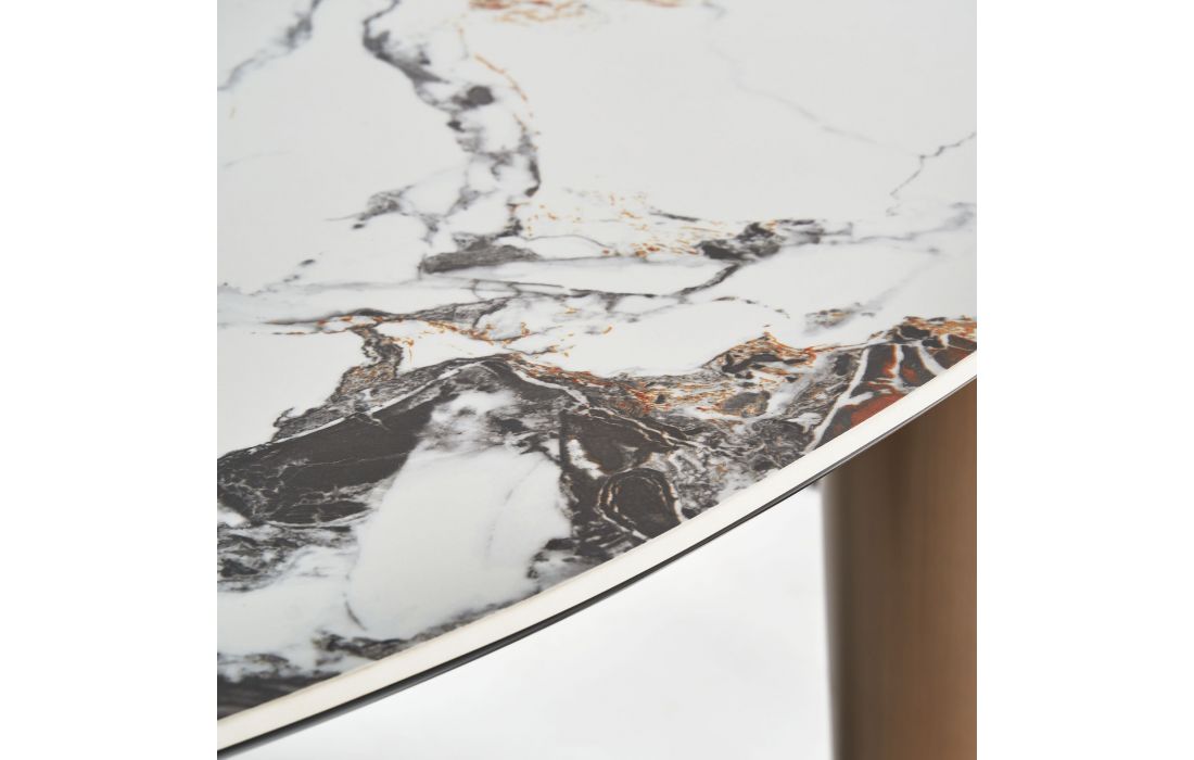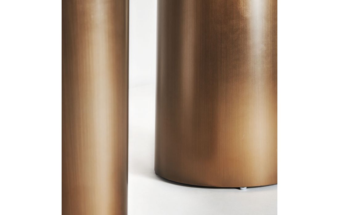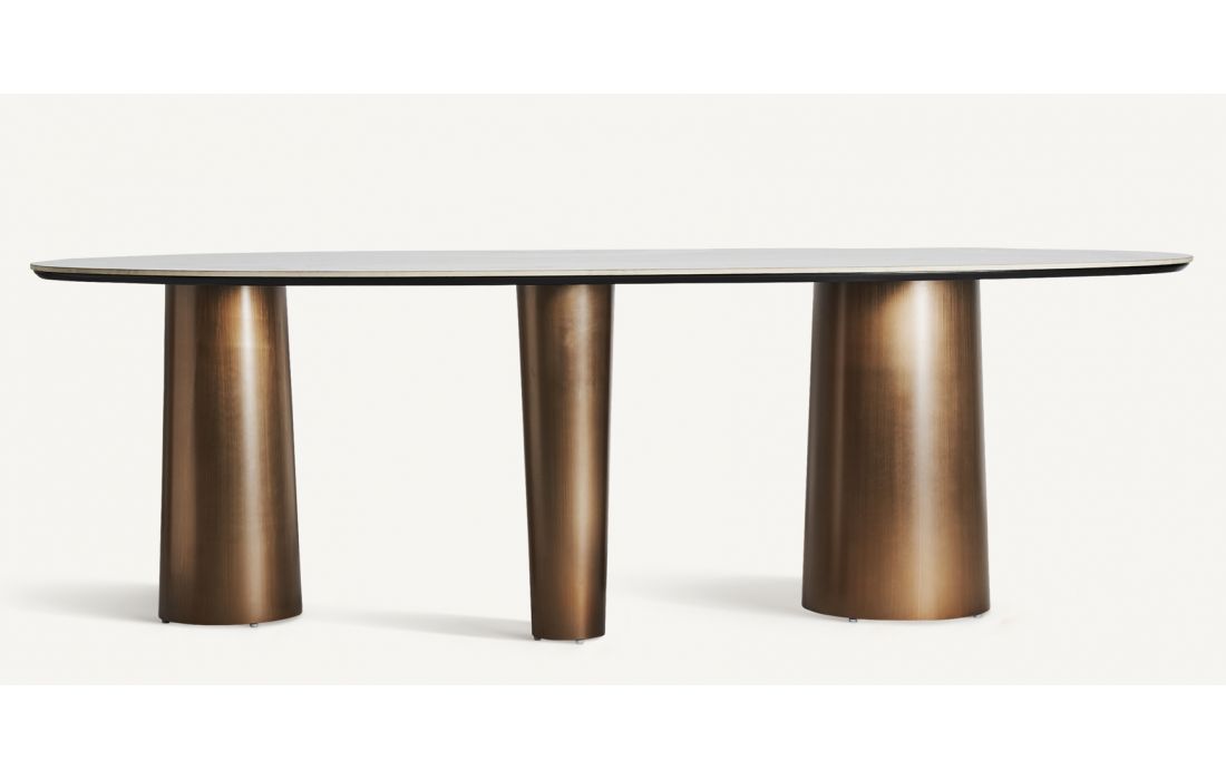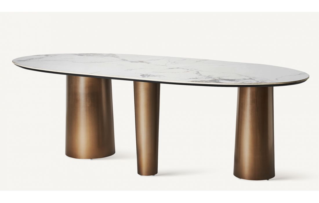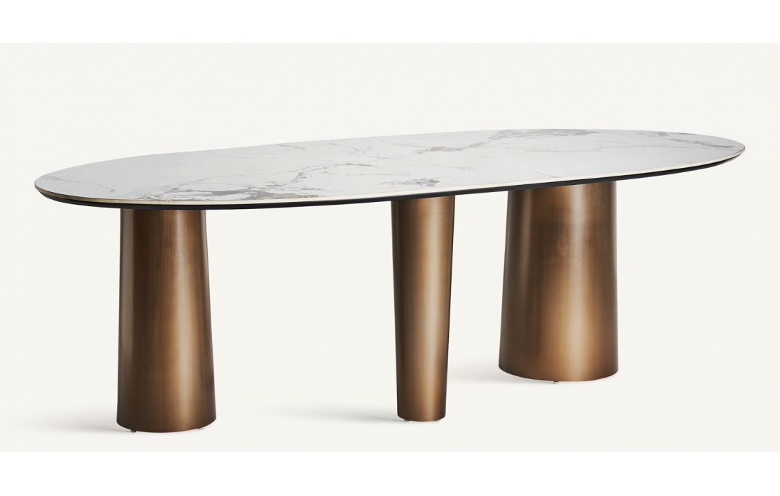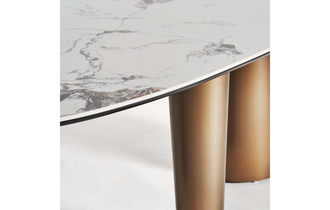 Dining table with golden steel structure and synthetic marble top. Art deco style.
