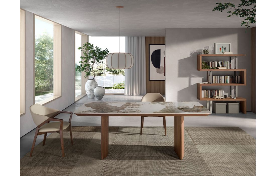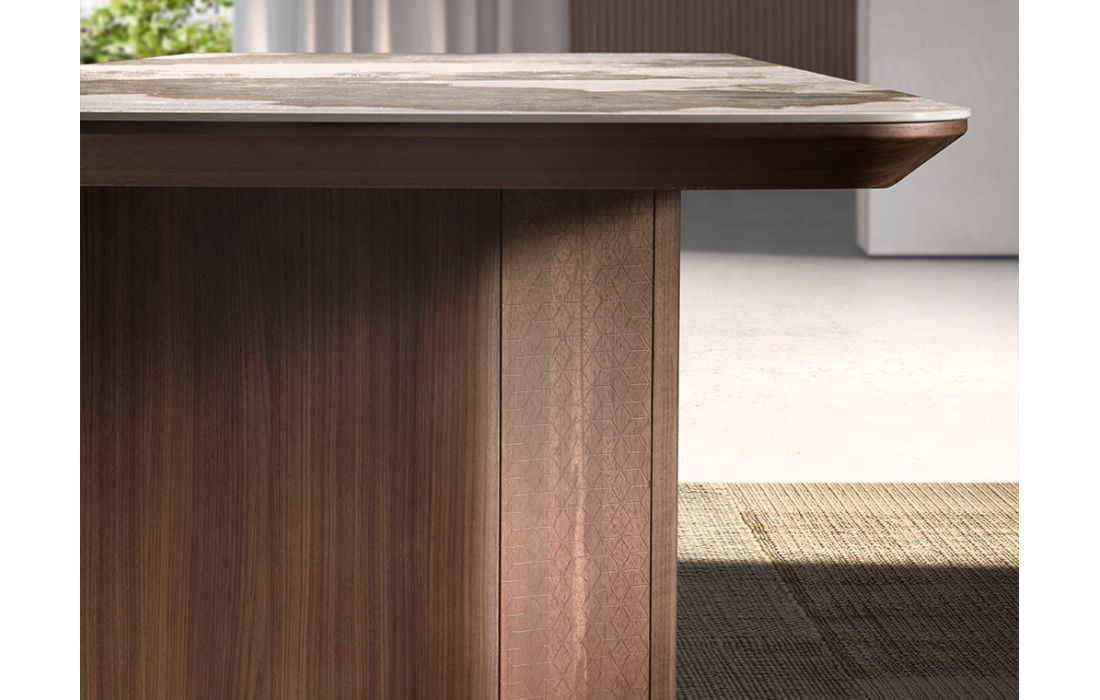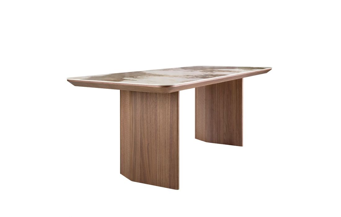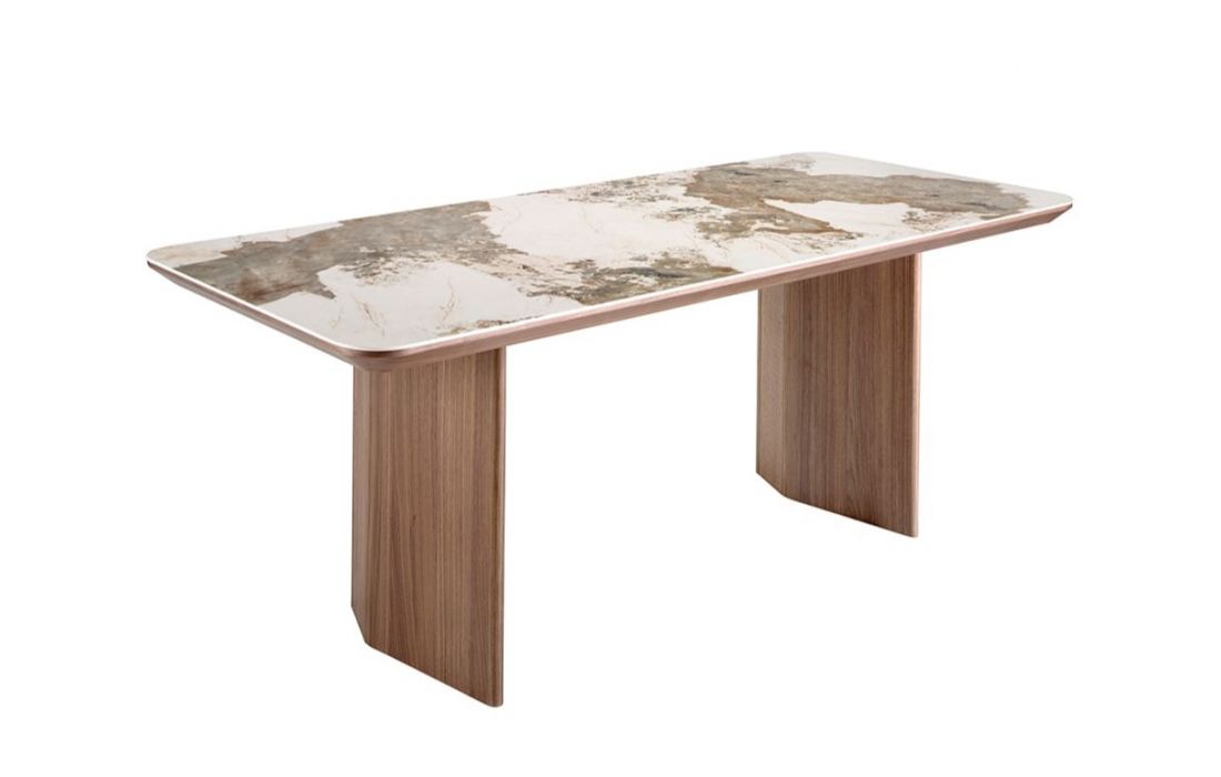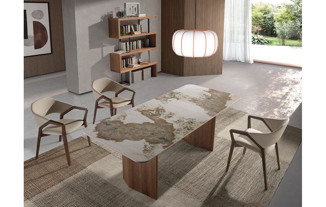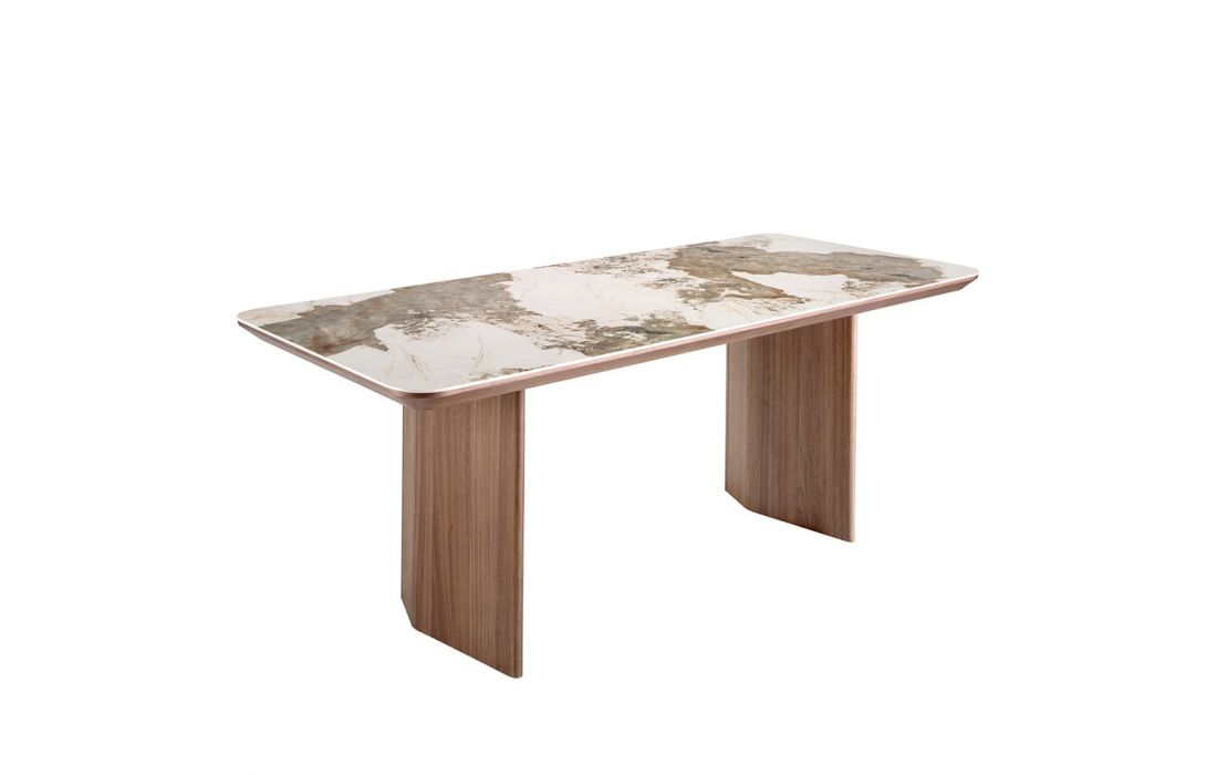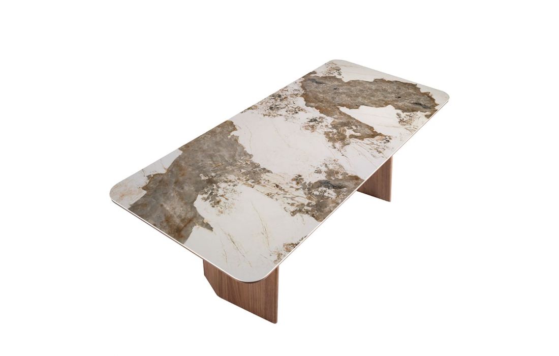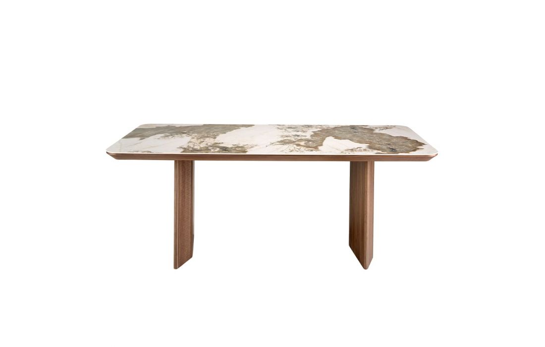 Rectangular dining table with fixed marble top with glossy finish and walnut wood legsDimensions in cm
