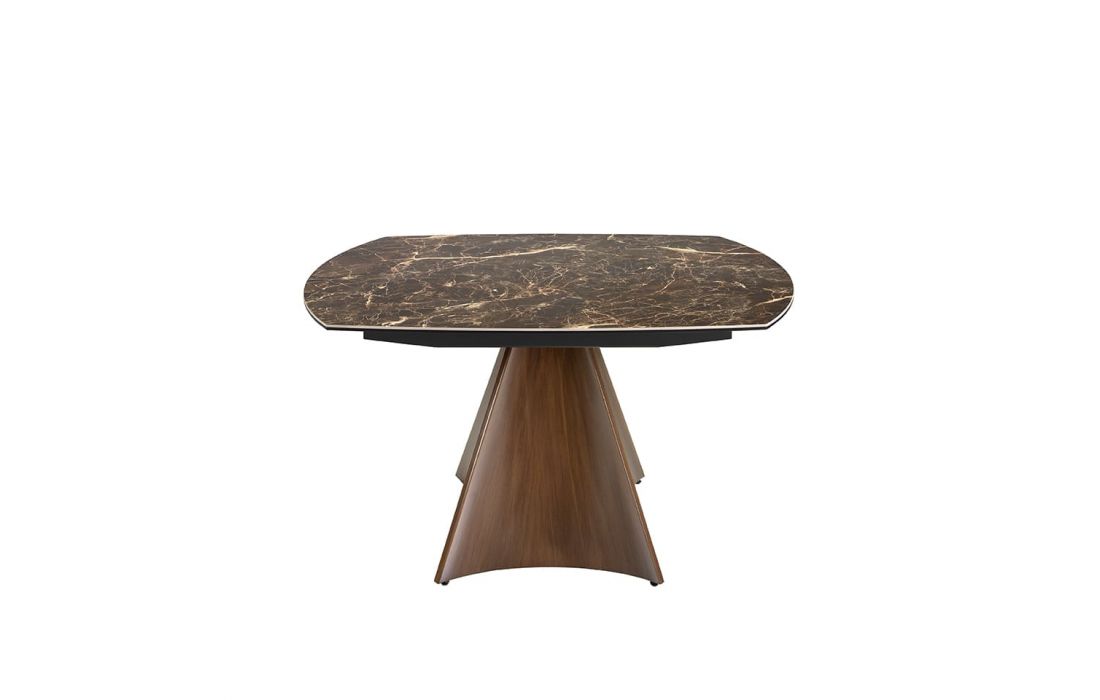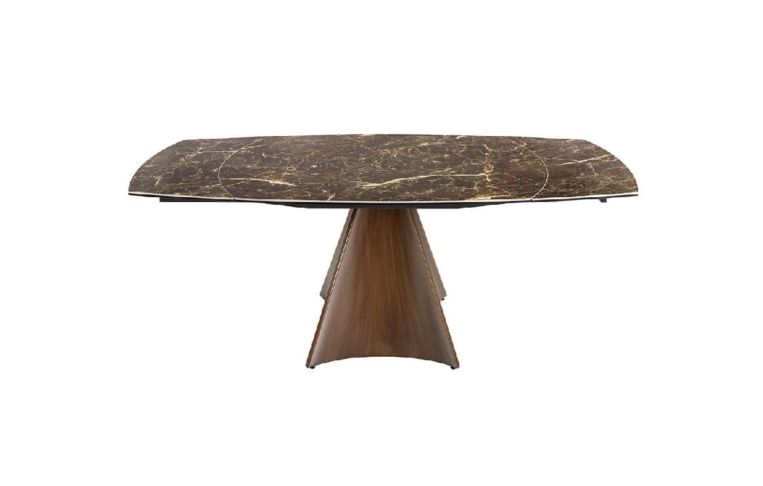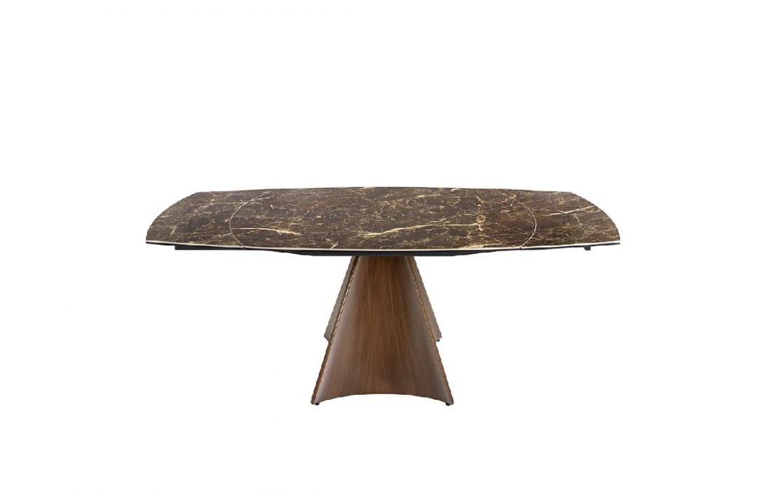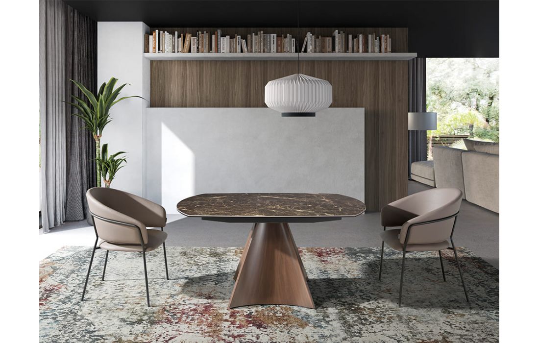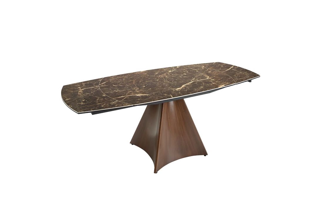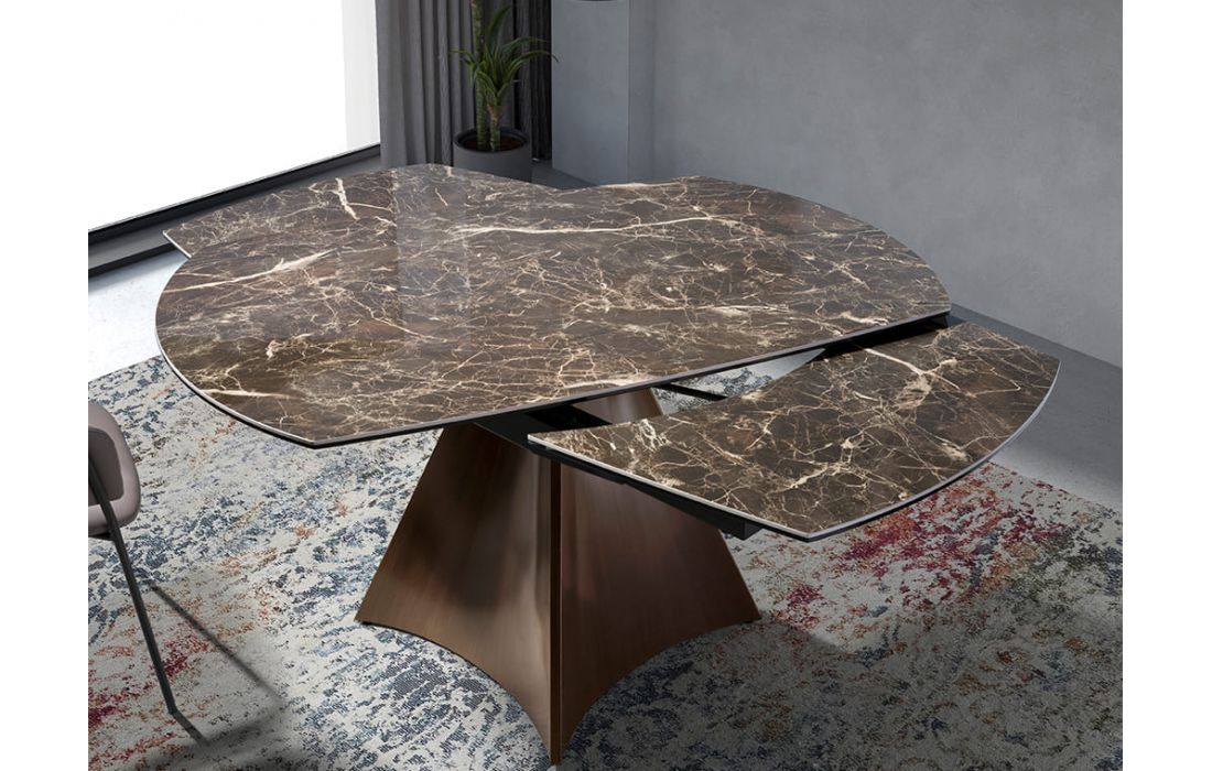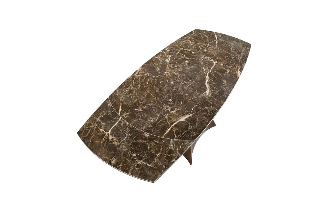 Oval extendable dining table with brown marble top with cream veins and glossy finish, stainless steel legs lacquered with imitation walnut wood.Recipient :