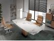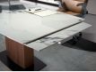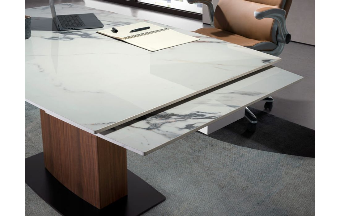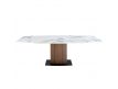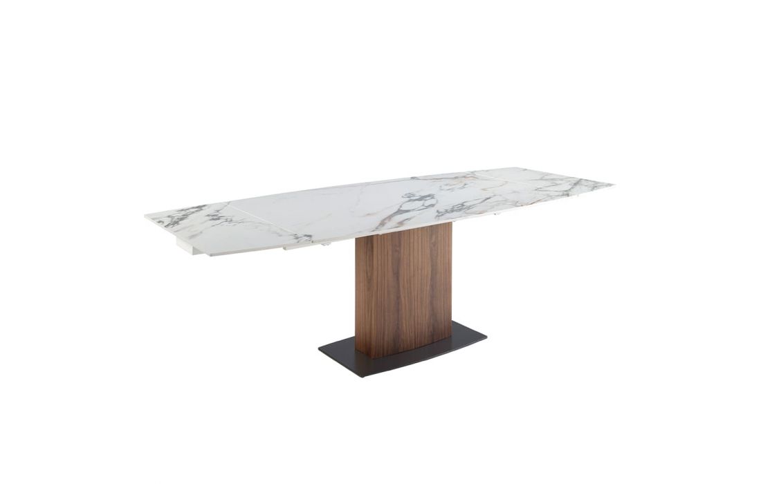 Oval extendable dining table with glossy finish marble top and walnut veneered wood legs along with its stainless steel baseRecipient :