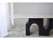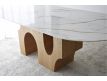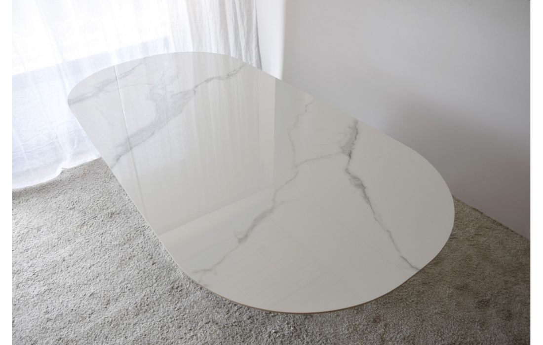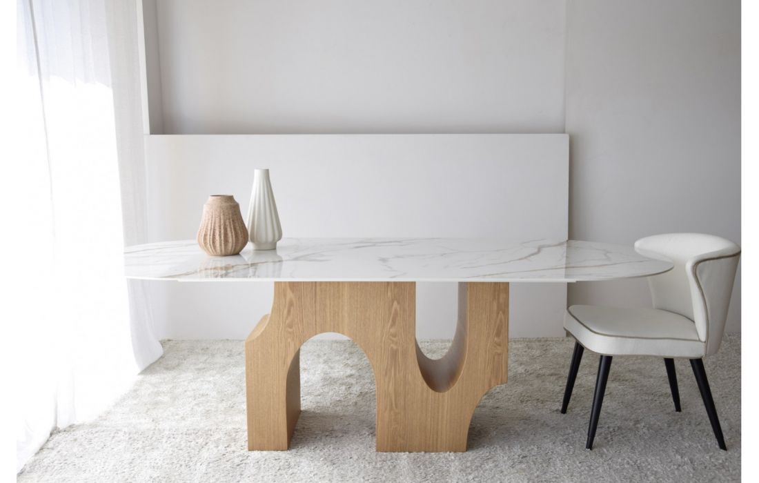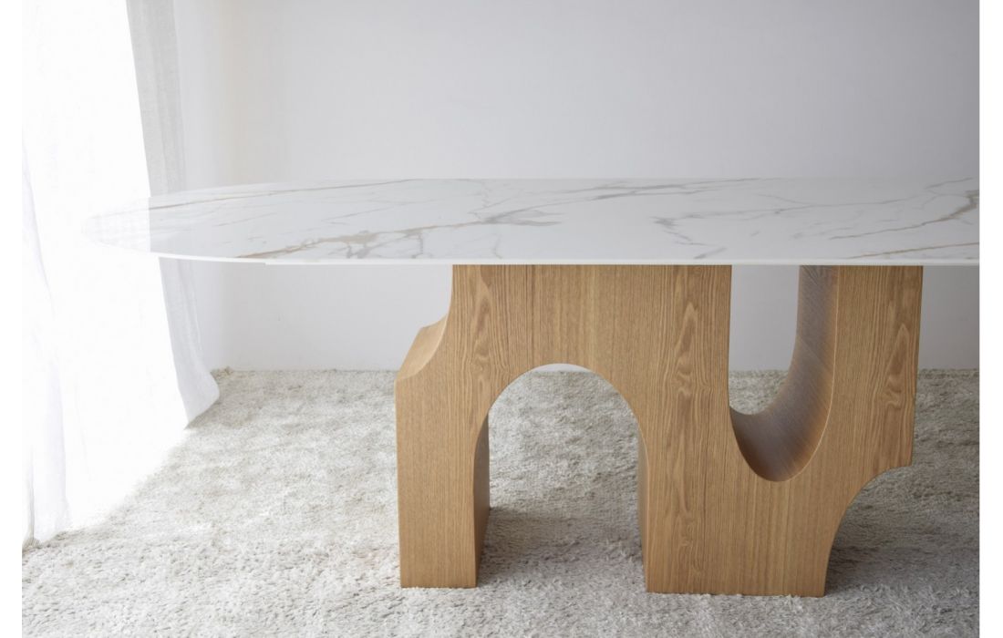 Dining table with ceramic top and ash wood legs.