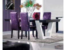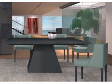 Dining table with matt black glass top combined with wood effect steel legs