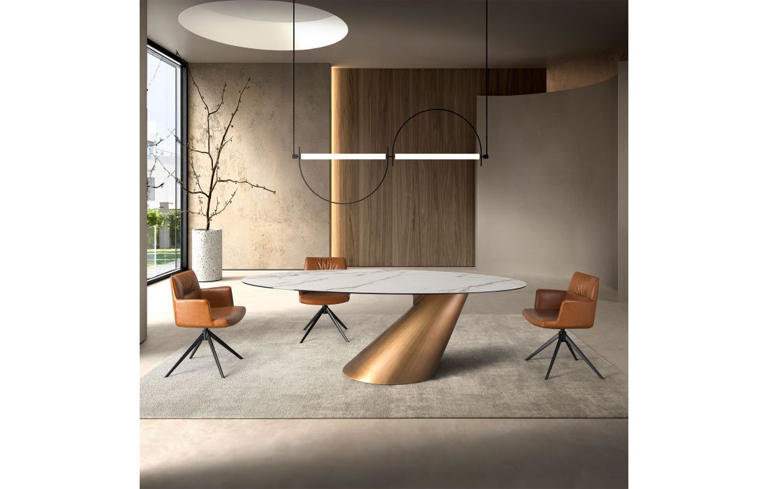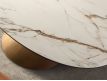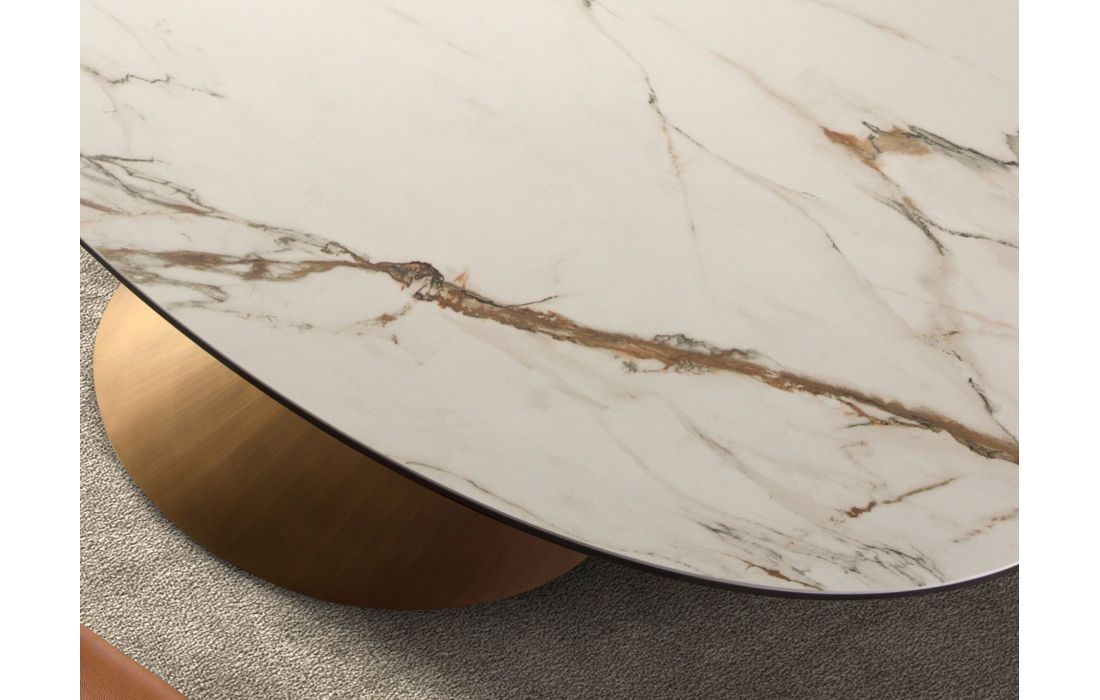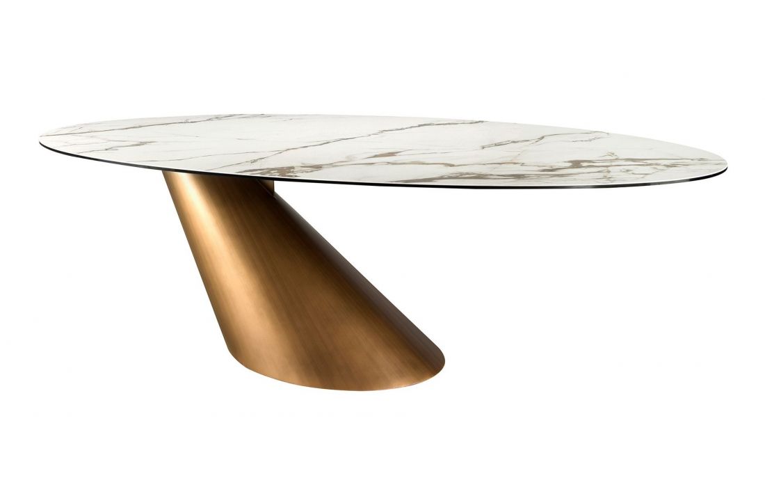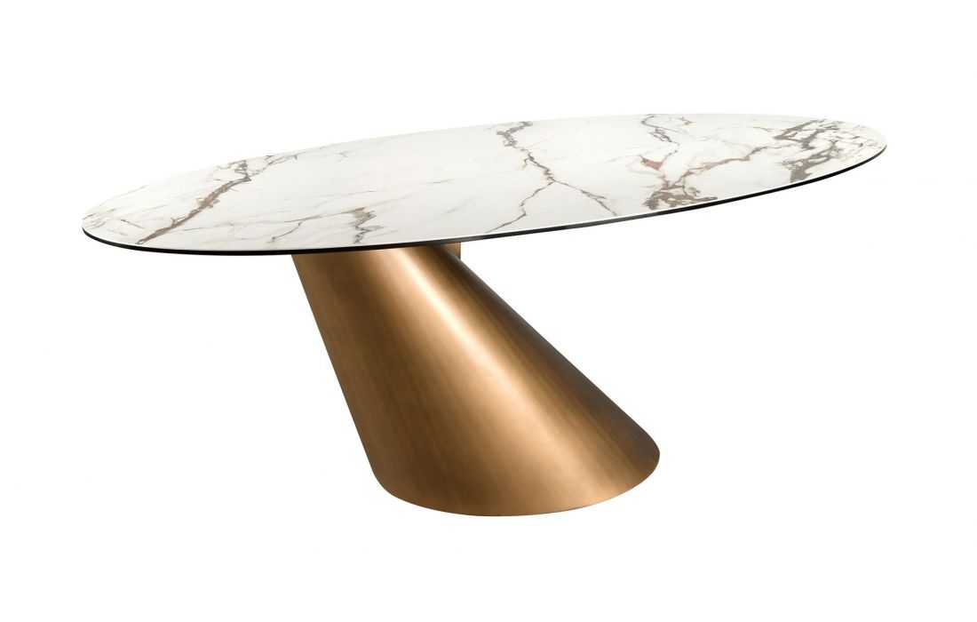 Modern design oval dining table with fixed top in white marble with gray veins and bronze details with matte finish and stainless steel legsRecipient :
