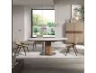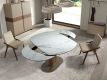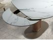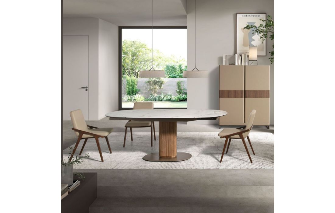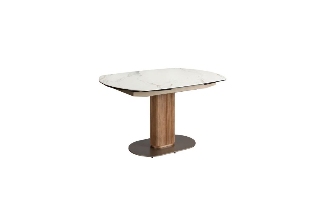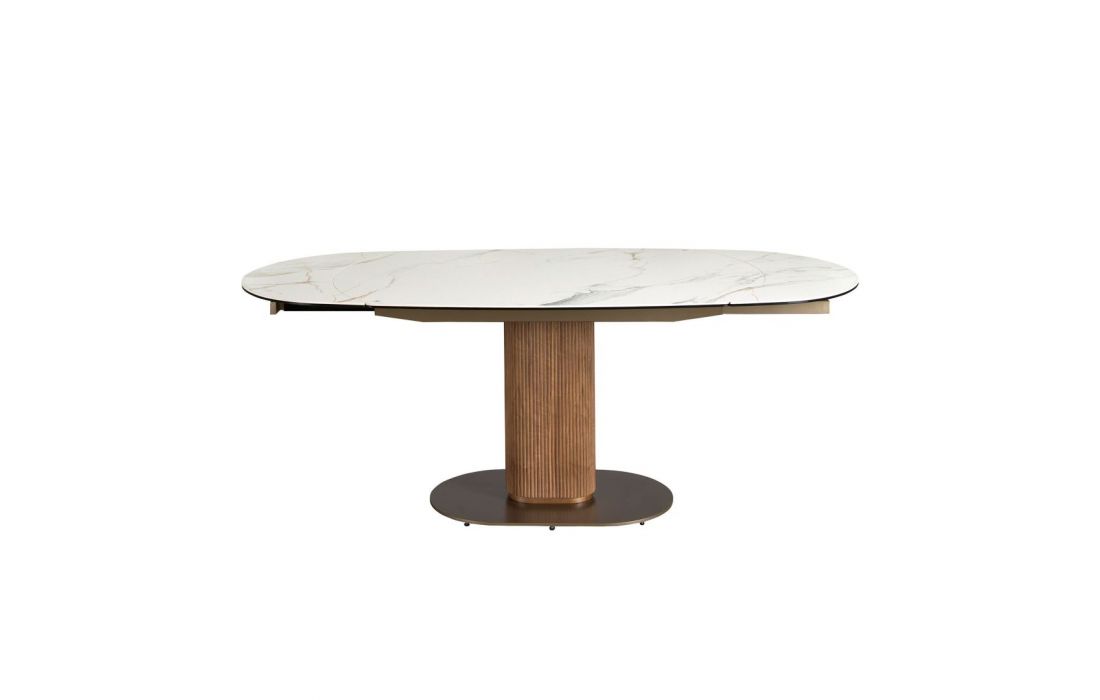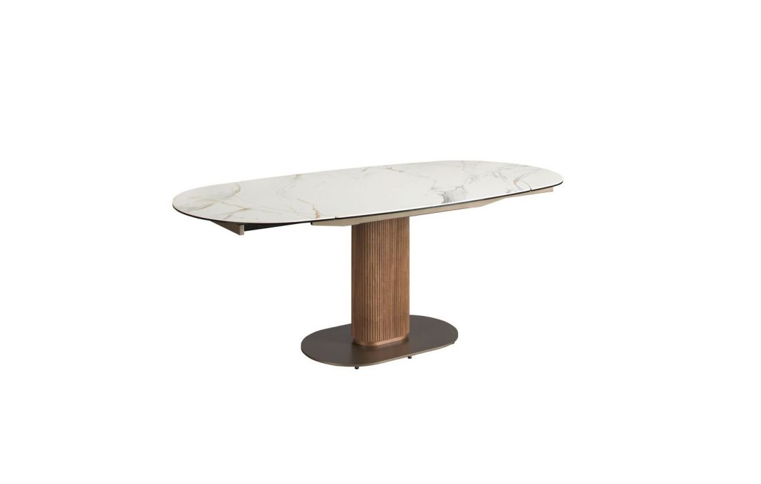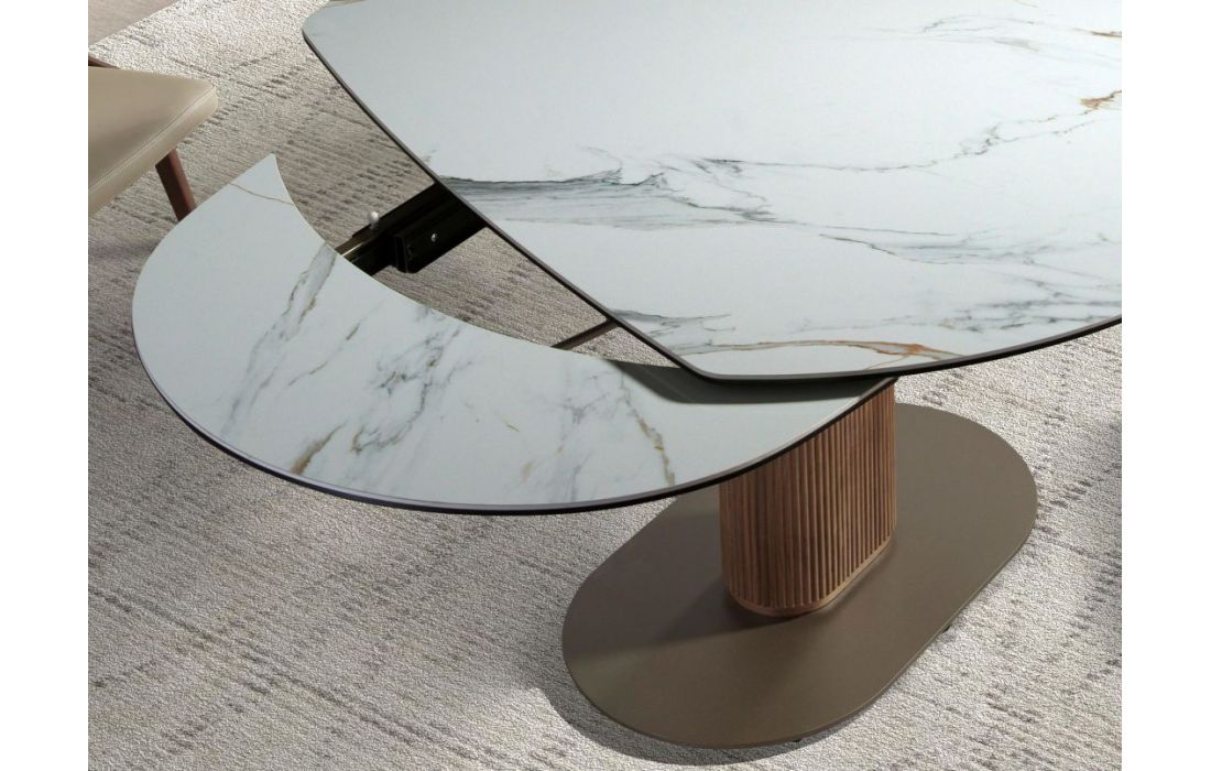 Modern design extendable oval dining table with glossy marble top and walnut-colored wooden legs, along with a stainless steel baseRecipient :