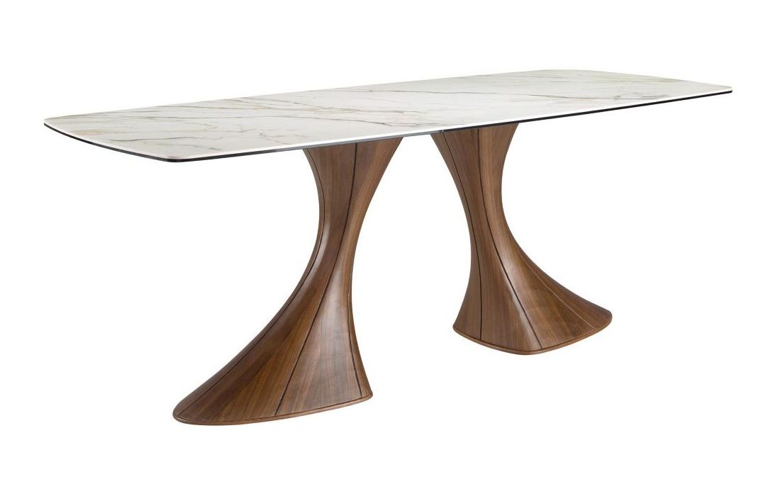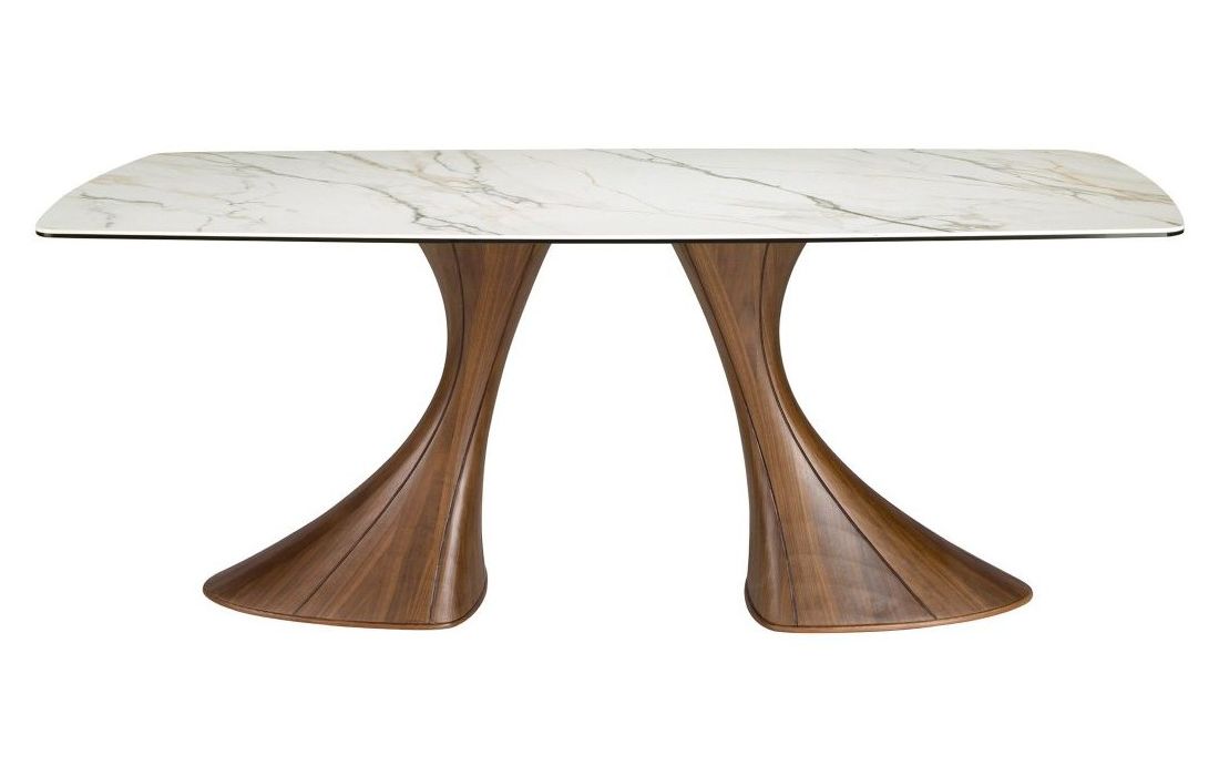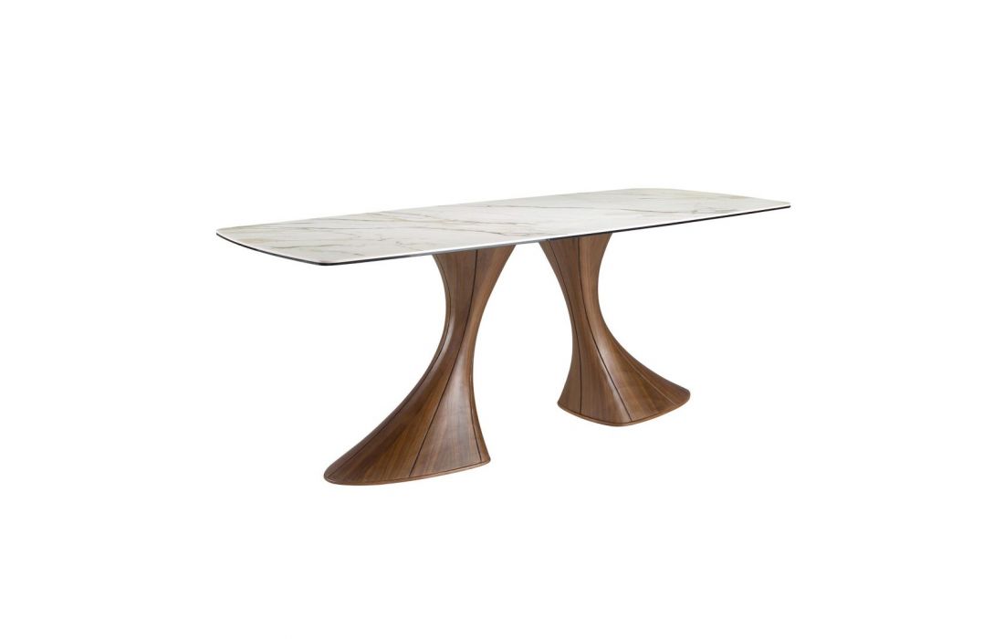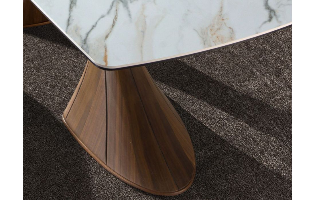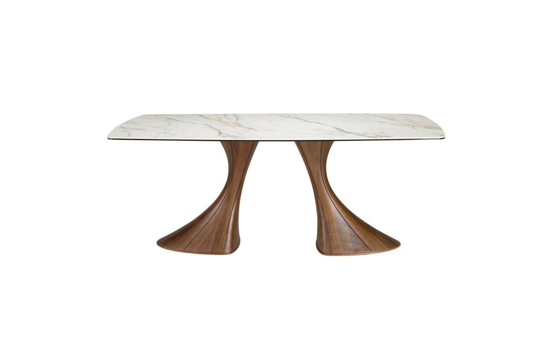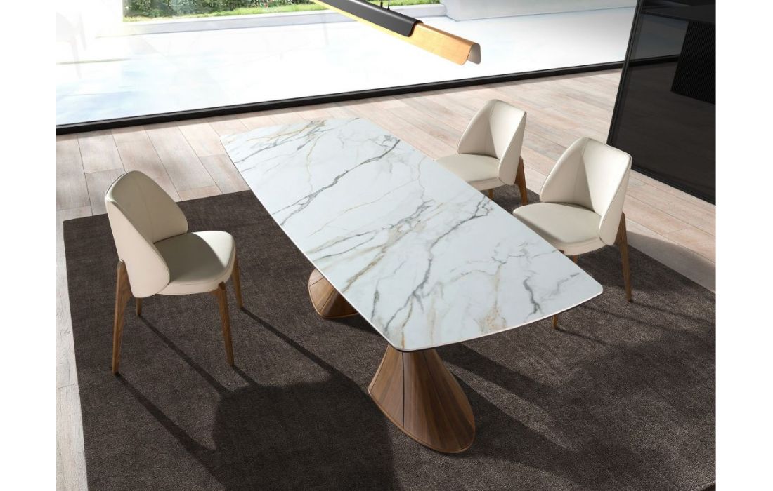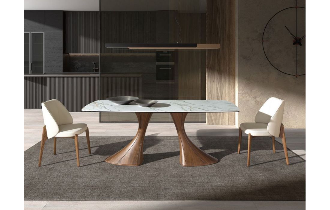 Oval dining table with fixed top, made of porcelain marble with a matte finish and its wooden legs in walnut colorRecipient :