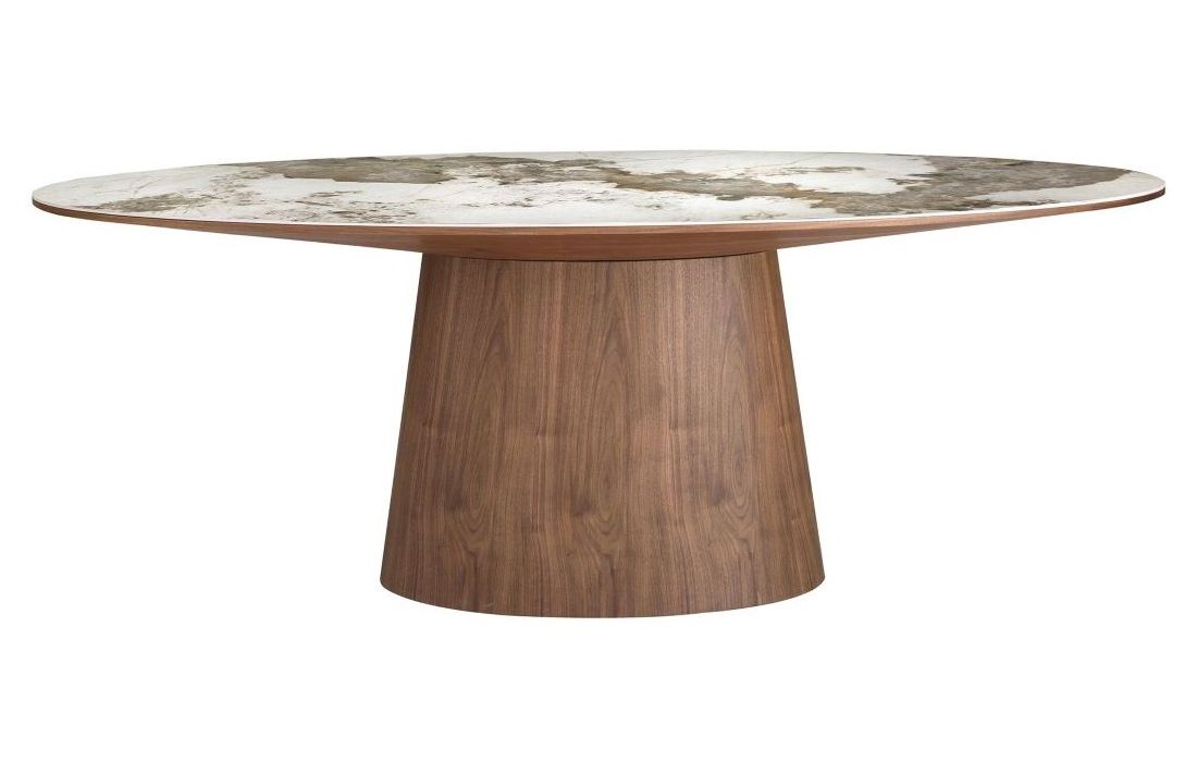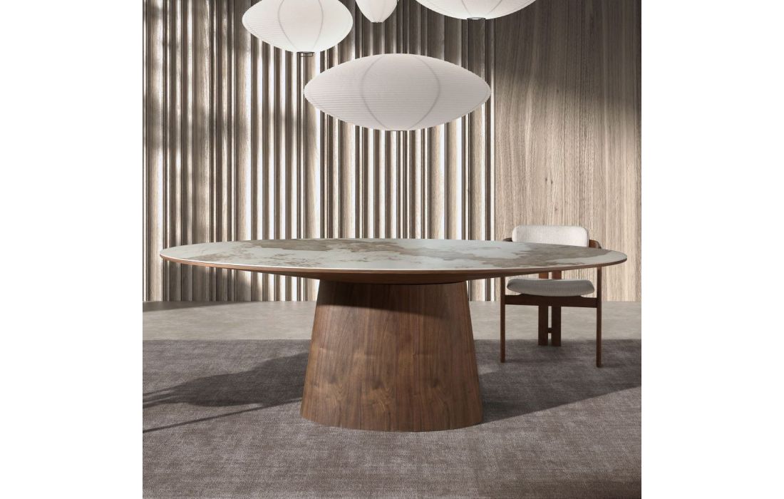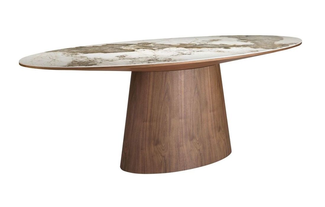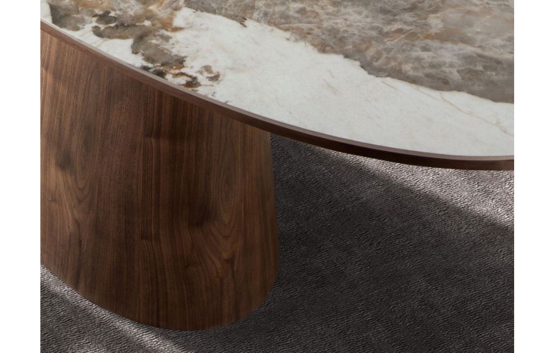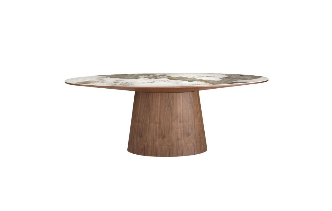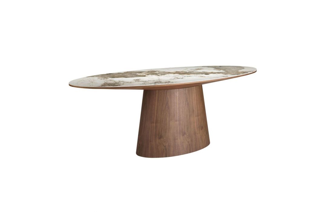 Oval dining table with a fixed top in marble porcelain and a glossy finish and its original wooden legs with natural walnut veneerRecipient :