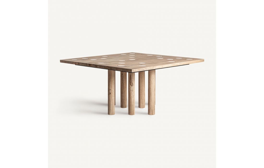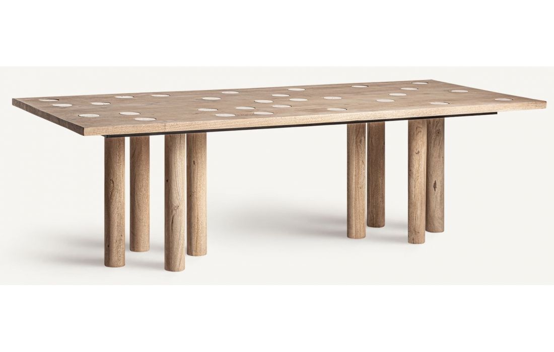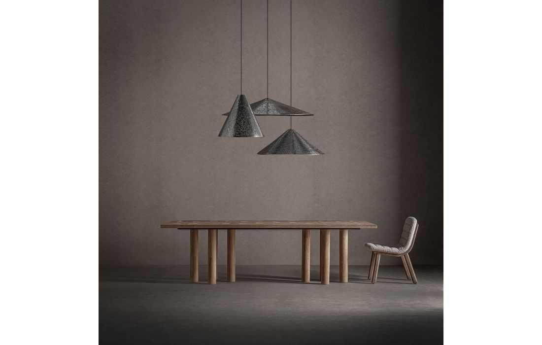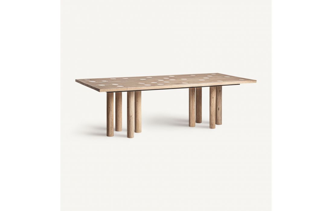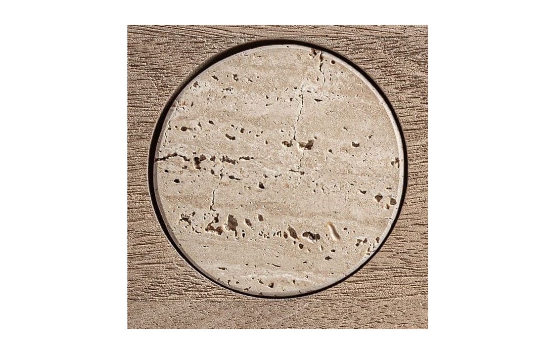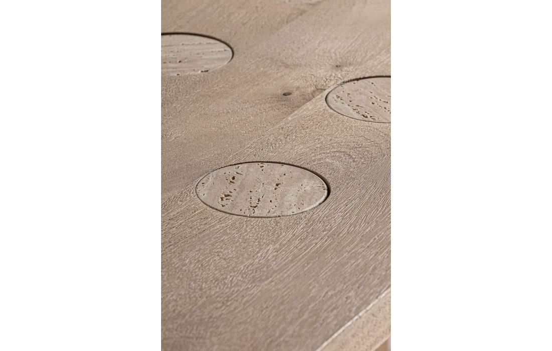 The JACQUARD DINING TABLE combines mango wood with travertine in a contemporary reinterpretation of noble materials.Its solid presence and sculptural language bring great visual strength to the space.Available in two sizes. Dimensions in cm L 250D 110 H 76