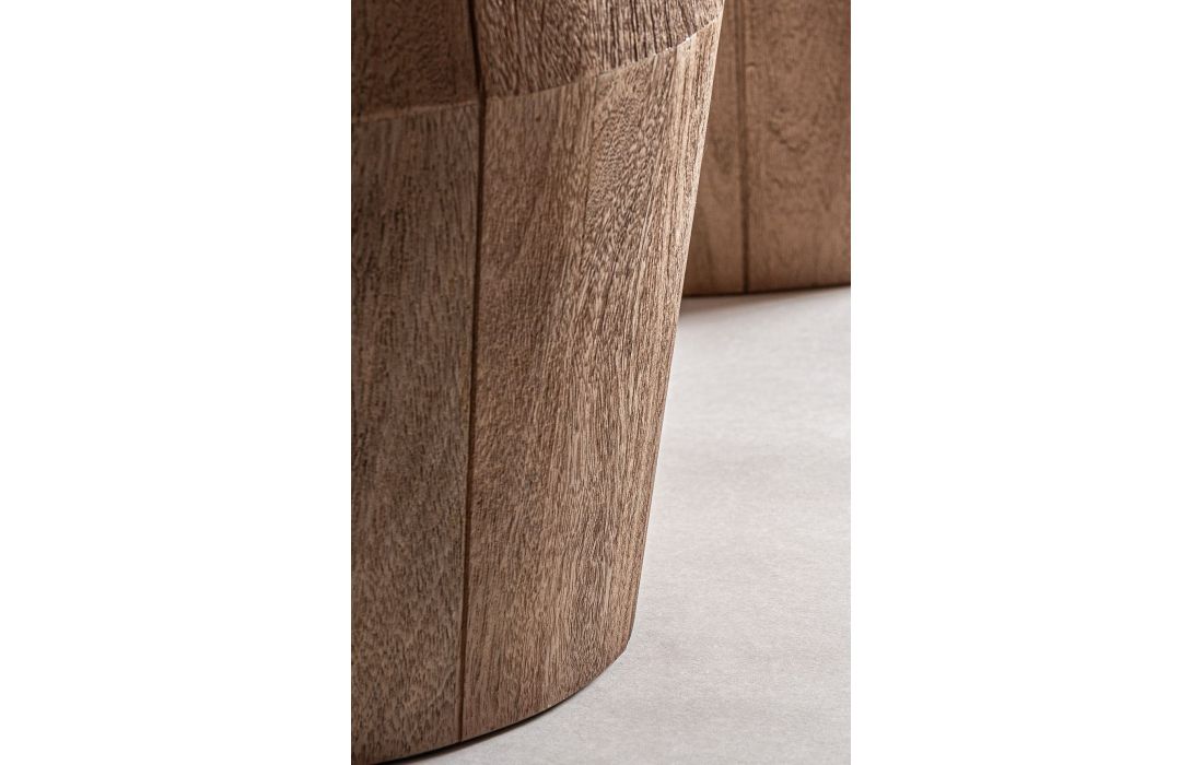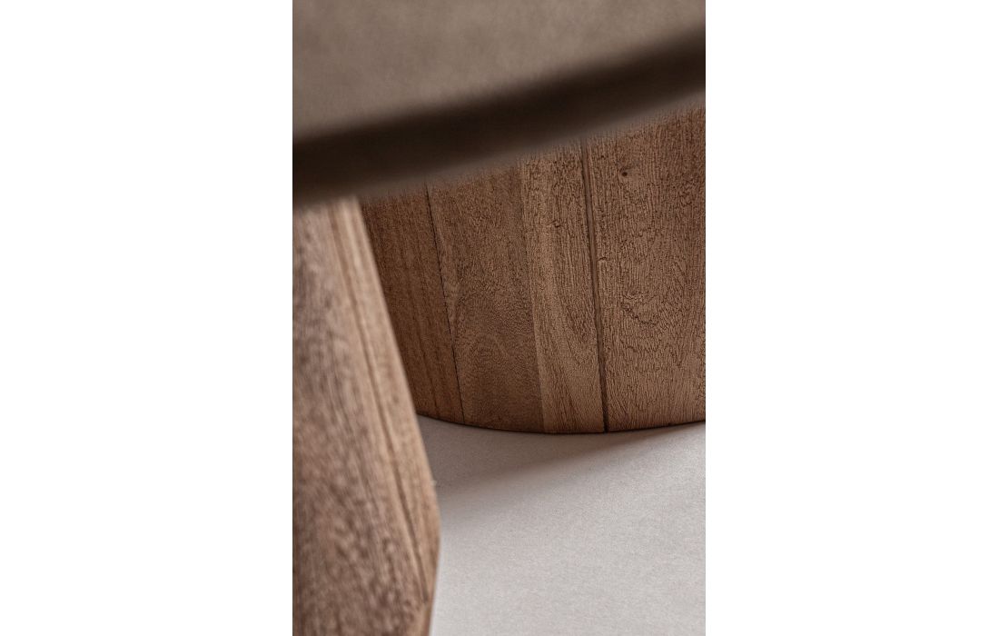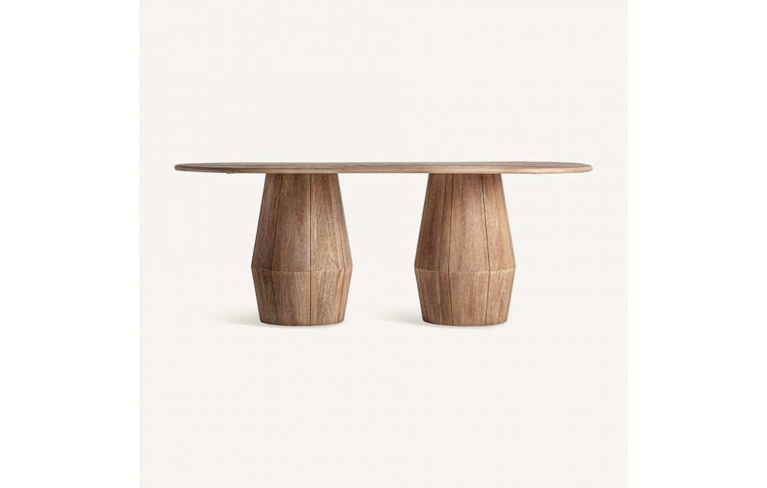 The JACQUARD dining table, crafted from mango wood, features two twisted cylindrical legs that reinterpret the classic table with a modern aesthetic. Dimensions in cm L 220D 110 H 75