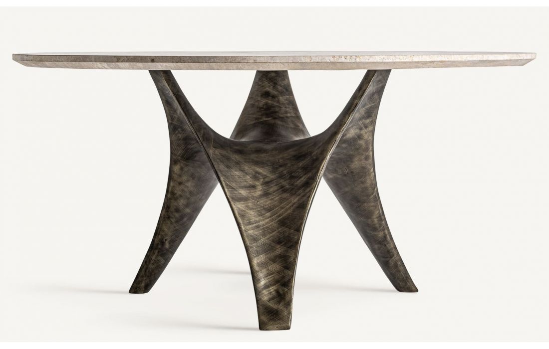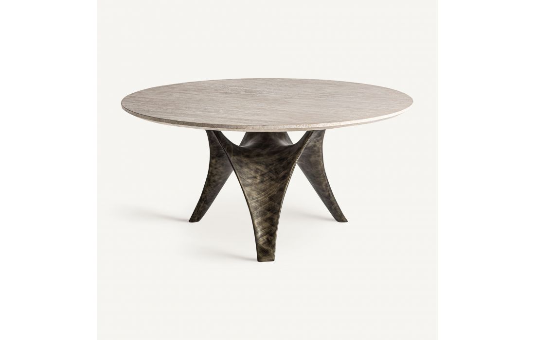 The LAIZE DINING TABLE, crafted from travertine and aged steel, is a piece with a strong visual presence.Its metal base provides contrast, while its natural stone surface conveys solidity and elegance. Dimensions in cm L 150D 150 H 75