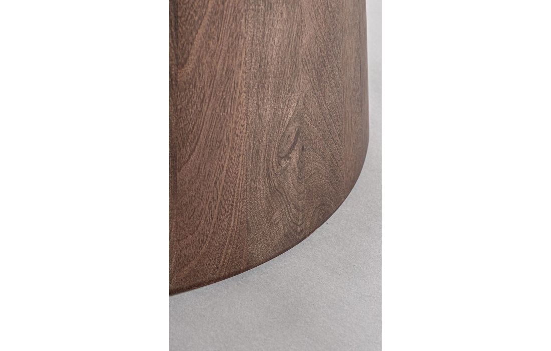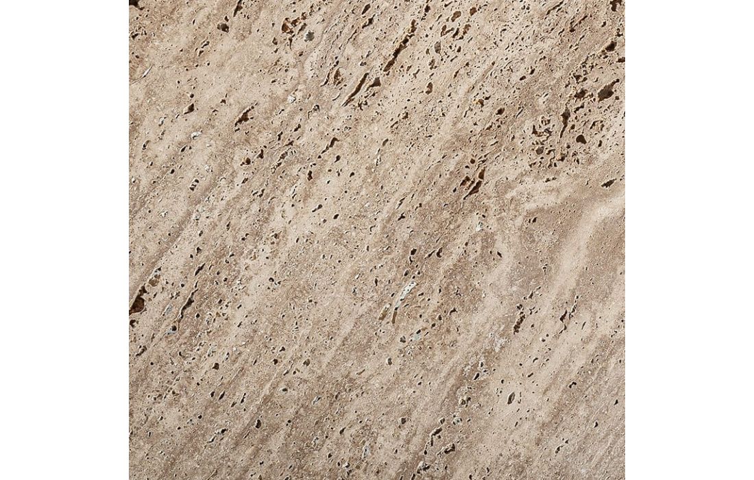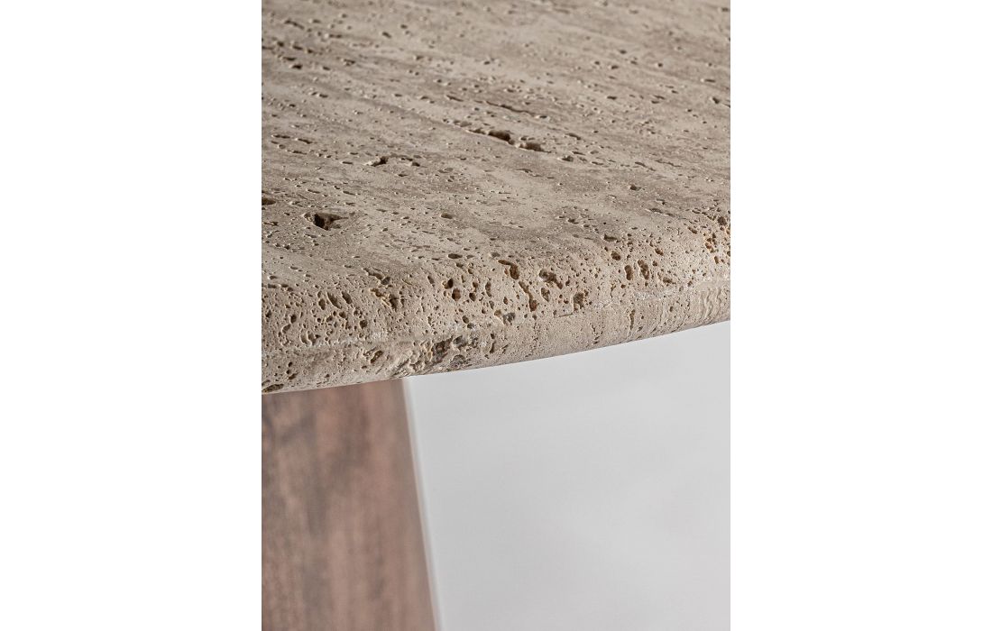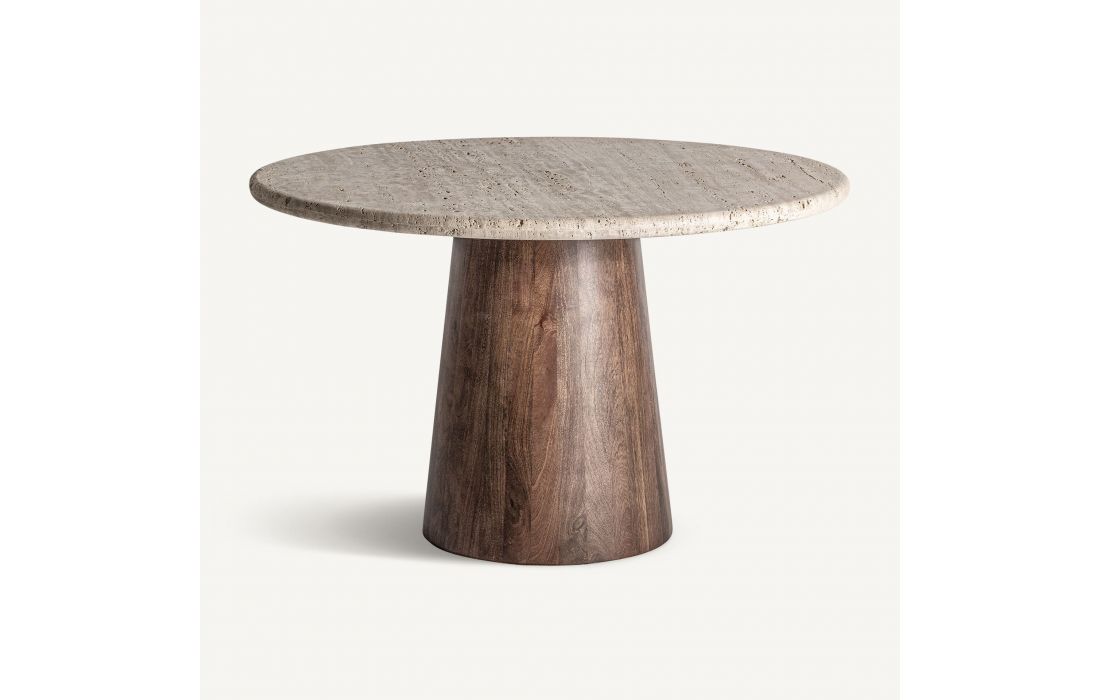 The VARZI DINING TABLE combines travertine and mango wood in an elegant and sculptural Art Deco design.