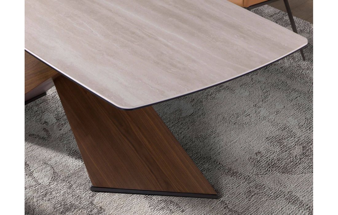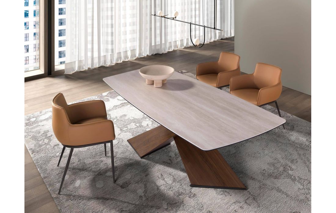 A modern oval dining table with a fixed sand-colored porcelain top with a matte finish. Its original natural walnut wood legs are key elements that stand out in the design.Recipient :