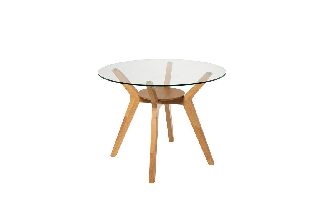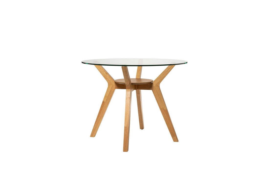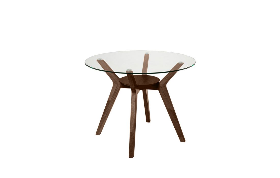 A contemporary and elegant table with a round tempered glass top that provides a feeling of spaciousness and lightness to the environment. The solid wood legs are available in walnut and oak, with the latter in two sizes.