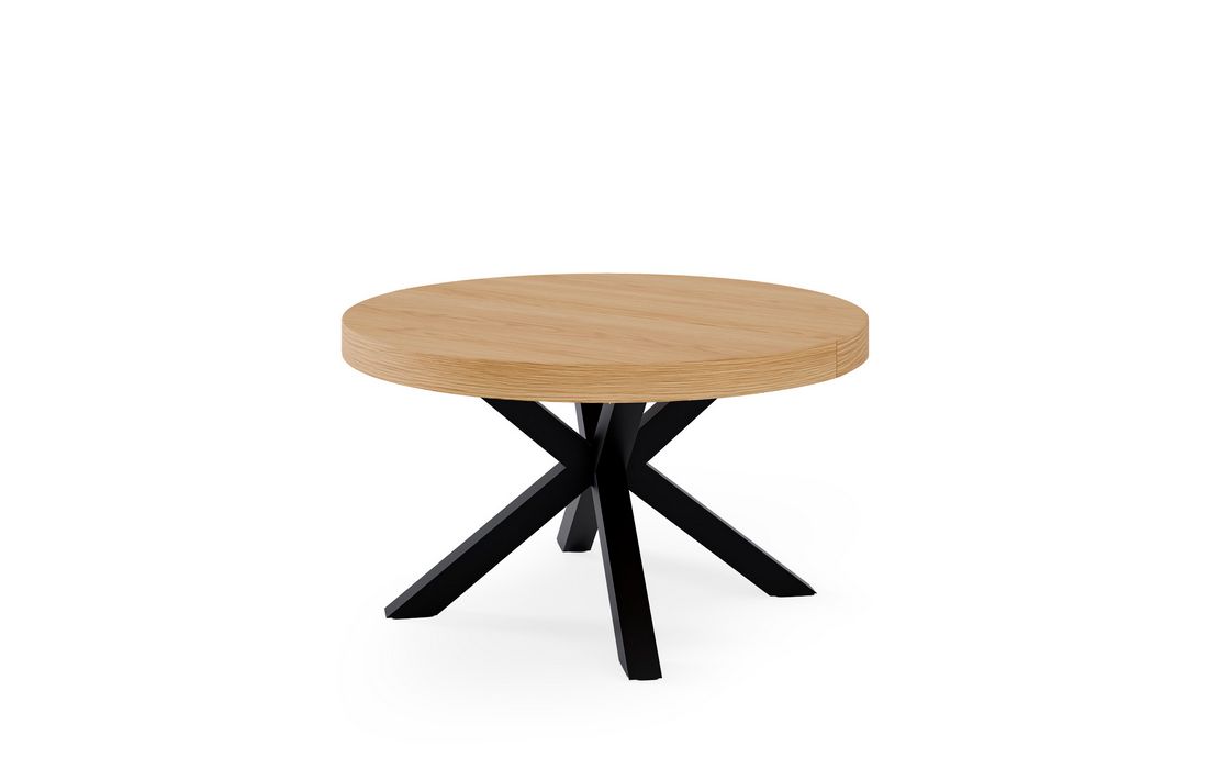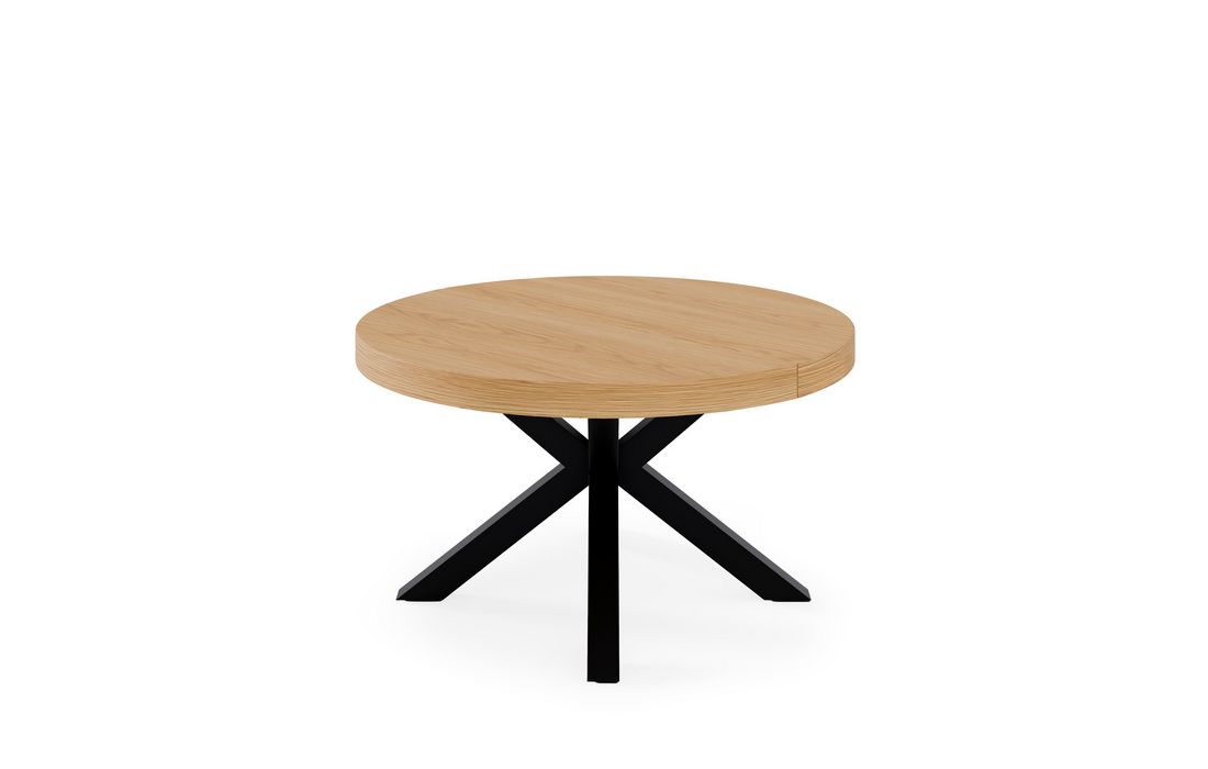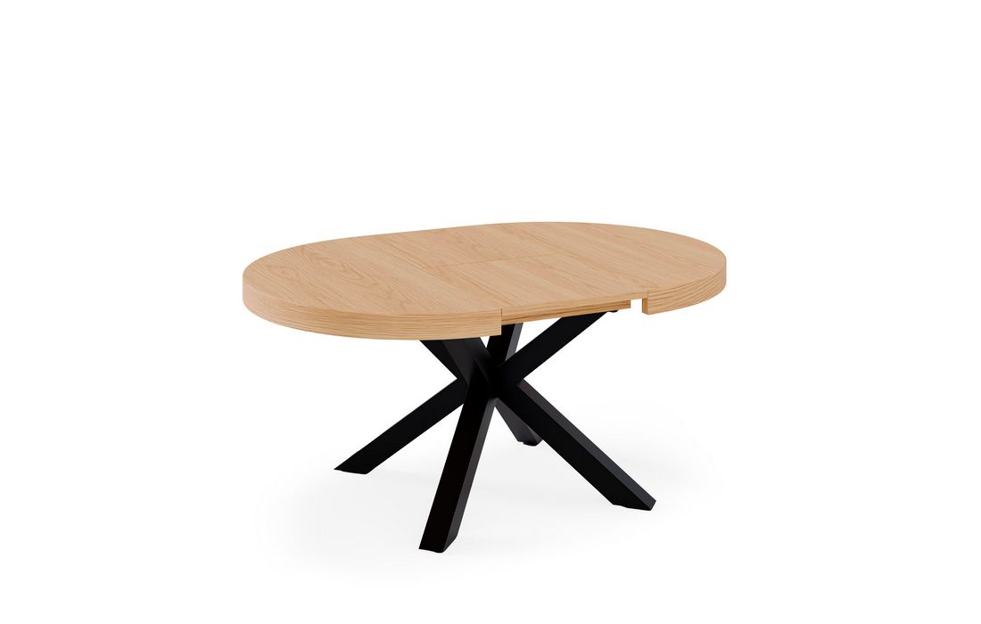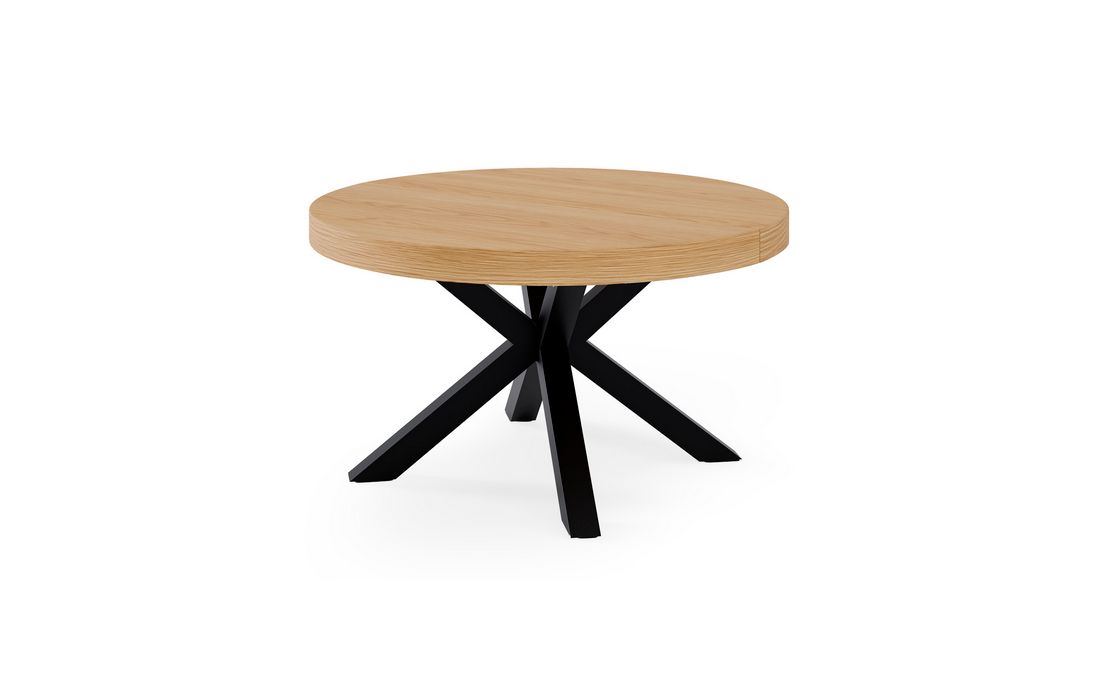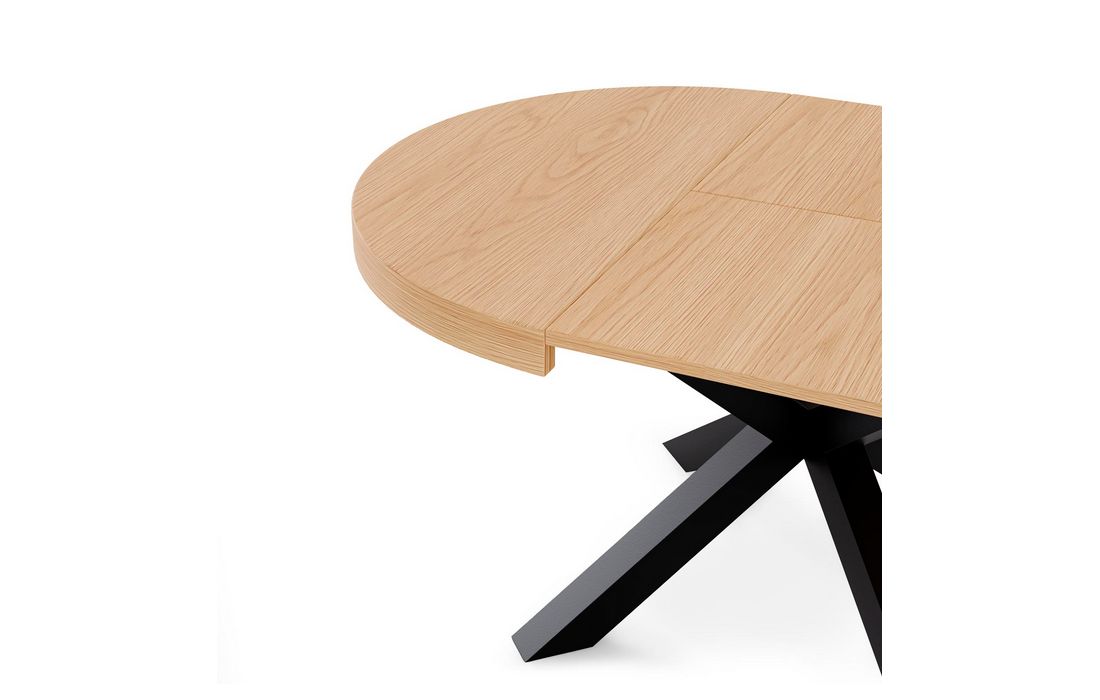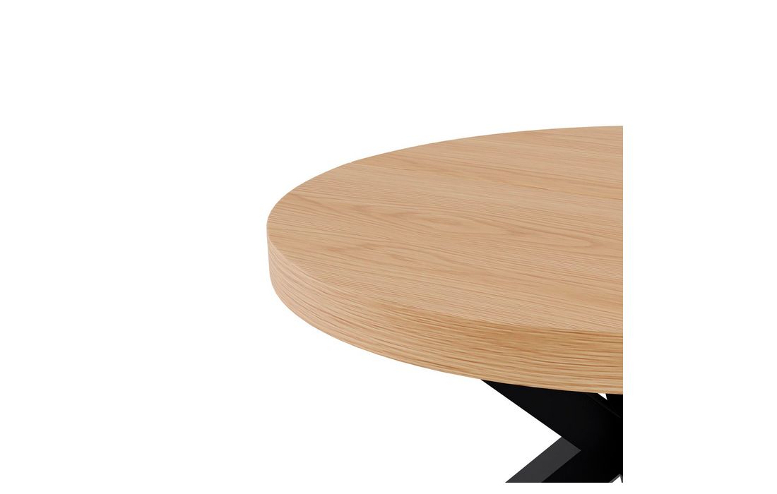 This table is an ode to design with a contemporary soul.Its oak veneer top exudes a subtle warmth, while the metal base, with its intertwined cross shape, provides visual solidity. Available in two sizes.