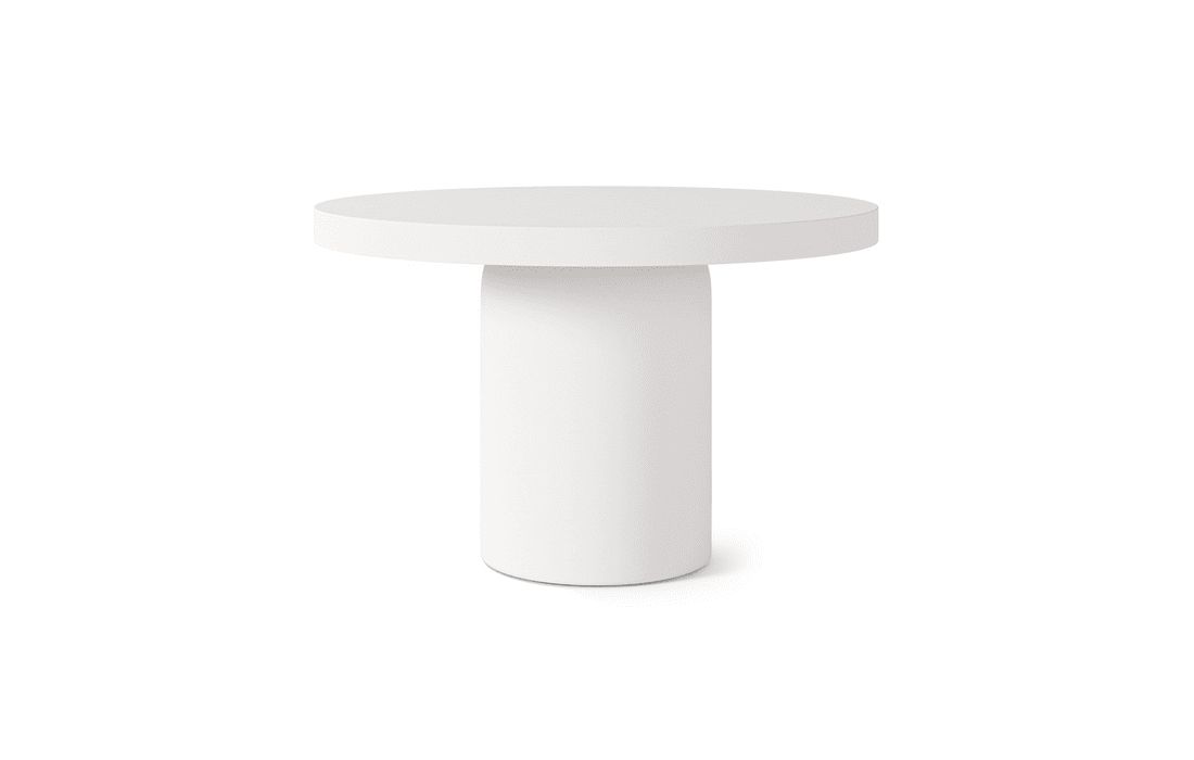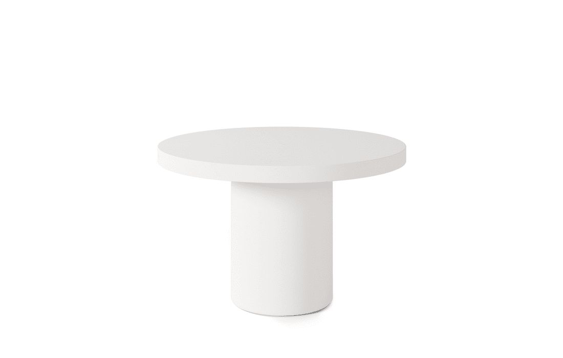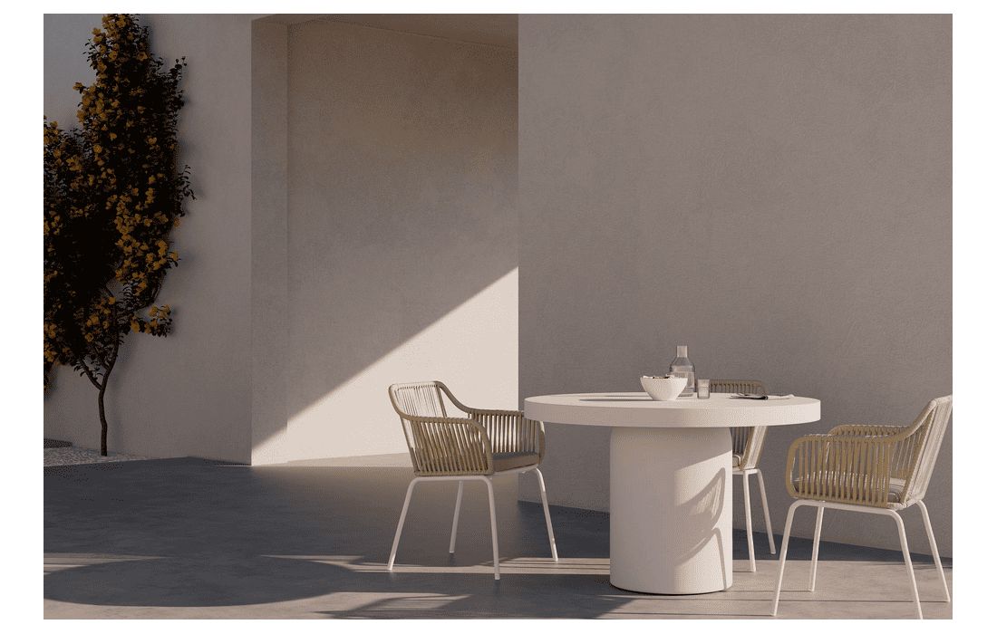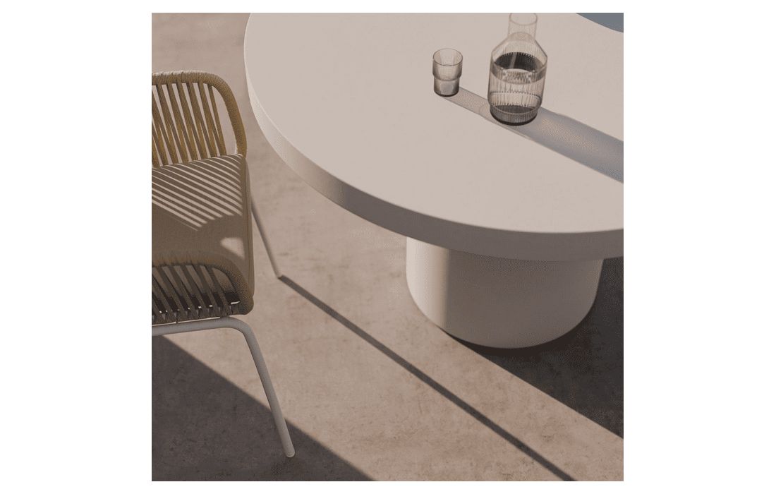 This table stands out for its refined aesthetics and serene presence, thanks to its white cement-GFRC finish reinforced with fiberglass. Available in two sizes.