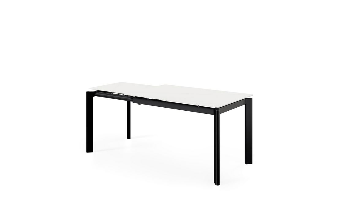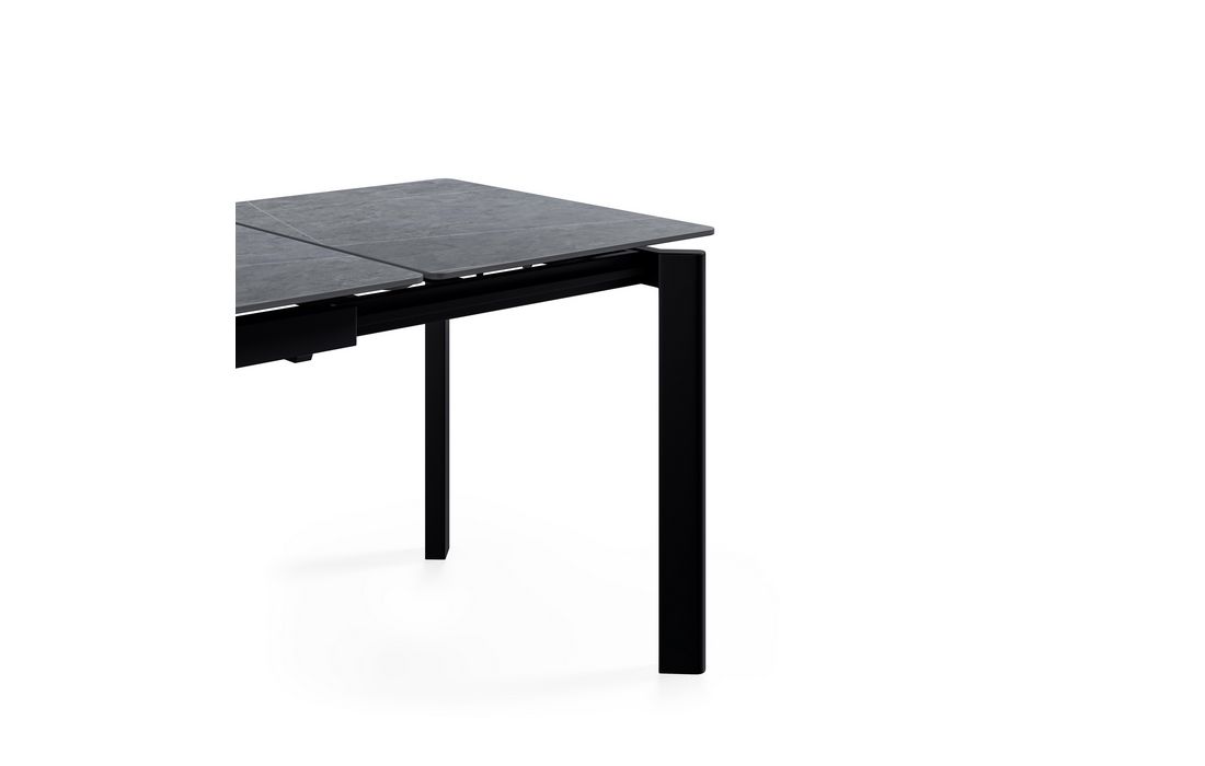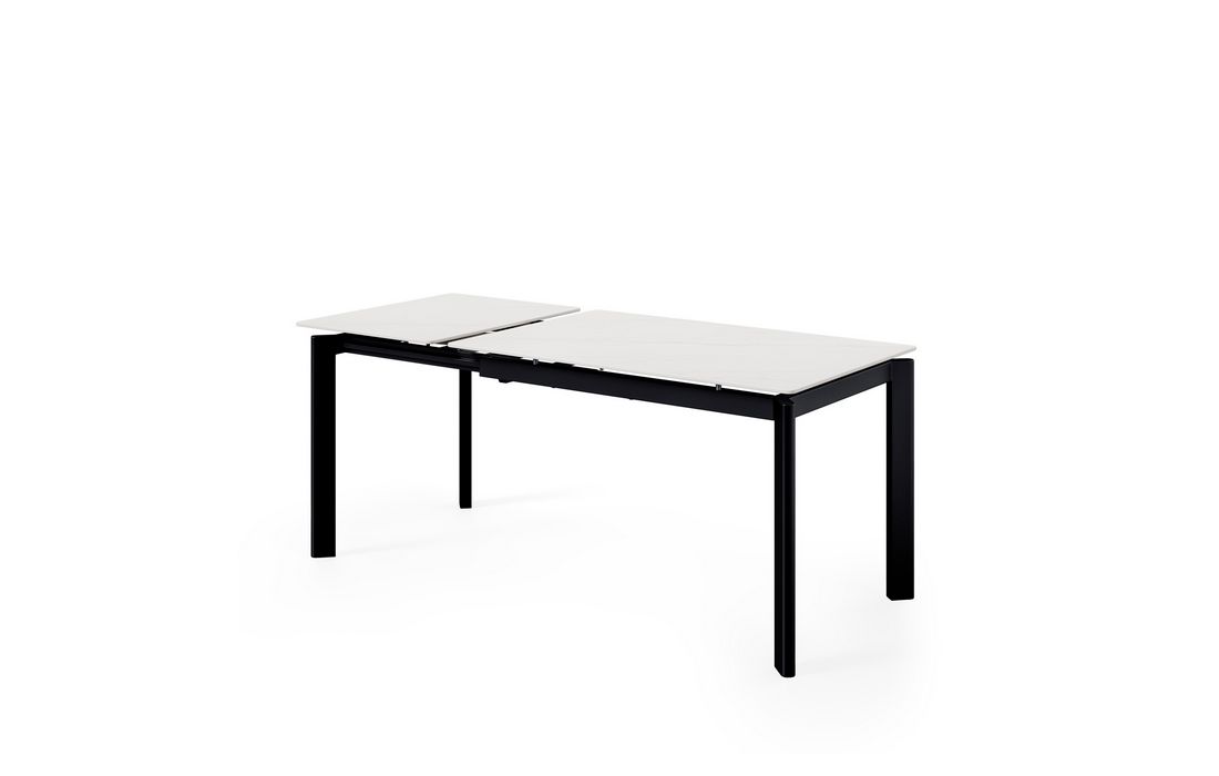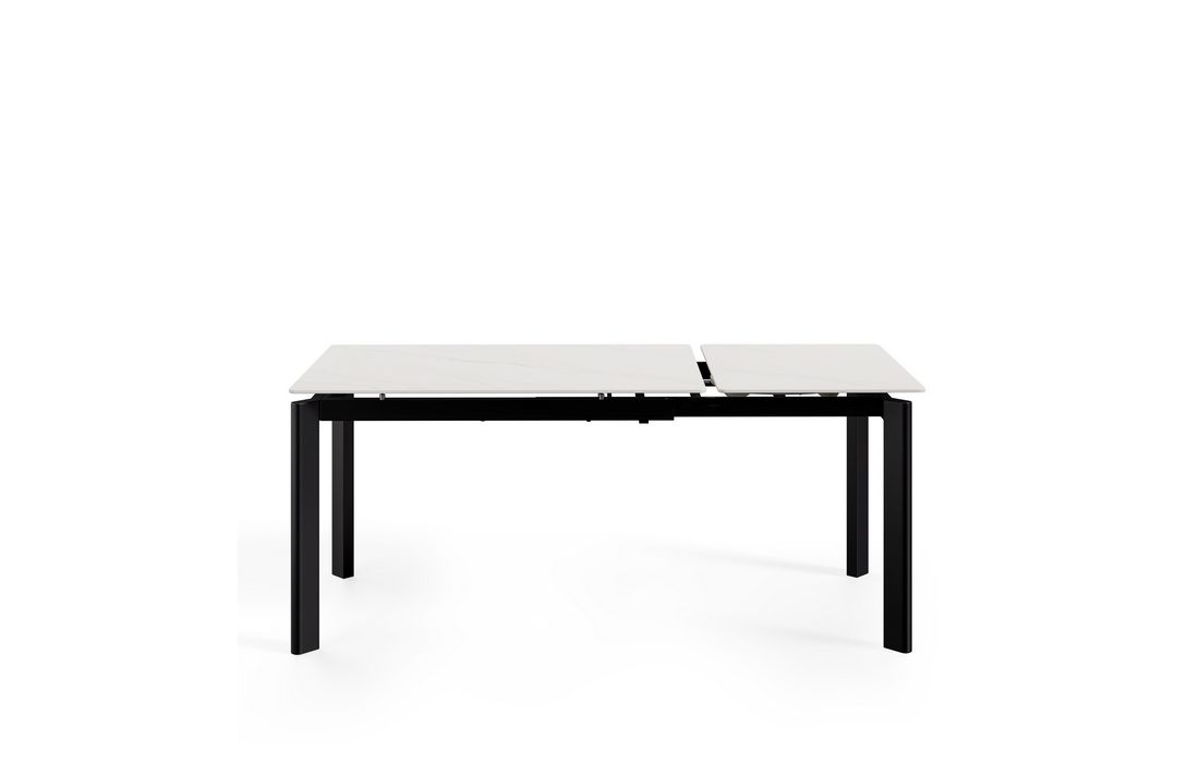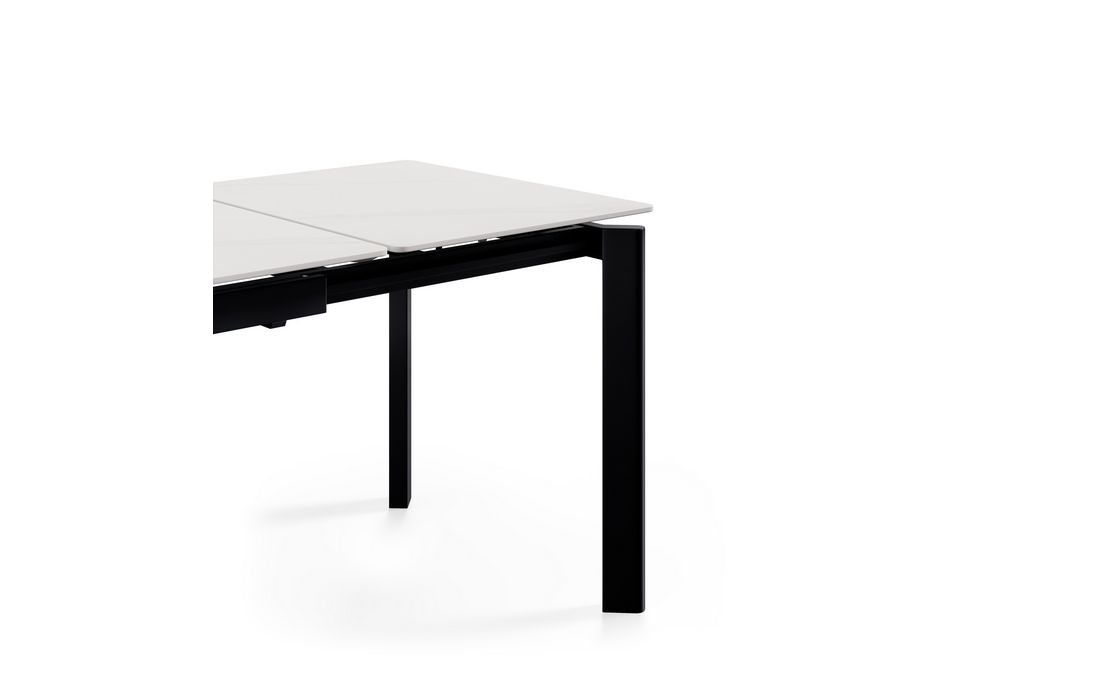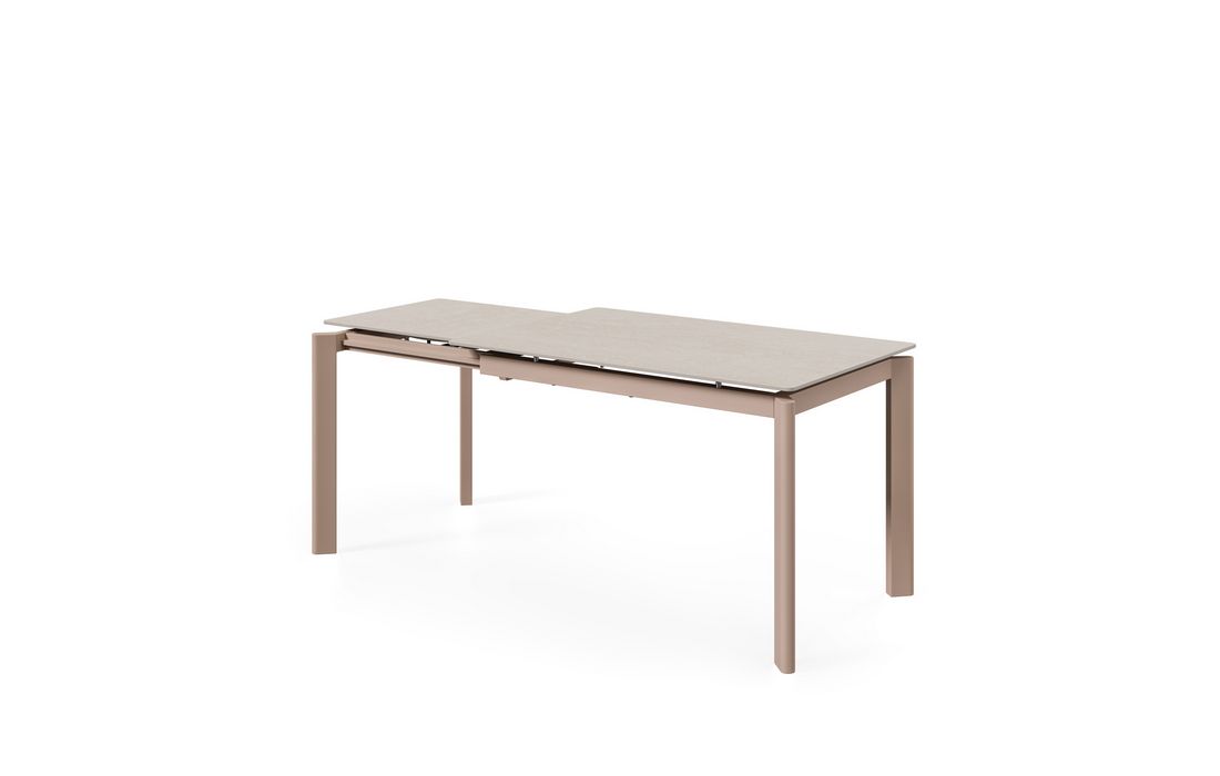 This extendable table combines elegance with modern style.Its porcelain top, available in black, gray, and white, matches its metal legs, also available in a version with beige legs and top. Available in 2 sizes.
