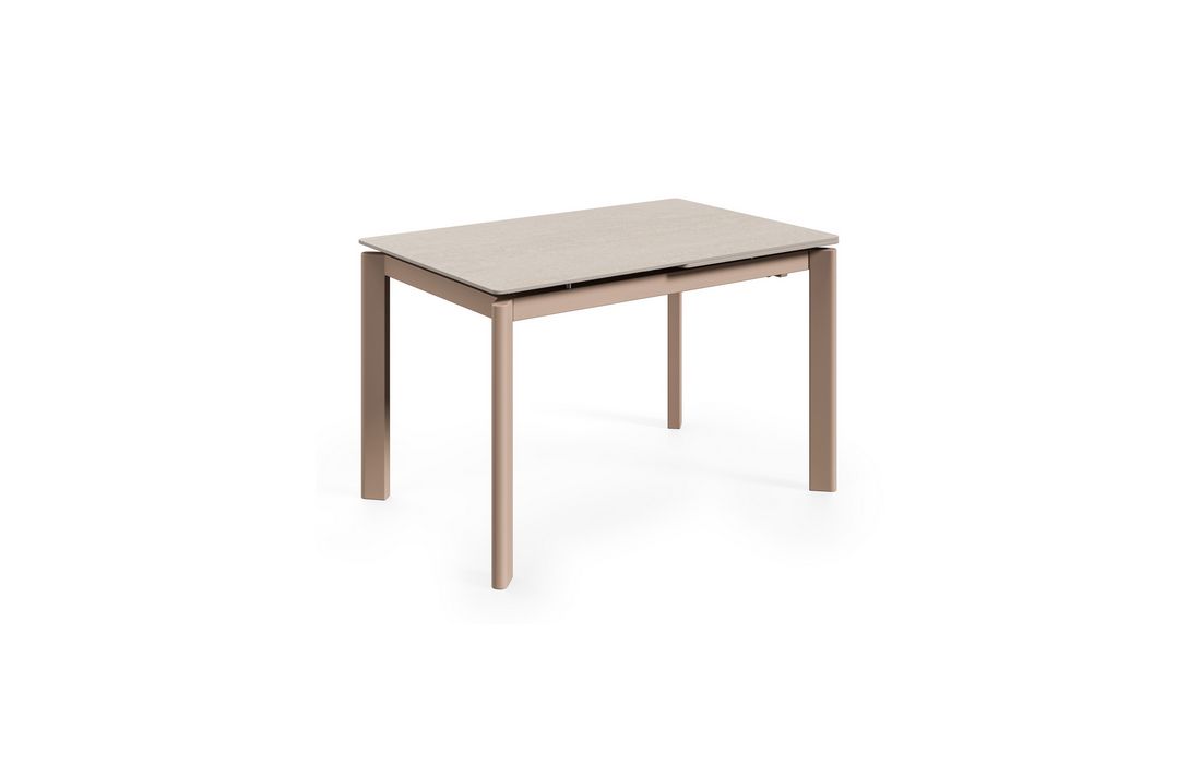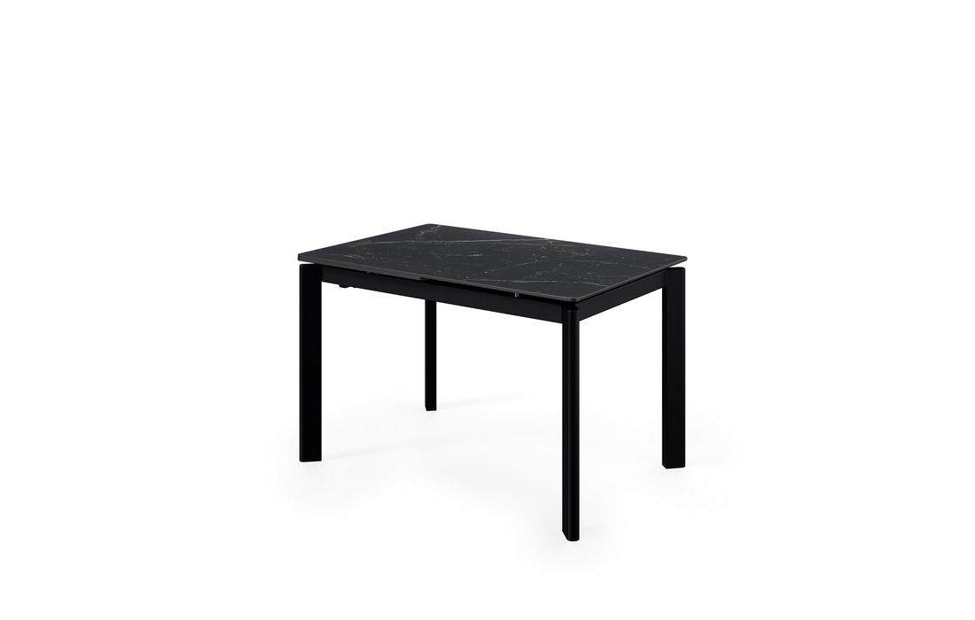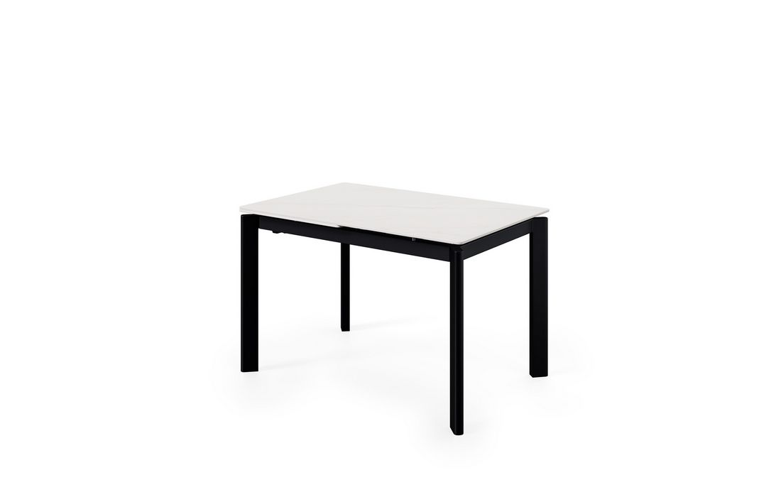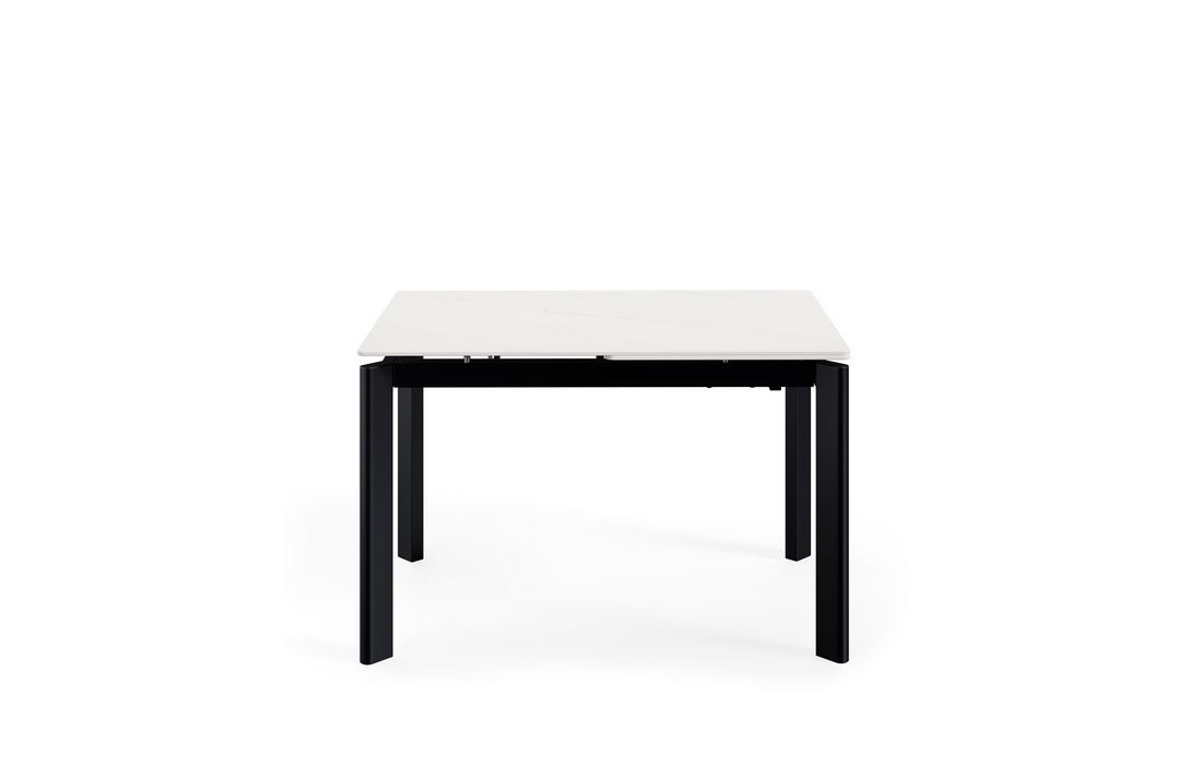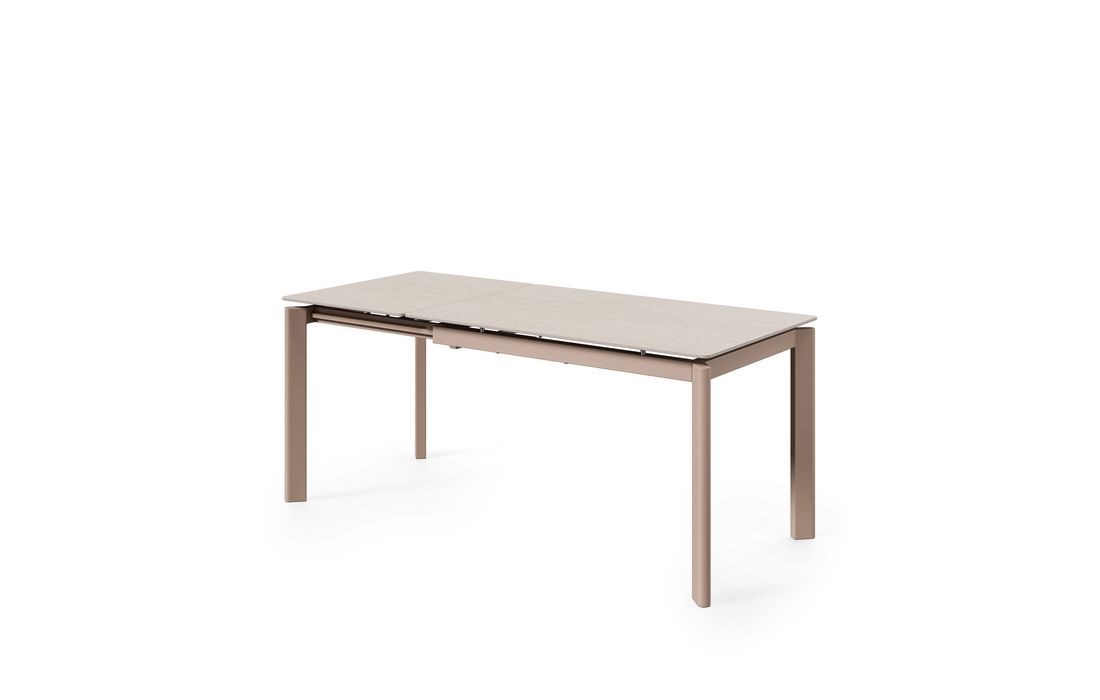 This extendable table combines elegance with modern style.Its porcelain top, available in black, gray, and white, matches its metal legs, also available in a version with beige legs and top. Available in 2 sizes.