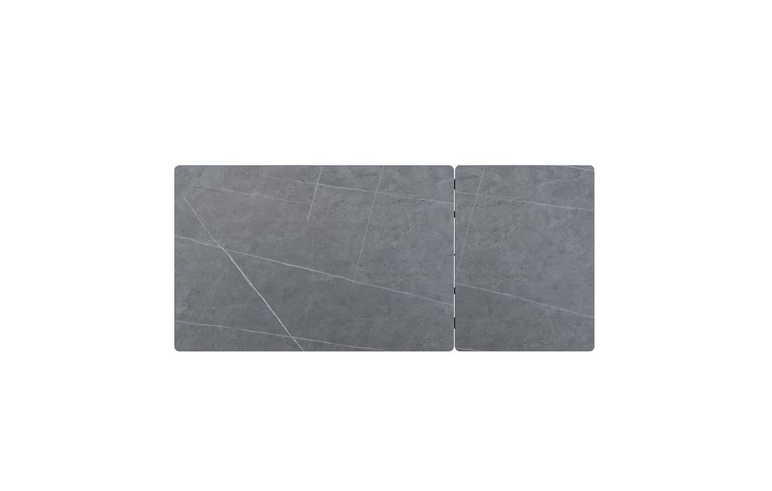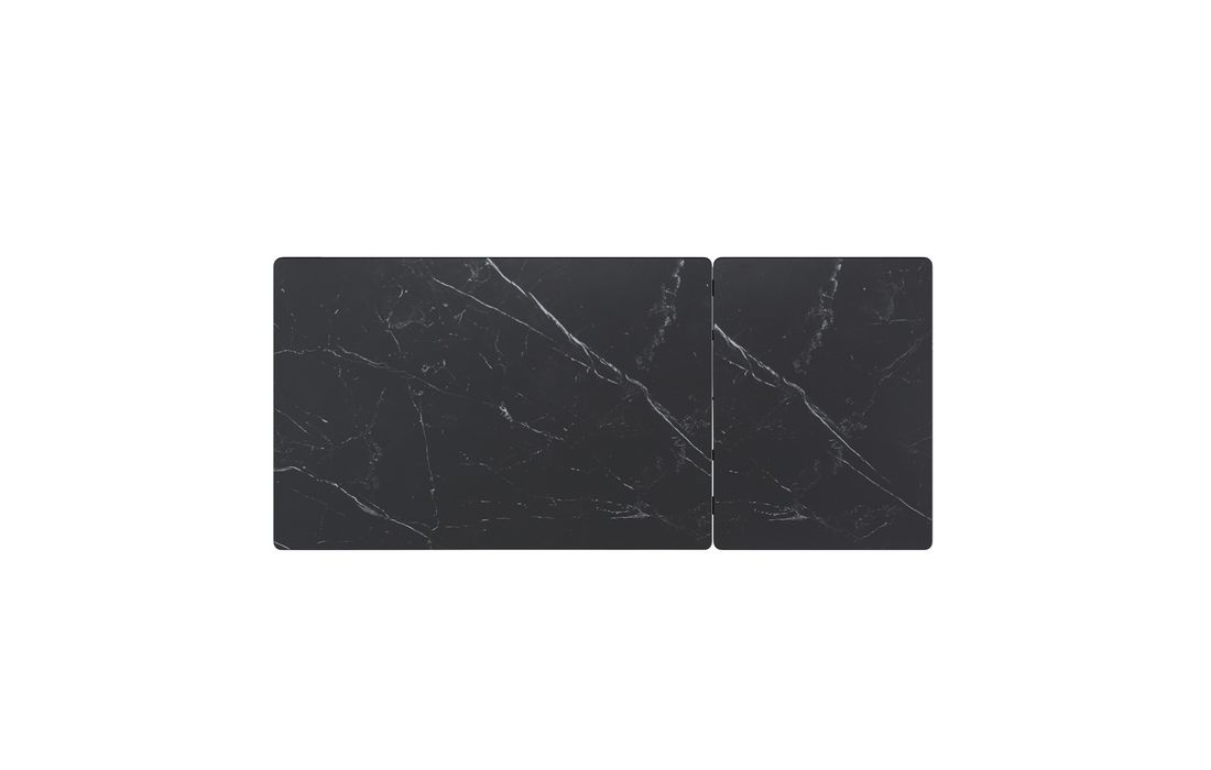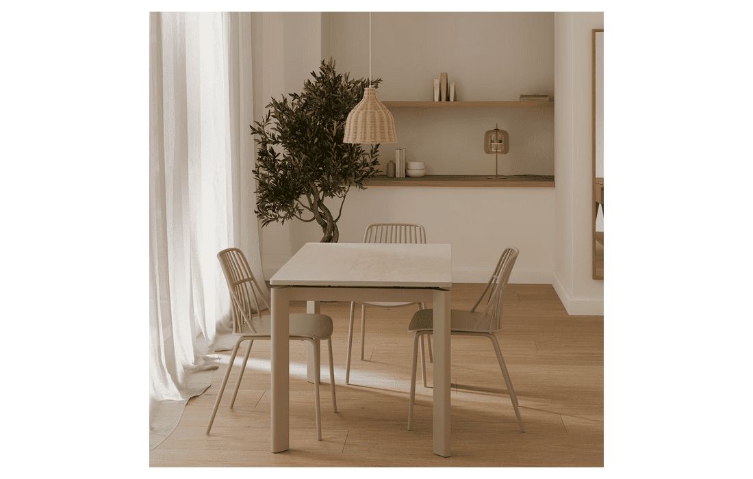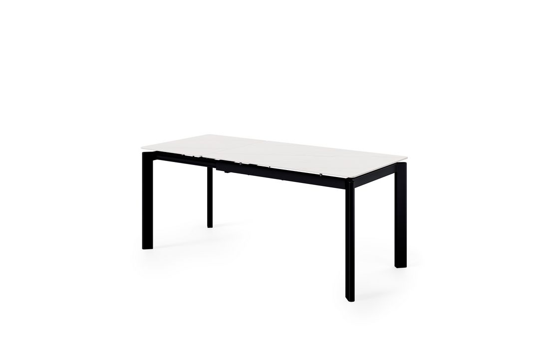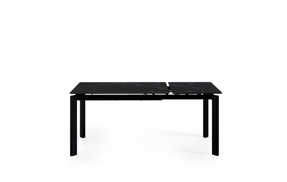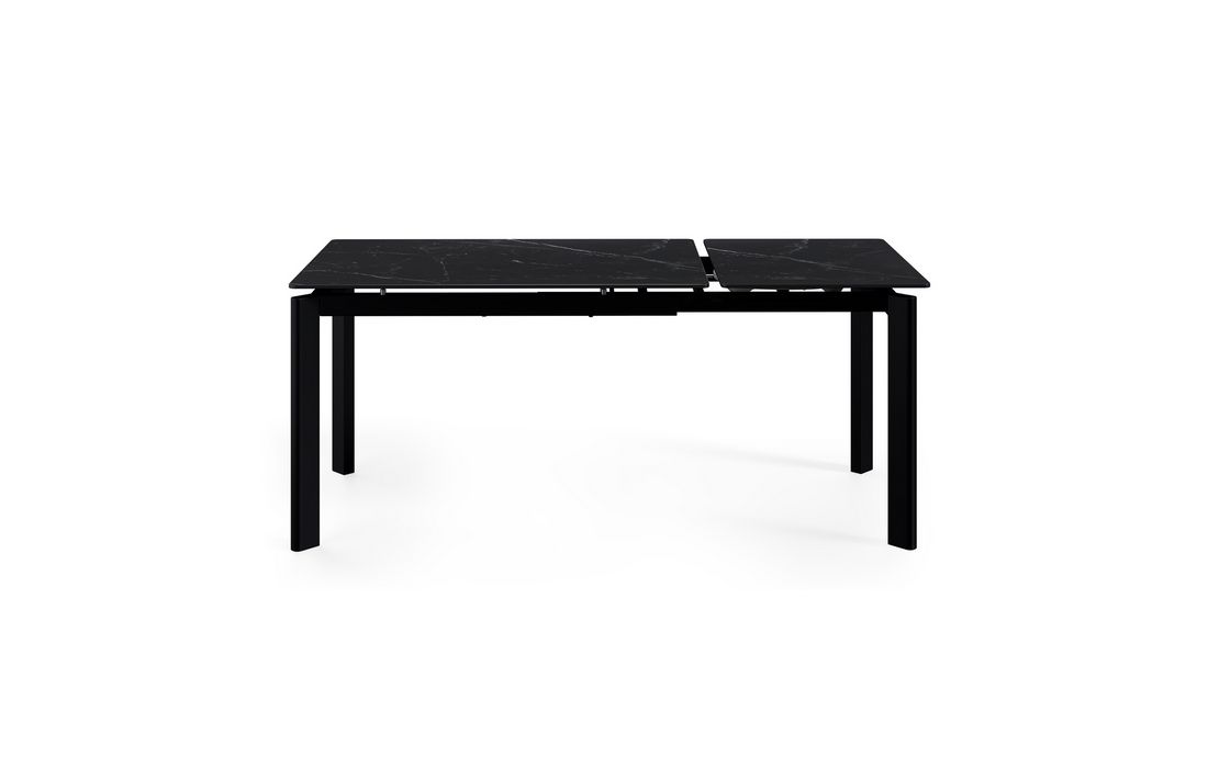 This extendable table combines elegance with modern style.Its porcelain top, available in black, gray, and white, matches its metal legs, also available in a version with beige legs and top. Available in 2 sizes.