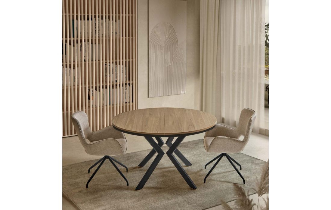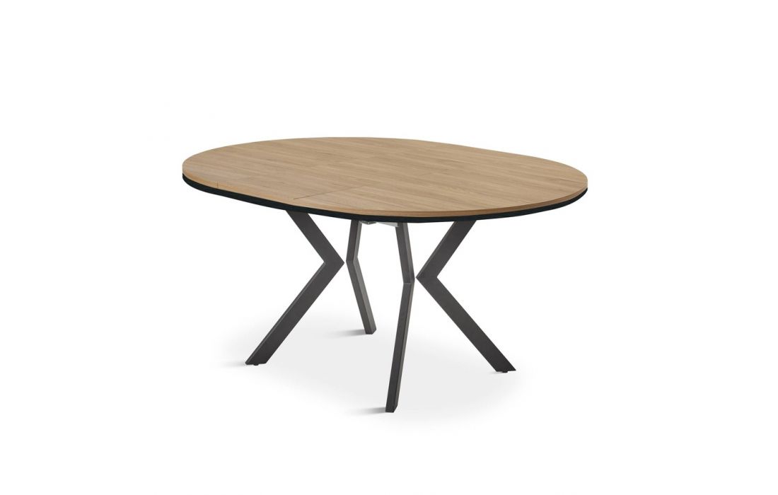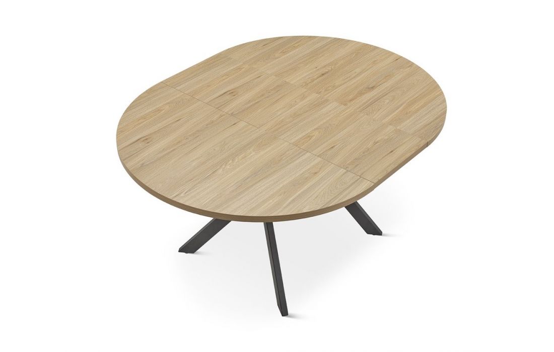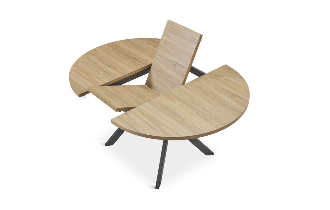 Round extendable table with a durable oak laminate top, suitable for everyday use. Features metal legs for stability and a modern design.