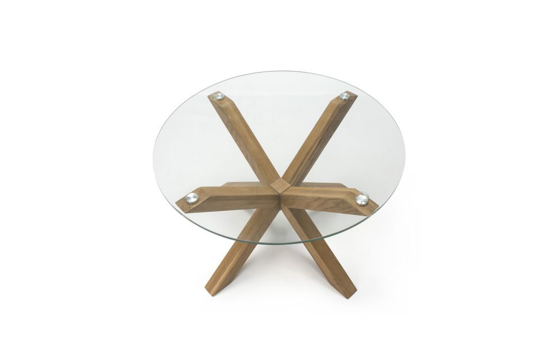 Table with natural wood legs and a round glass top, combining elegance and lightness in a modern design.