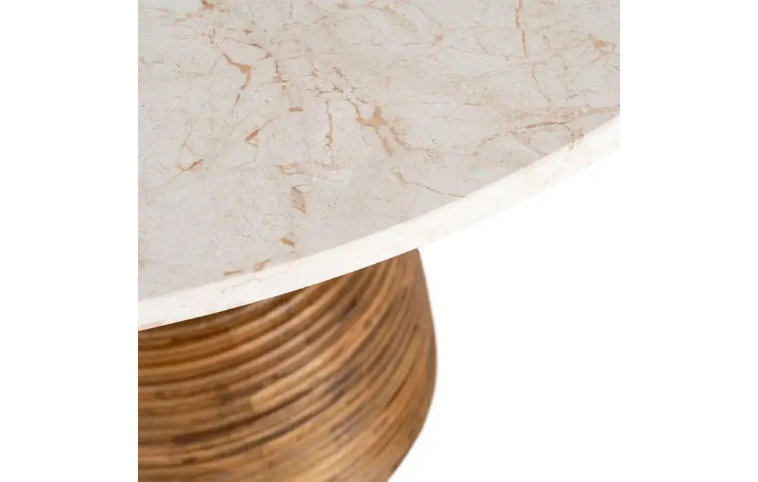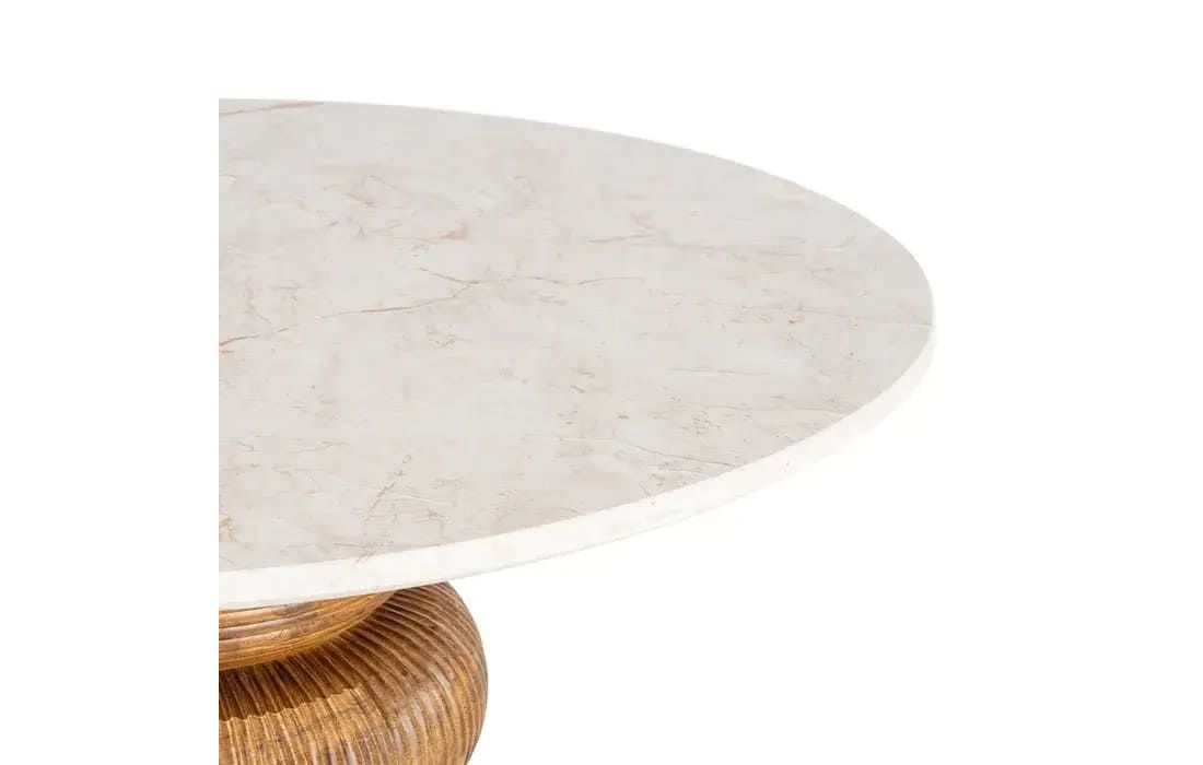 This table combines the natural elegance of marble with the organic warmth of mango wood. The smooth, luminous marble top contrasts harmoniously with the sculptural wooden base, crafted in textured rings that highlight its artisanal character.