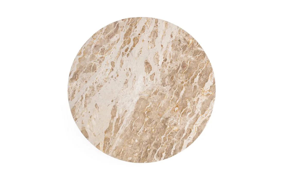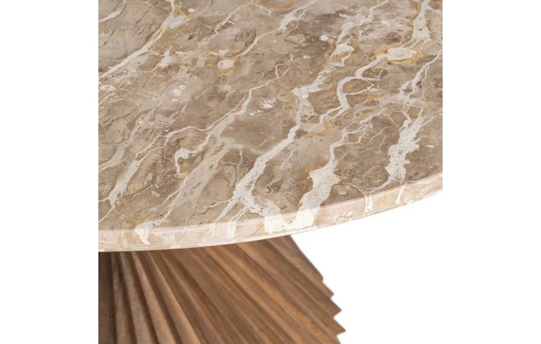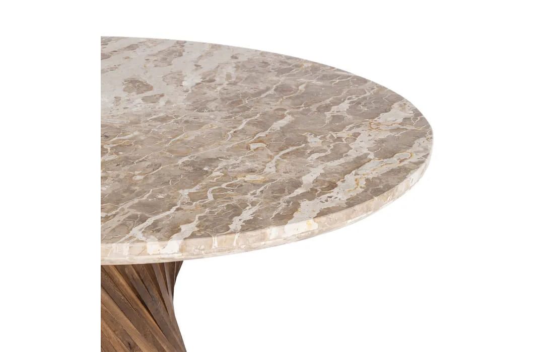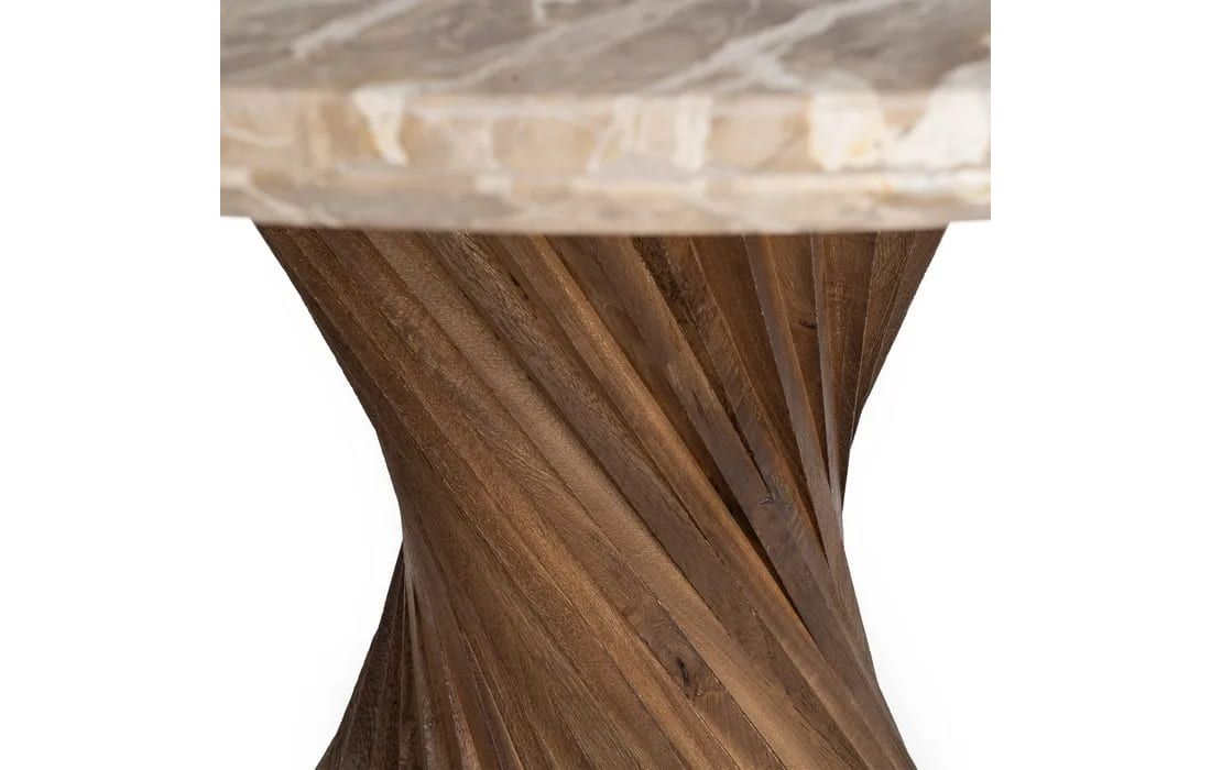 This table is distinguished by its sculptural mango wood base, meticulously crafted with twisted lines that create an elegant helical effect. The marble top, with its soft tone and refined finish, adds a touch of sophistication and luminosity to the piece.