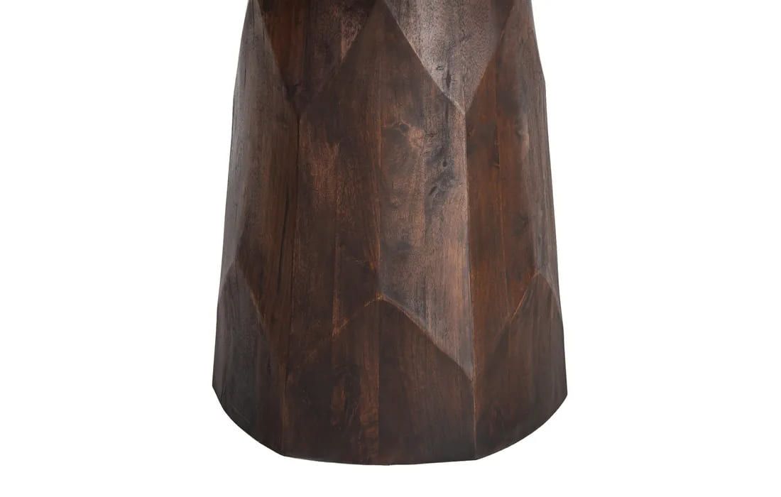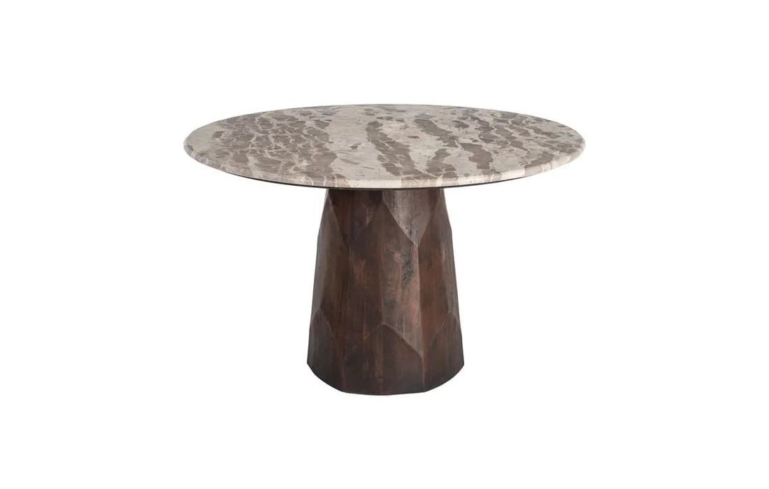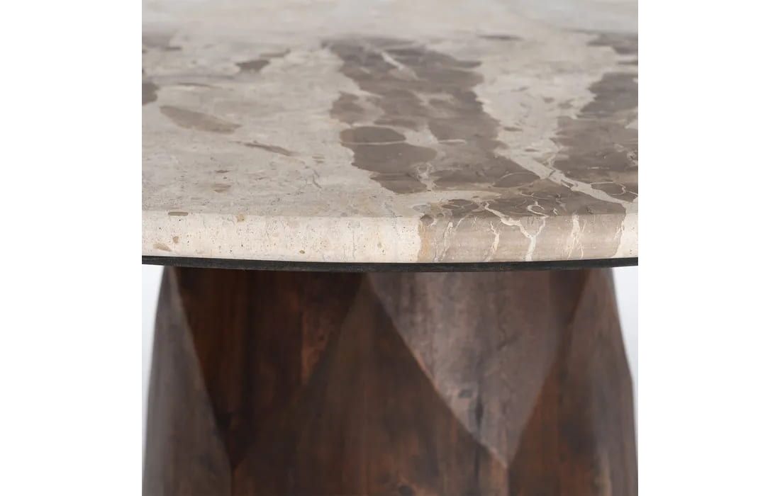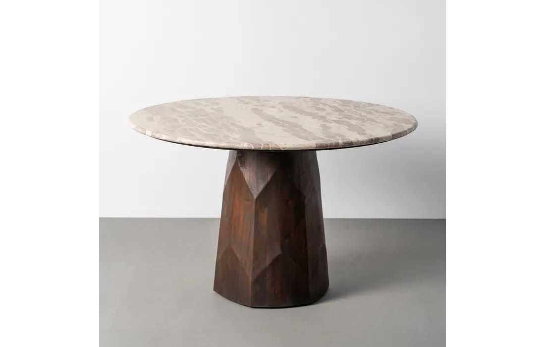 This dining table features a sophisticated design that combines the natural beauty of marble with the authenticity of mango wood. Its round marble top lends elegance and luminosity, while the solid wood base stands out for its natural grain and warm tones.
