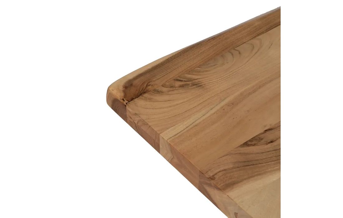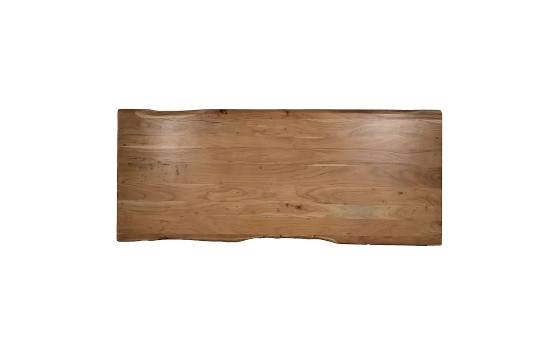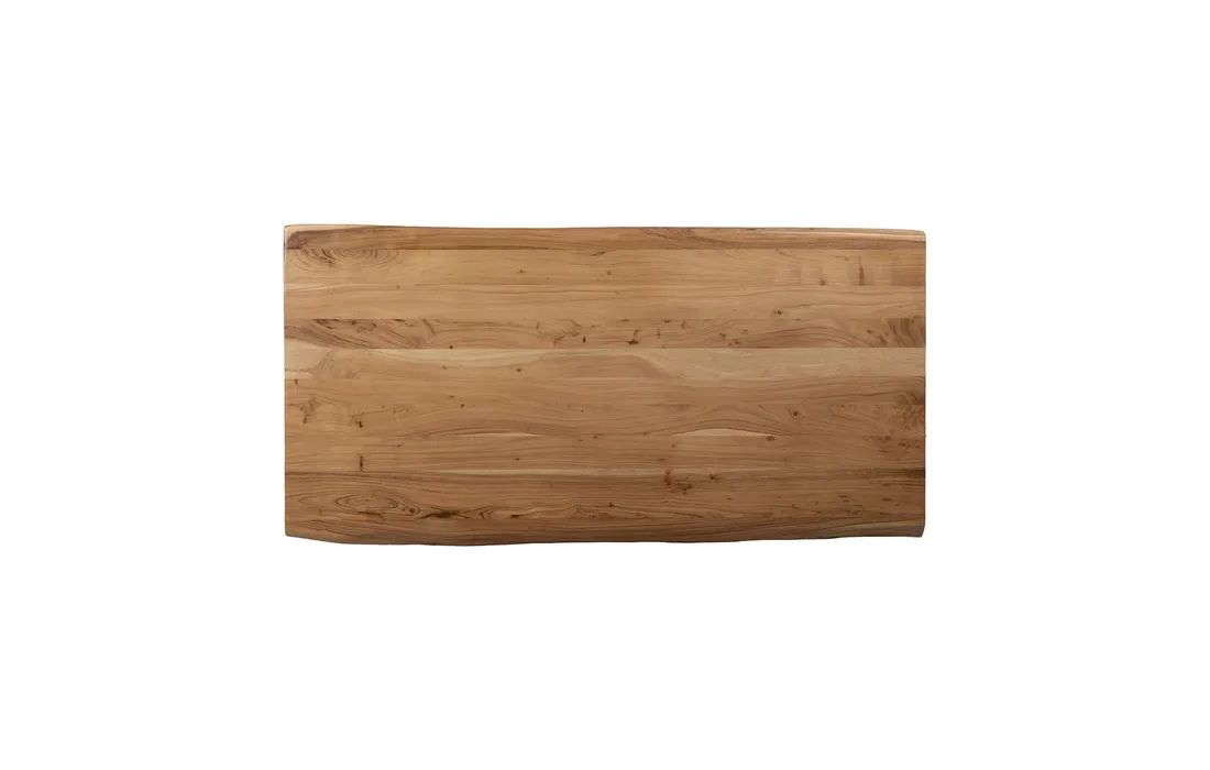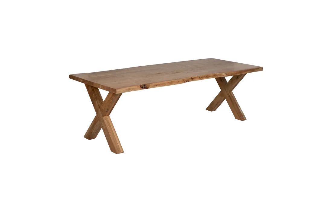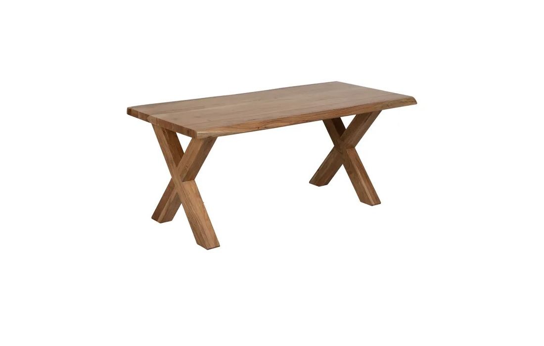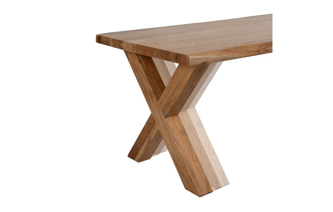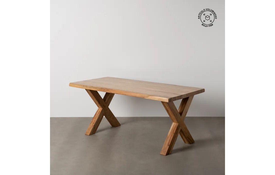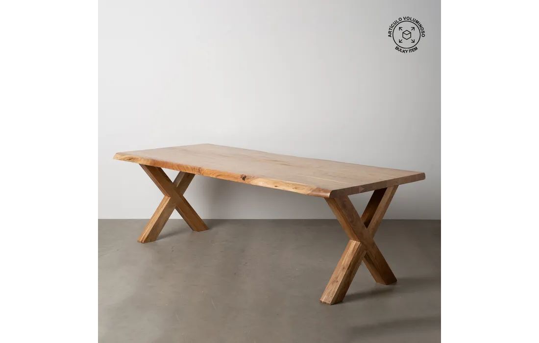 This dining table, Acacia, combines robustness and contemporary design, standing out for its acacia wood frame and "X"-shaped legs, which provide stability and a striking look.