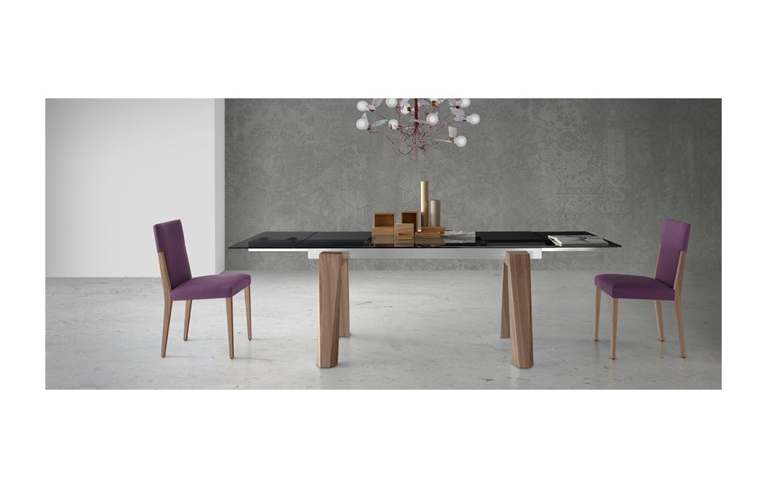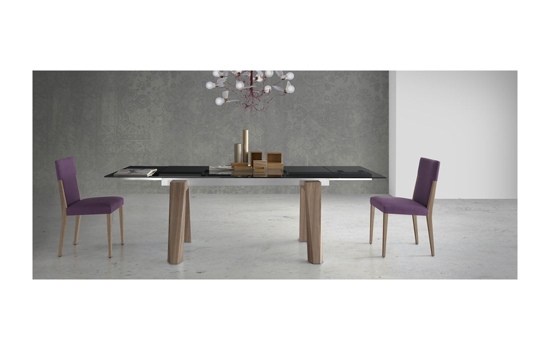Extendable table with top in black glass with legs in beech, oak and walnut or lacquered