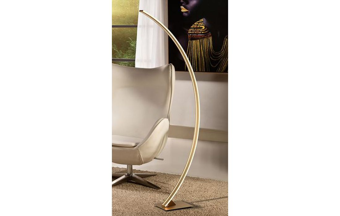 LED light floor lamp, made of metal and aluminum, brushed golden finish. Opal silicone diffuser.