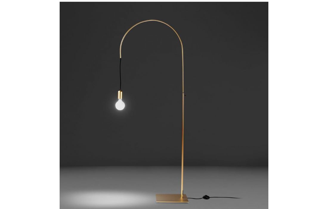 Arc-shaped floor lamp, height adjustable, made of golden stainless steel.