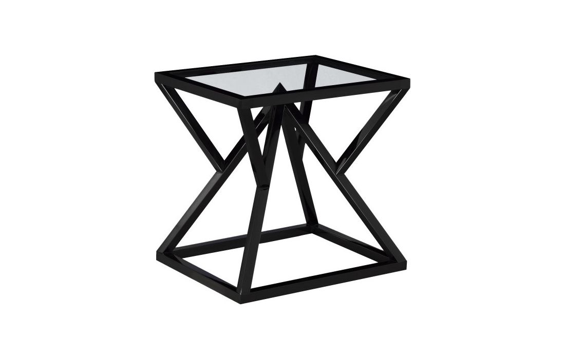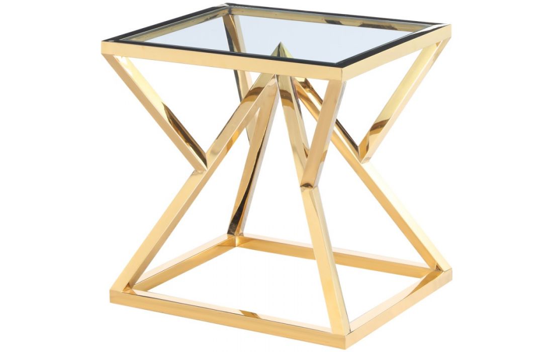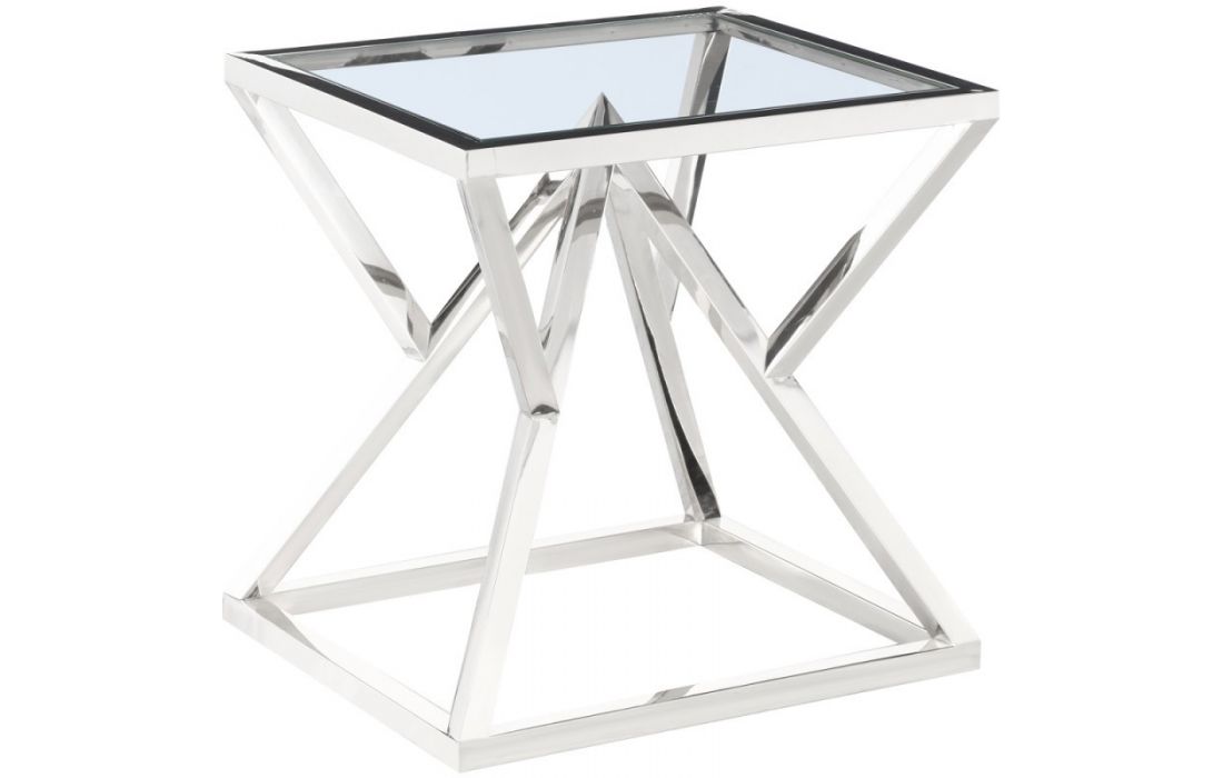 Coffee table with stainless steel and glass top structure.