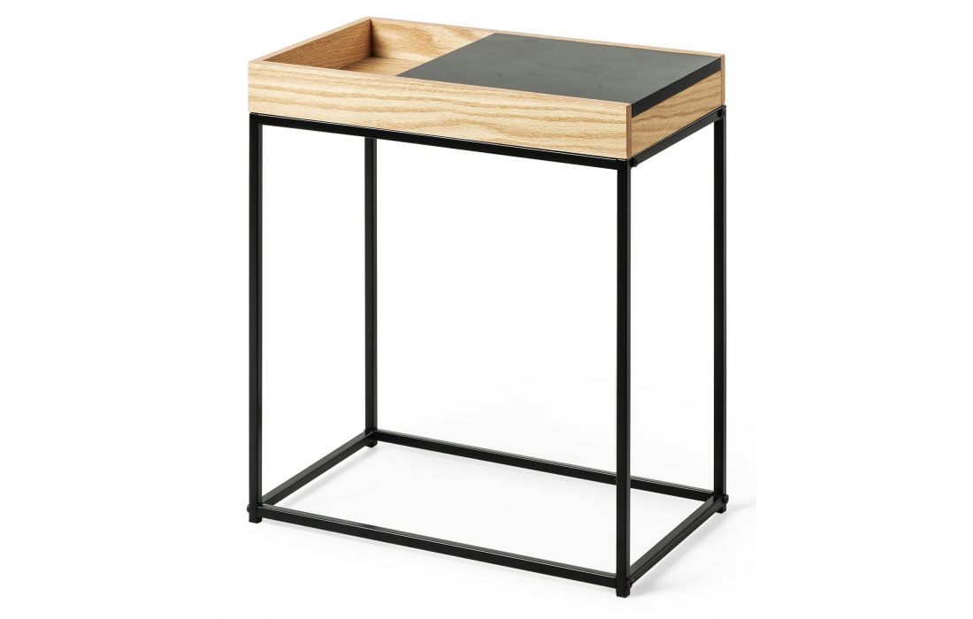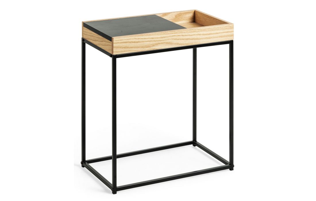 Support table with black metal structure and oak veneer and lacquered sliding top.