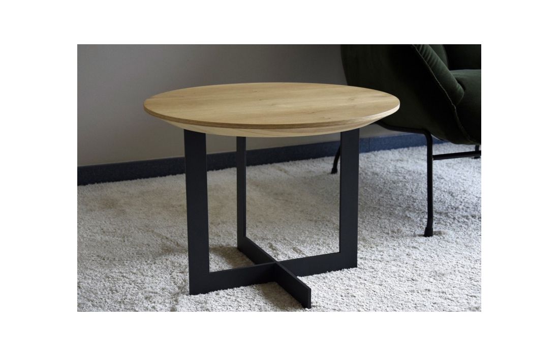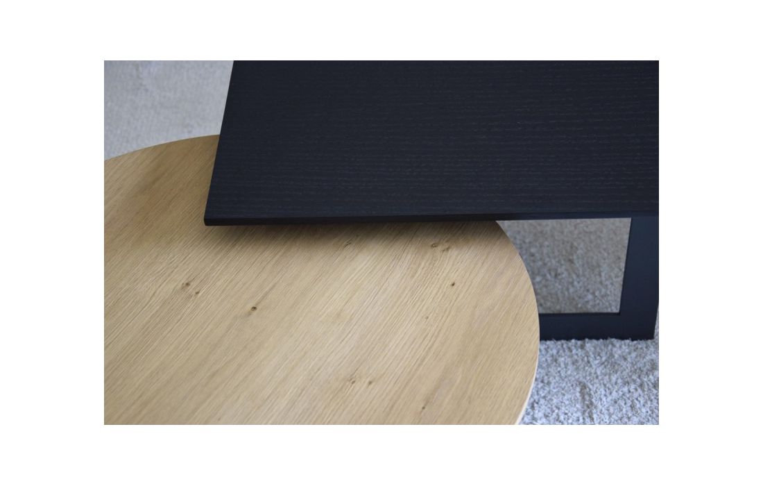 Support table round topped MDF veneered natural oak and structure in graphite matte colored metal.