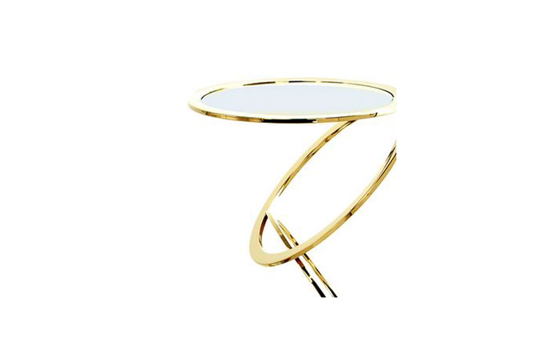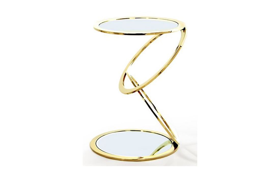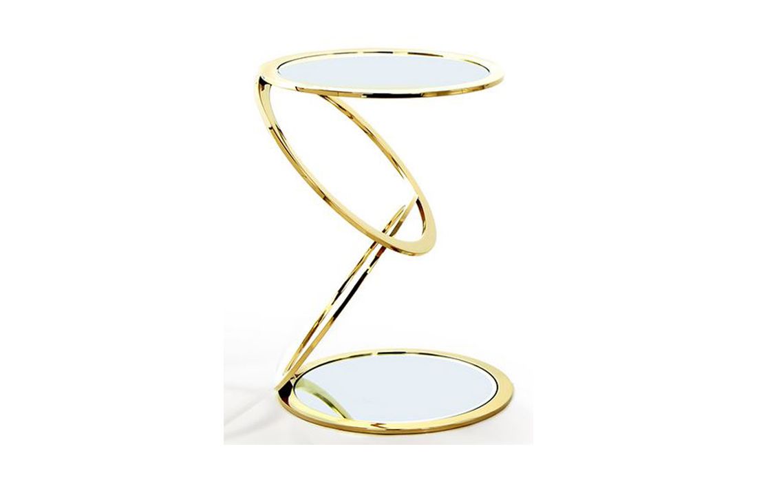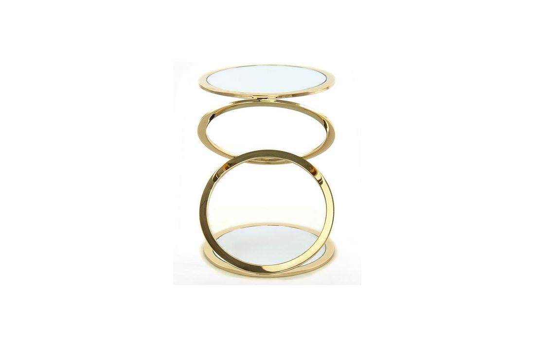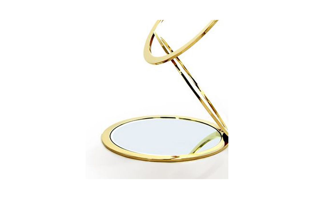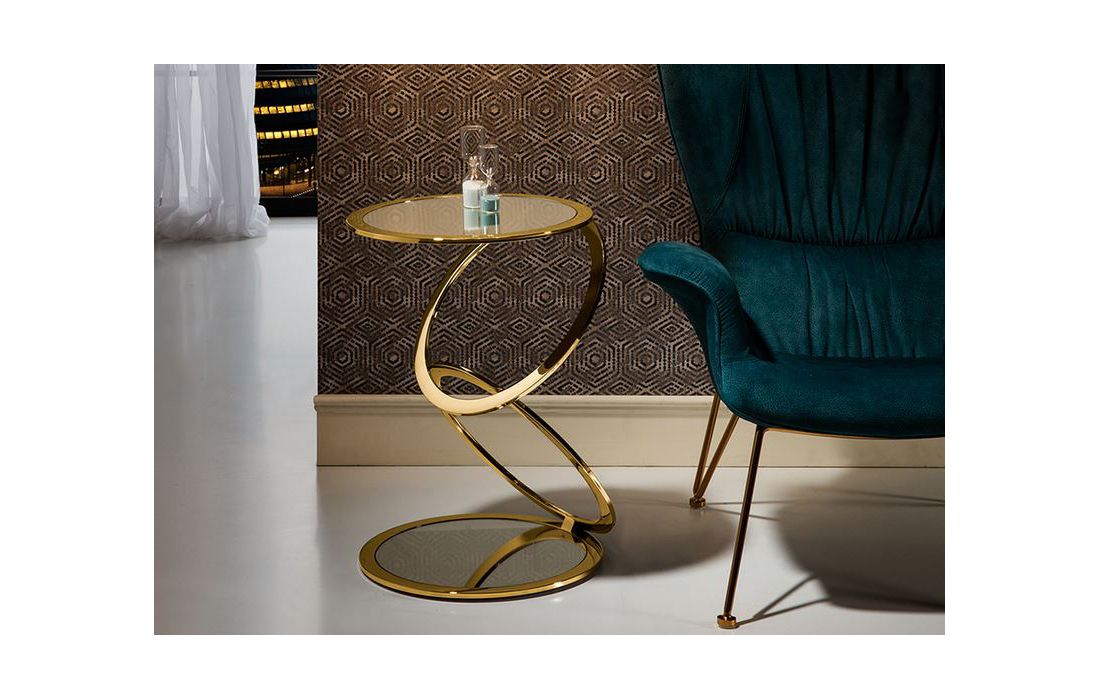 Round support table, made of steel with shiny golden finish. Top and bottom top with 6 mm mirror.