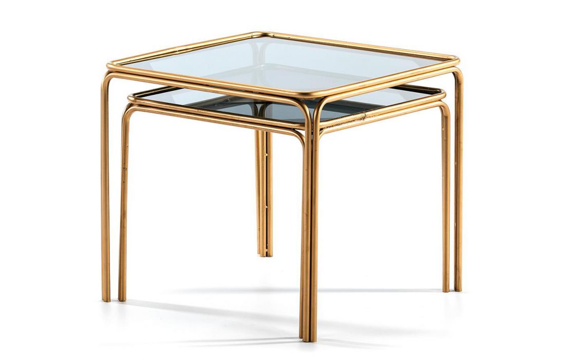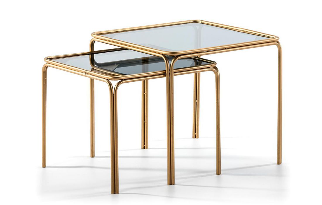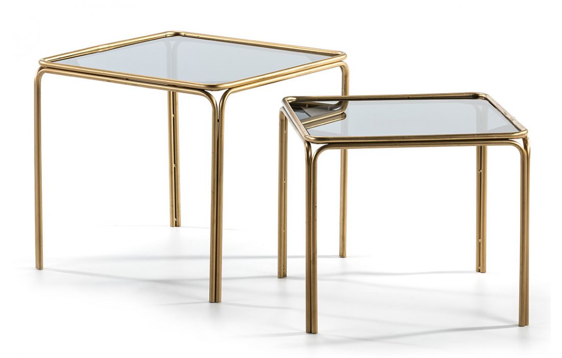 Set of 2 side tables with gilded metal structure and smoked glass top.