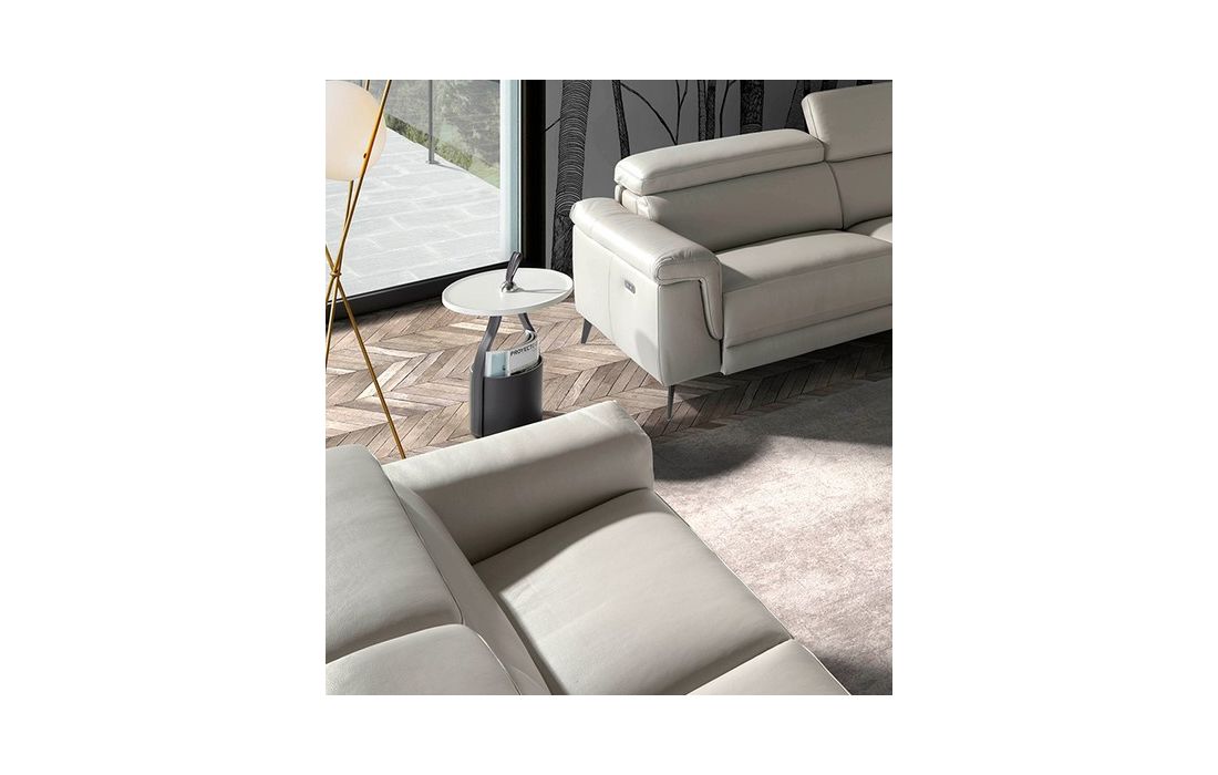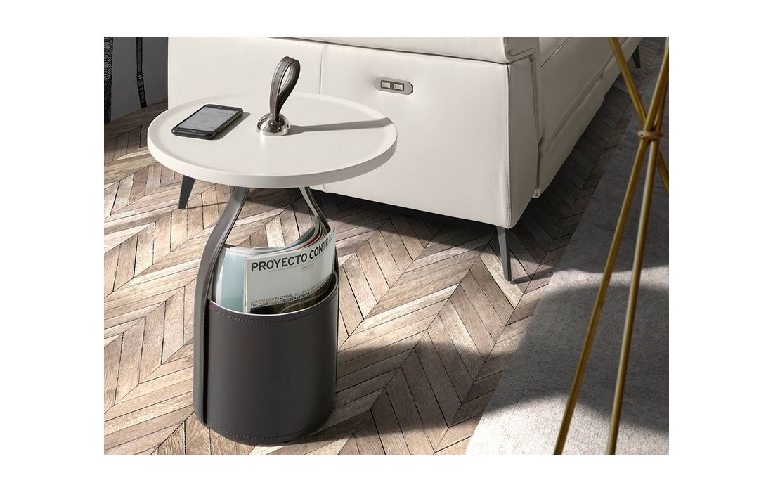 Round support table in sand-colored wood and chocolate brown faux leather base