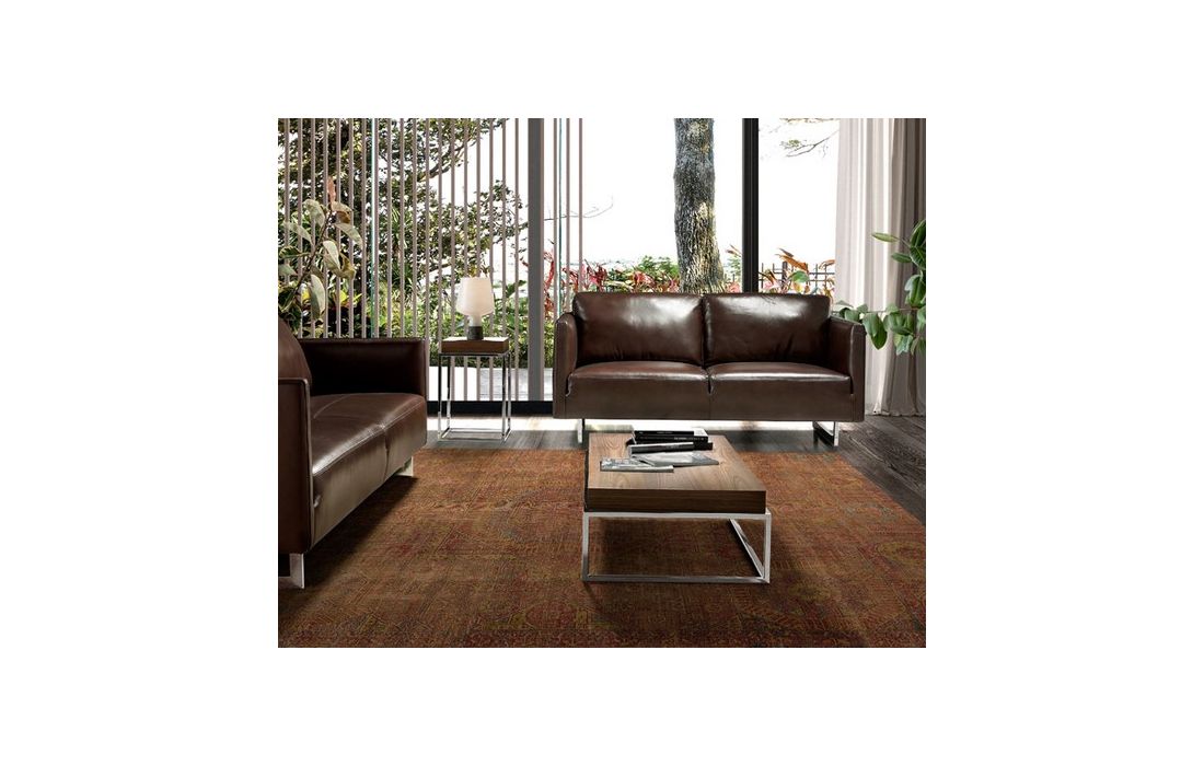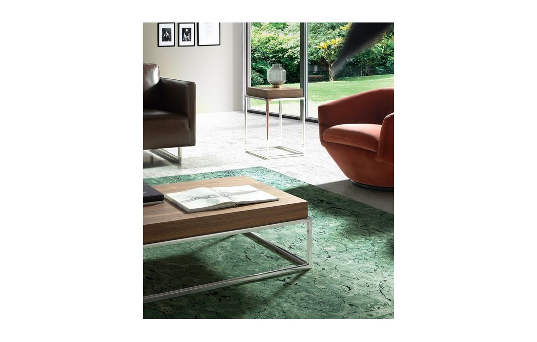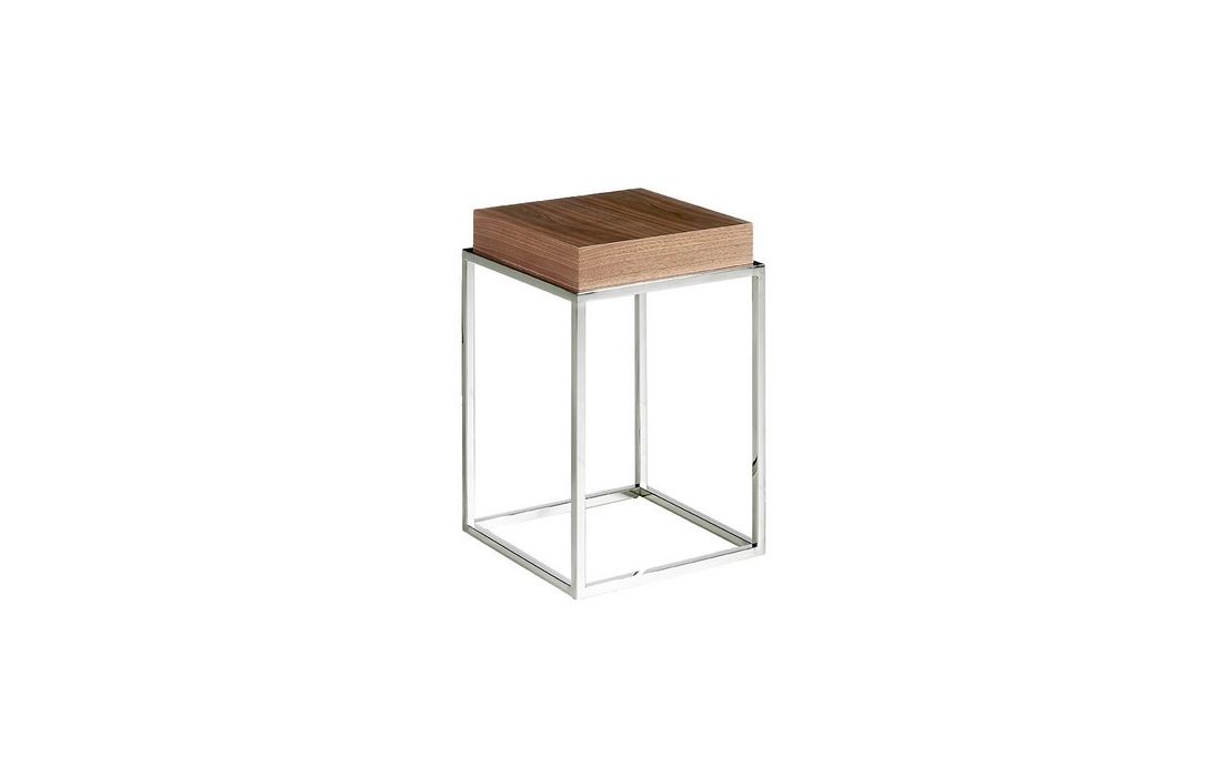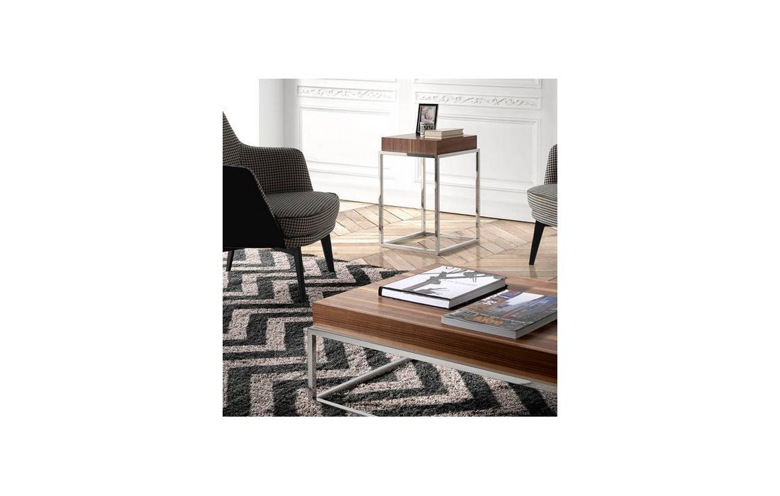 Side table in walnut veneered wood and support structure in chromed stainless steel.