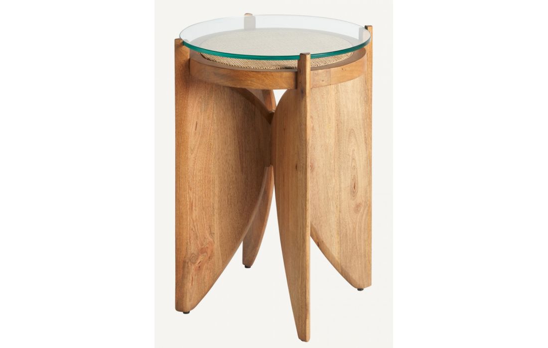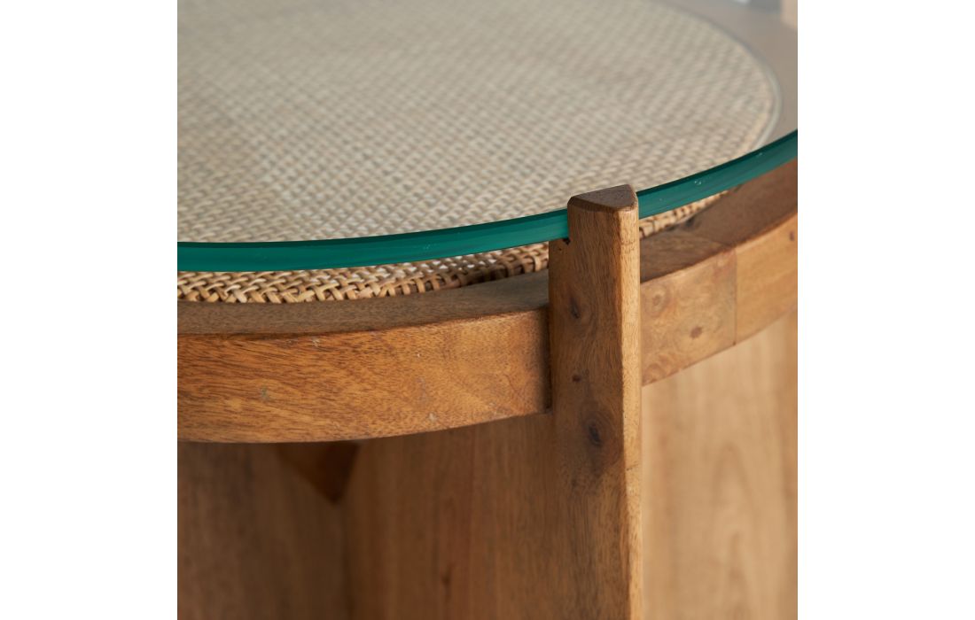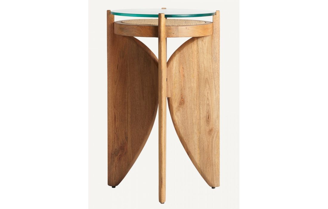 Colonial style support table, made of natural sleeve wood and ratan top and glass