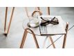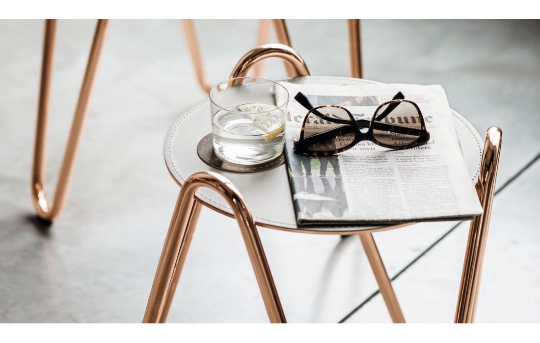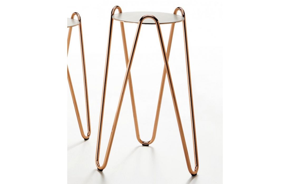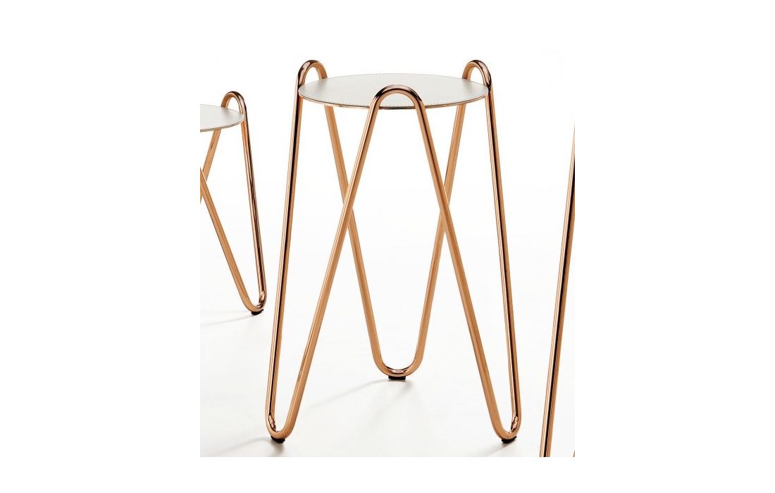 Side table with structure in matt or glossy lacquered metal. Top in ceramic or upholstered in leather.