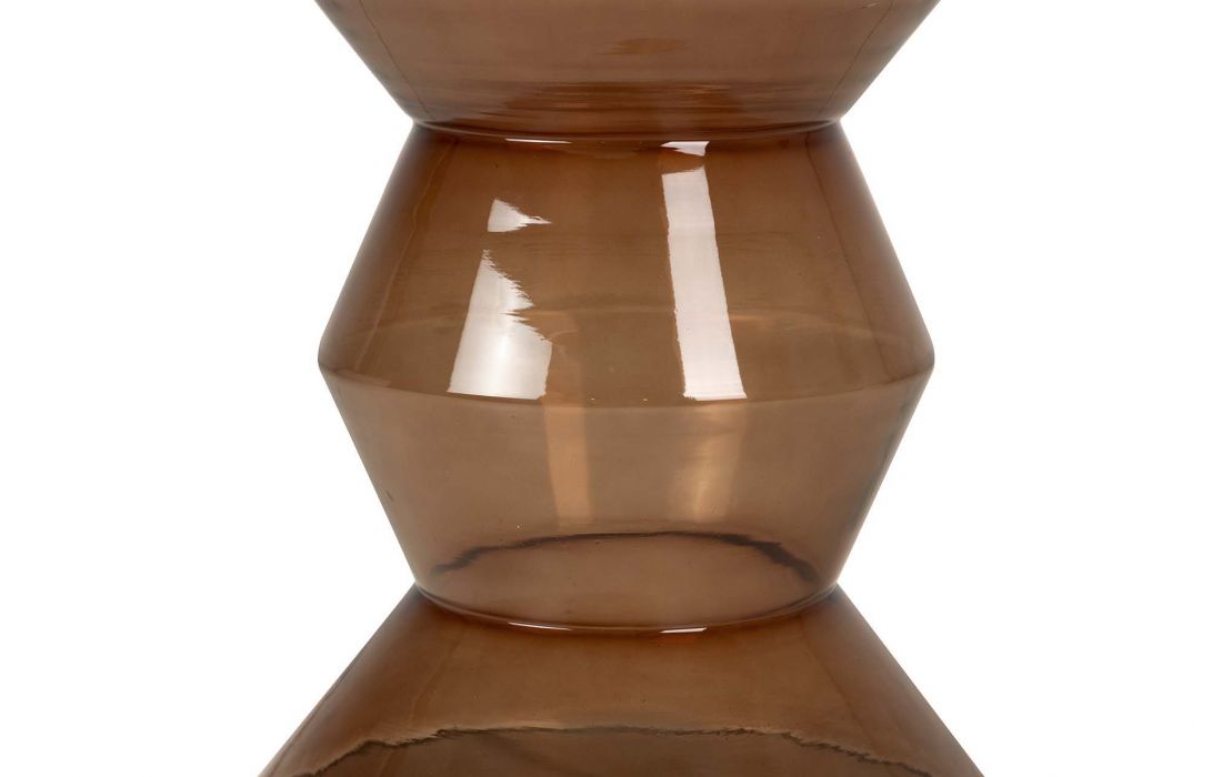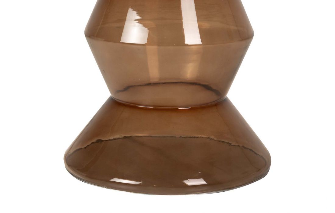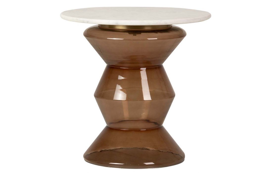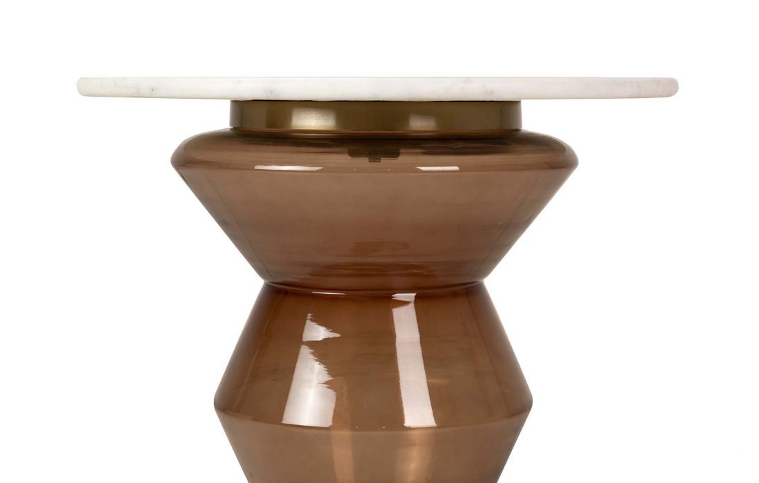 Round support table with glass and metal structure in brown/gold color with white marble top