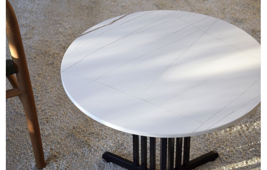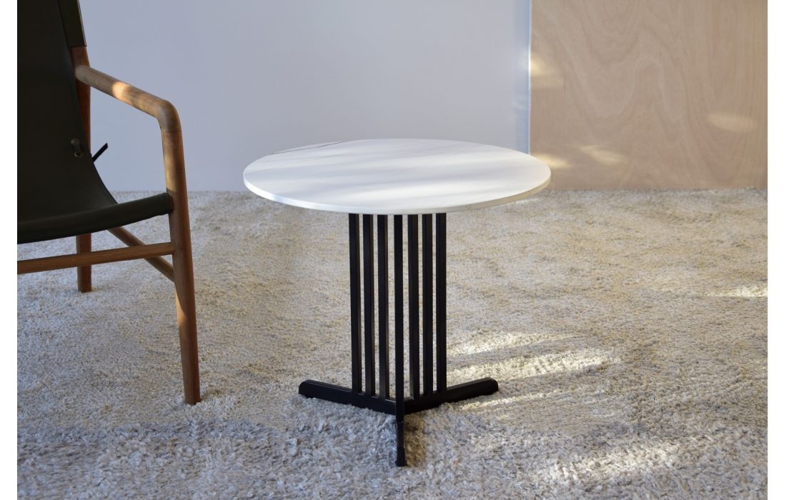 Side table with stone top and metal legs.