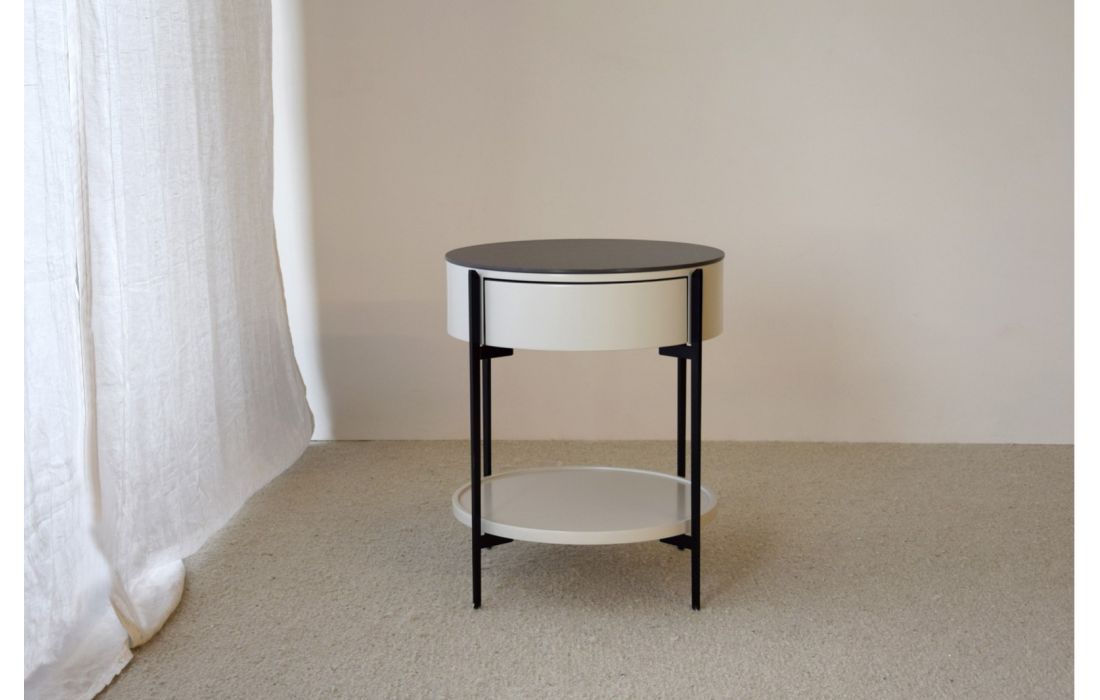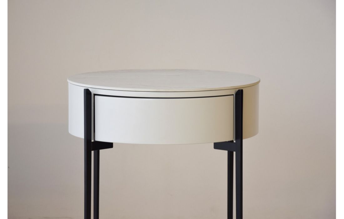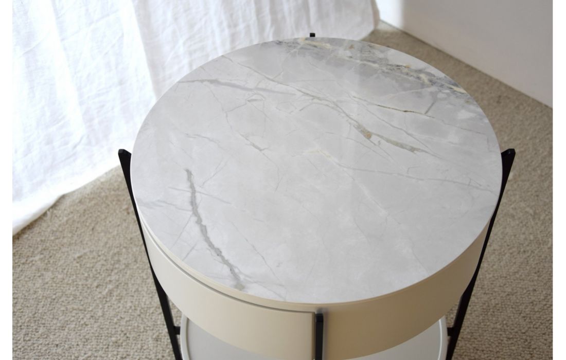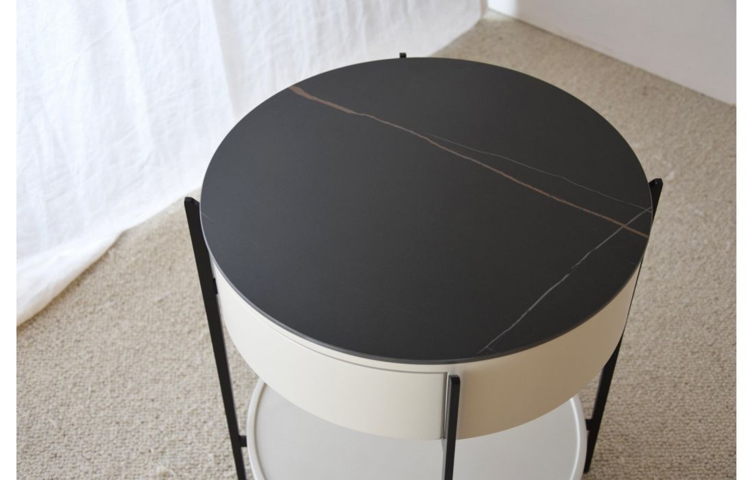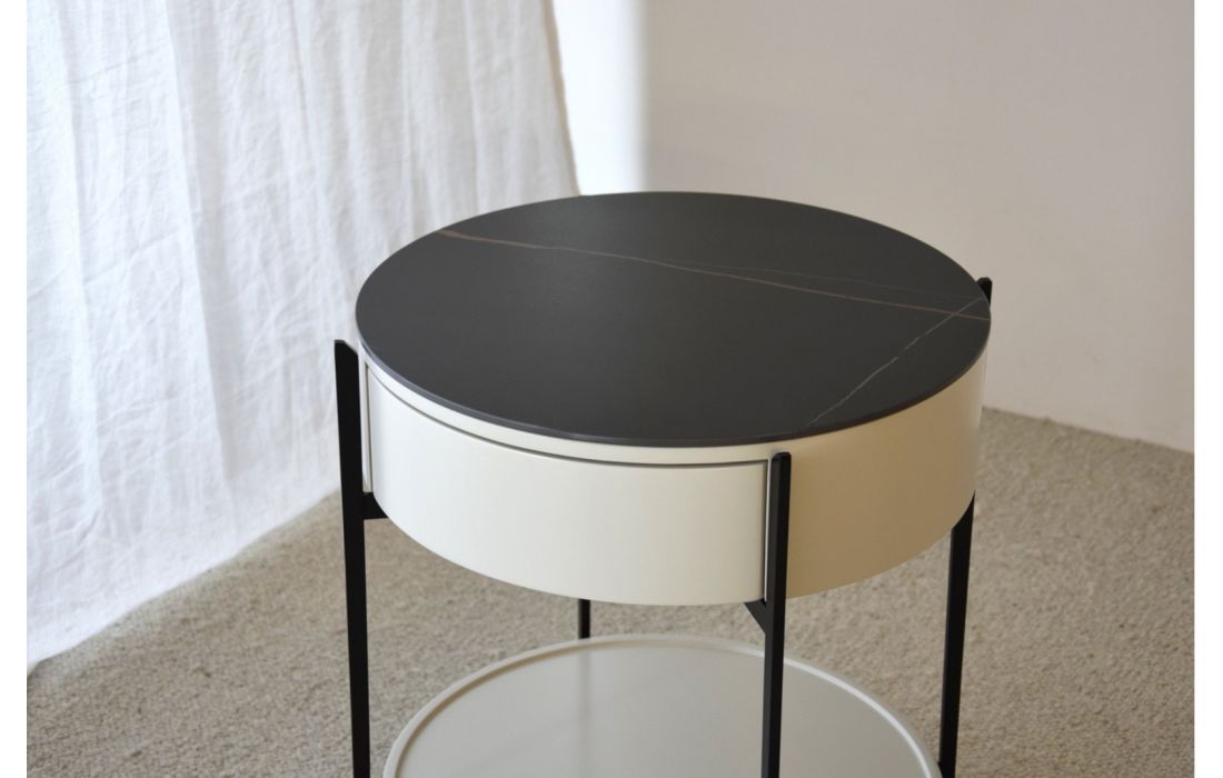 Side table with ceramic and stone top, lacquered at the bottom. Metal legs with 1 drawer.Recipient :