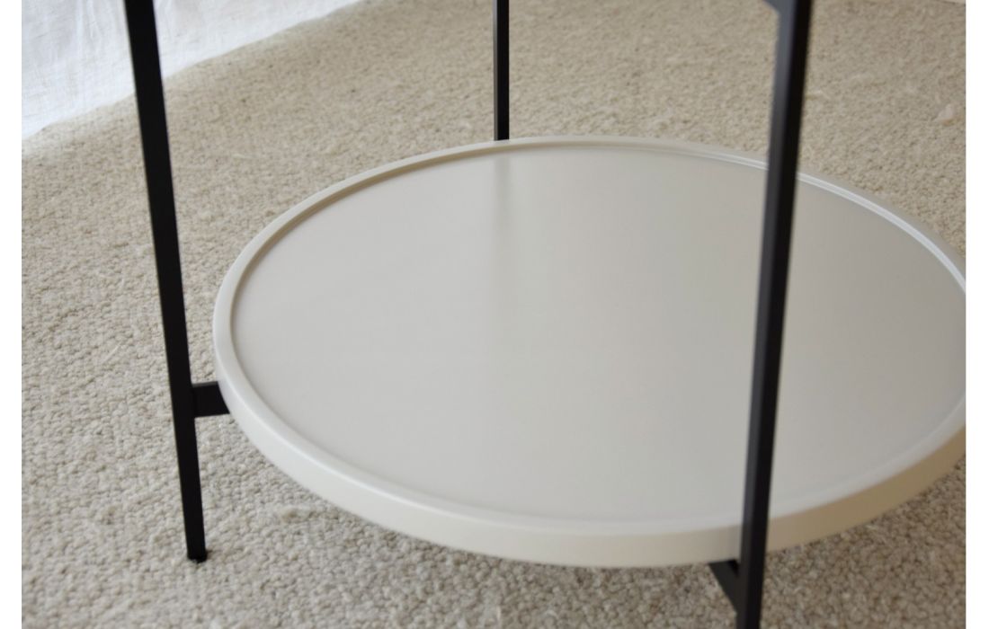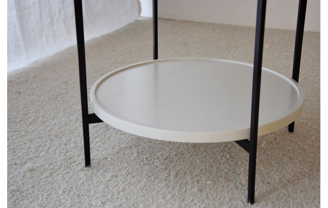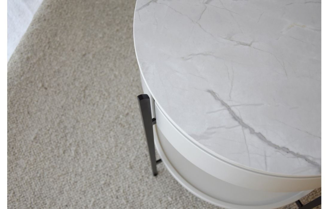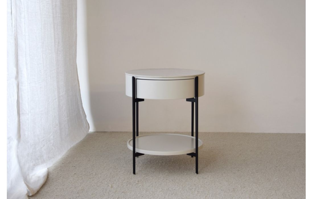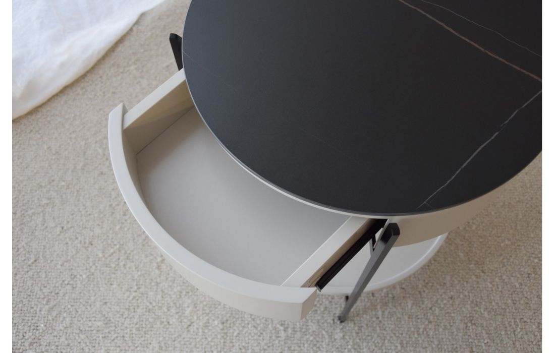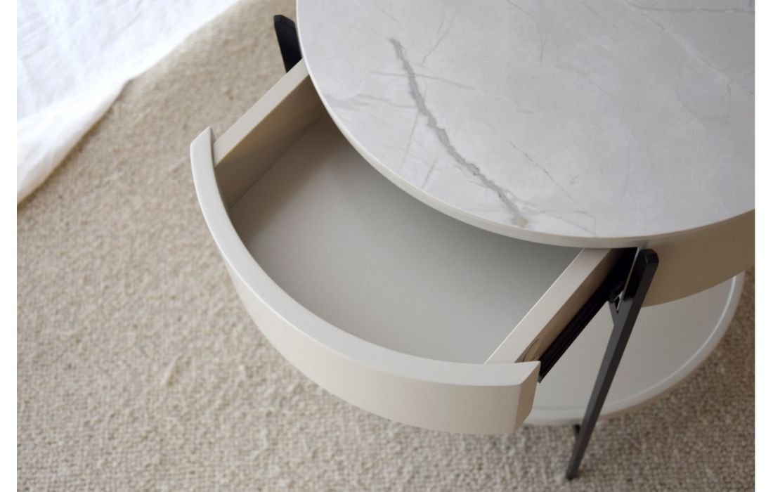 Side table with ceramic and stone top, lacquered at the bottom. Metal legs with 1 drawer.Recipient :