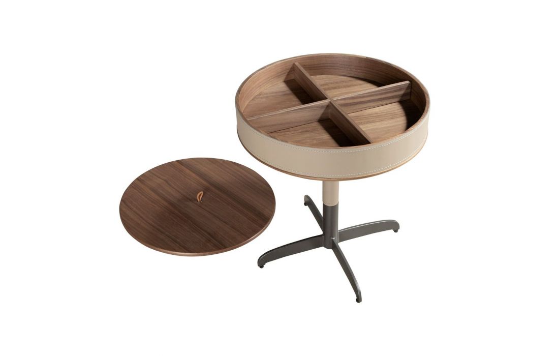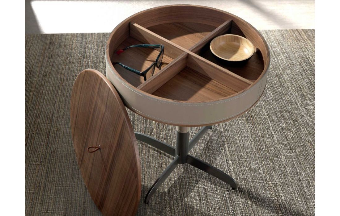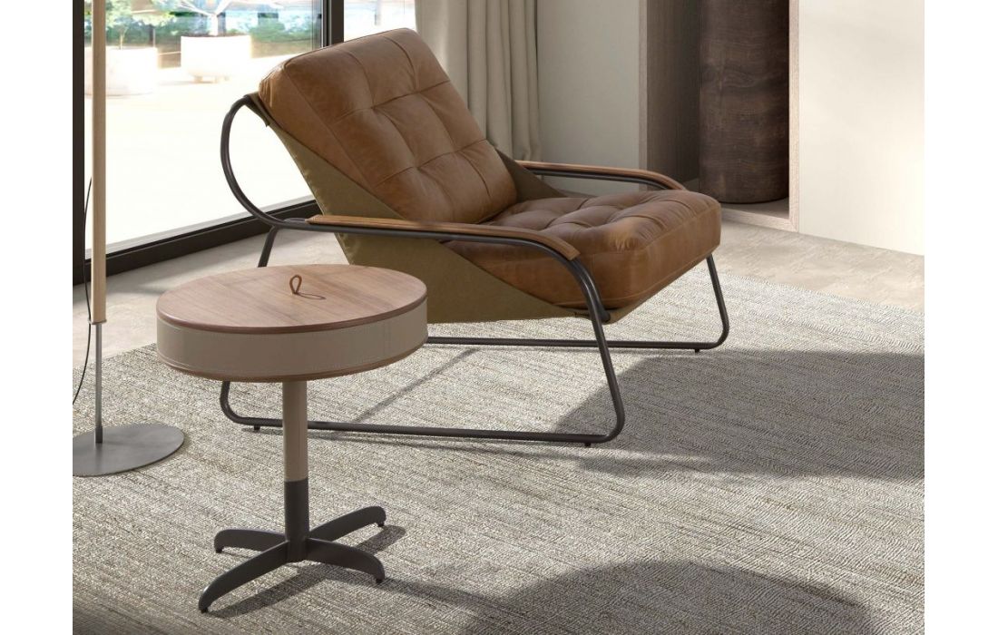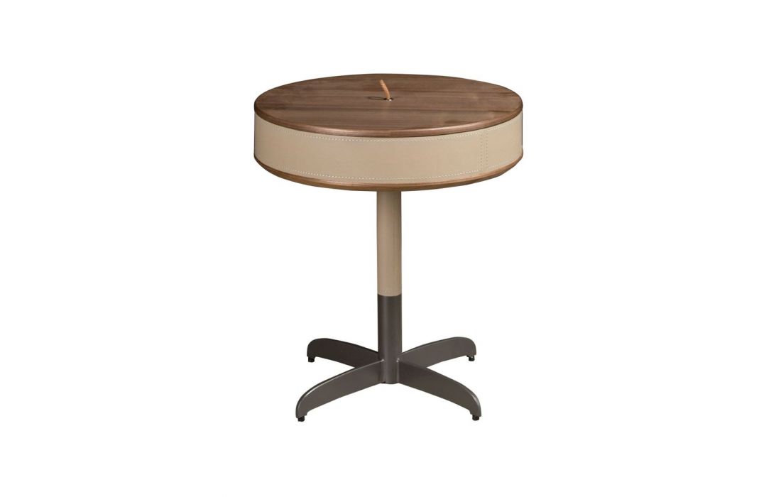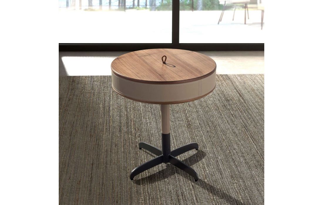 Modern round side table with natural walnut MDF top and stainless steel legs, combined with elegant cowhide upholsteryRecipient :
